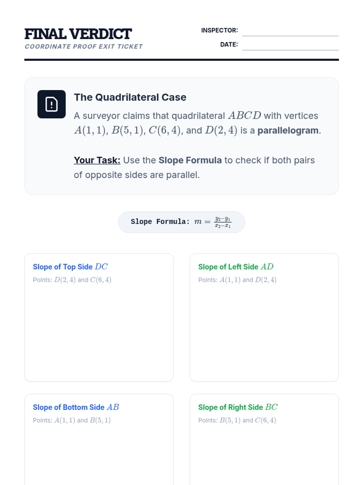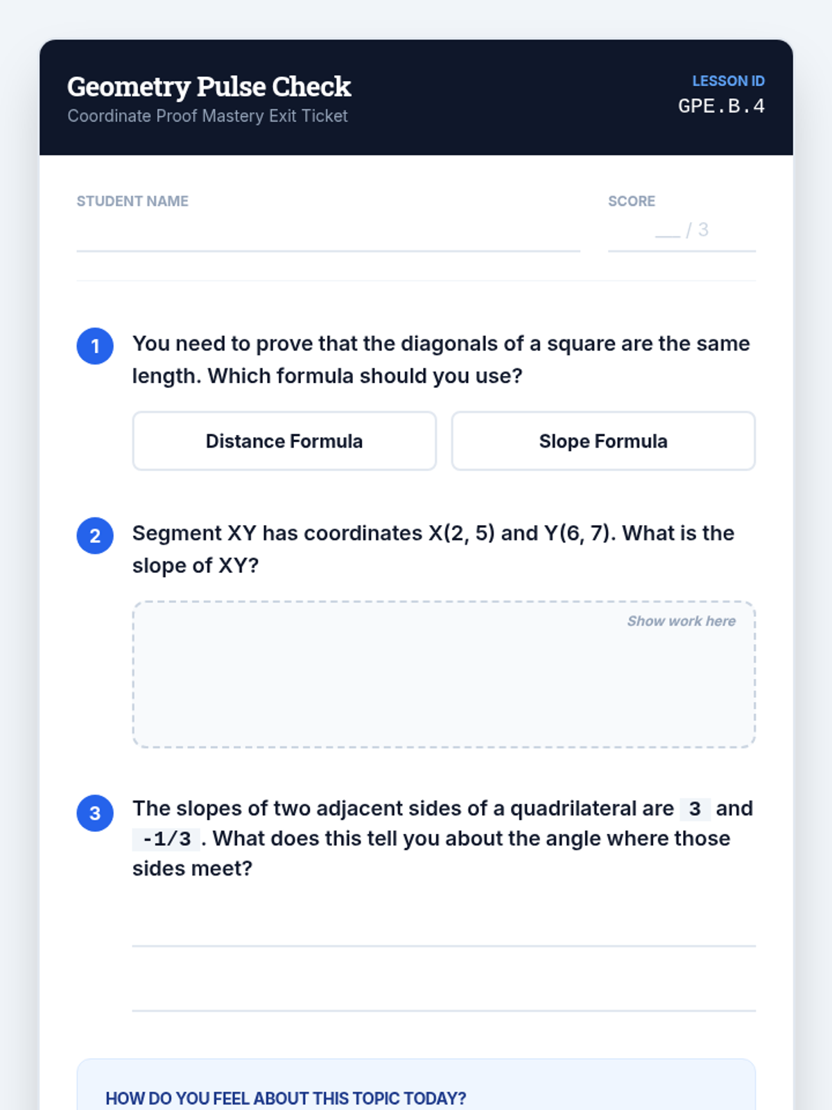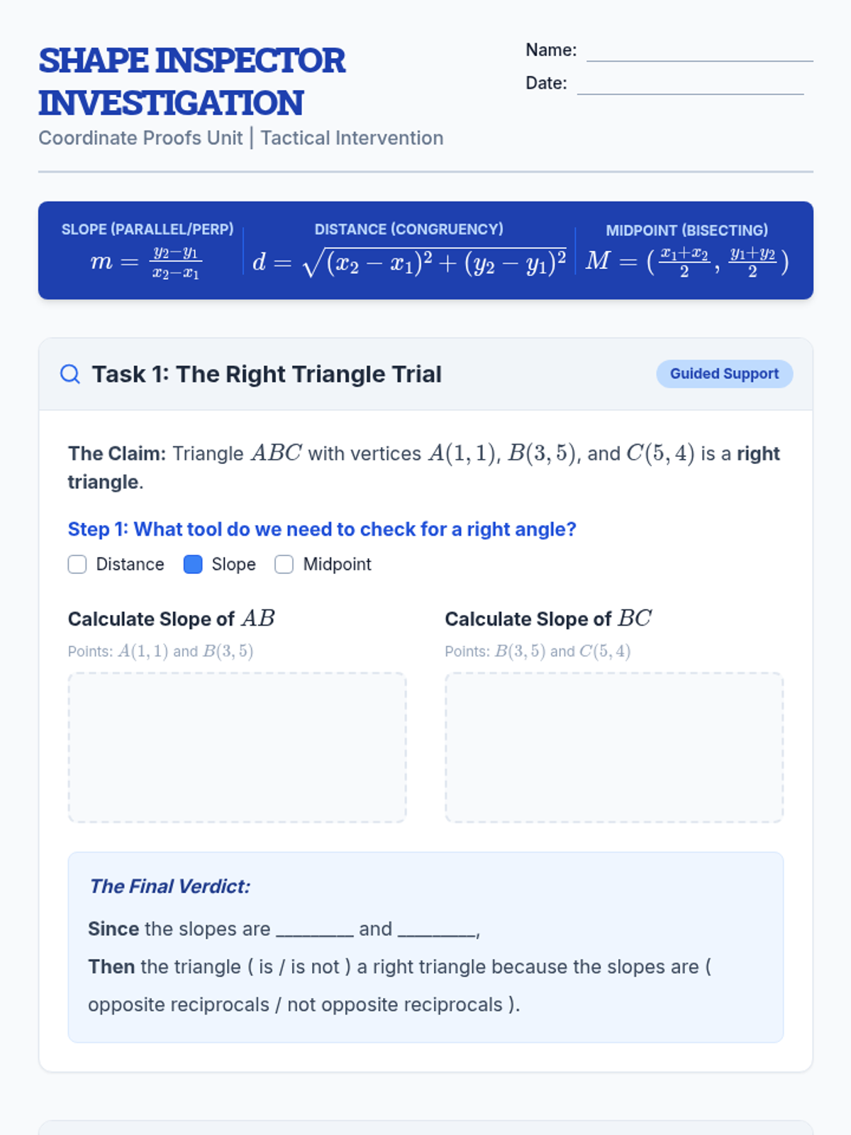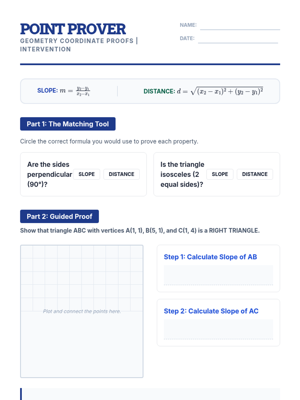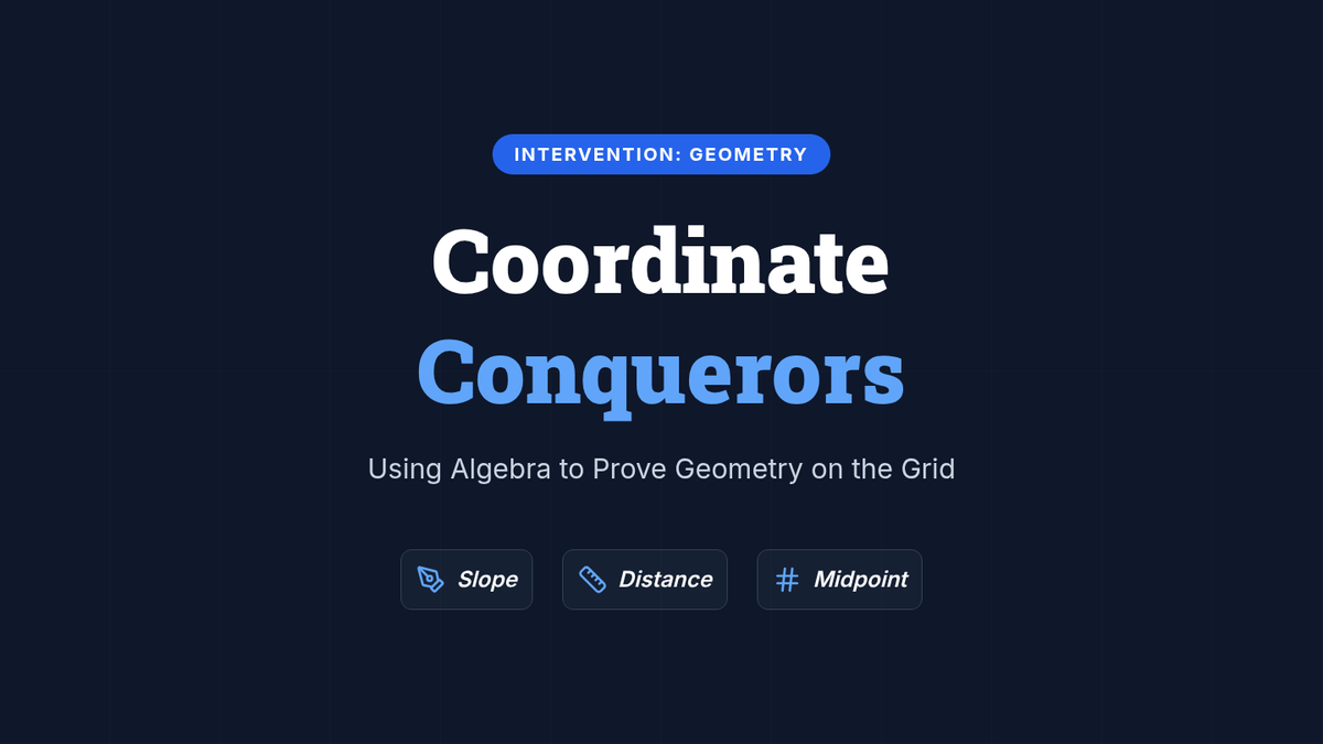 A Tier 2 intervention lesson focused on using coordinates to prove geometric properties. Students will use slope, midpoint, and distance formulas to verify claims about triangles and quadrilaterals through scaffolded investigations.