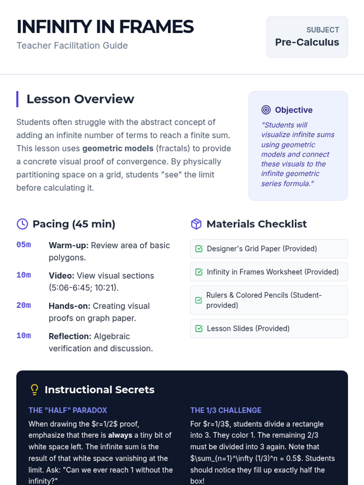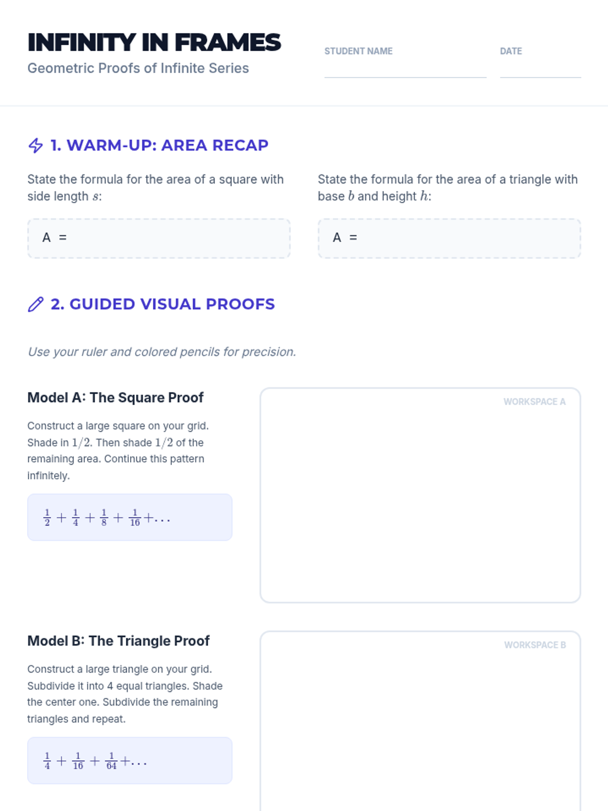 A Pre-Calculus lesson where students explore infinite geometric series through geometric models and visual proofs, transitioning from physical drawings to algebraic formulas.