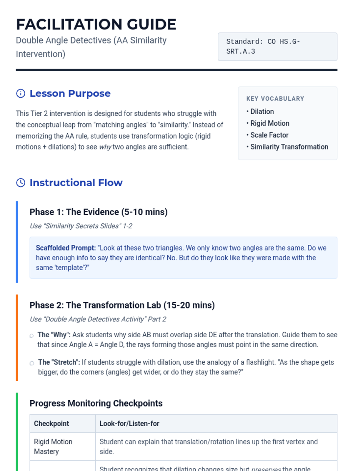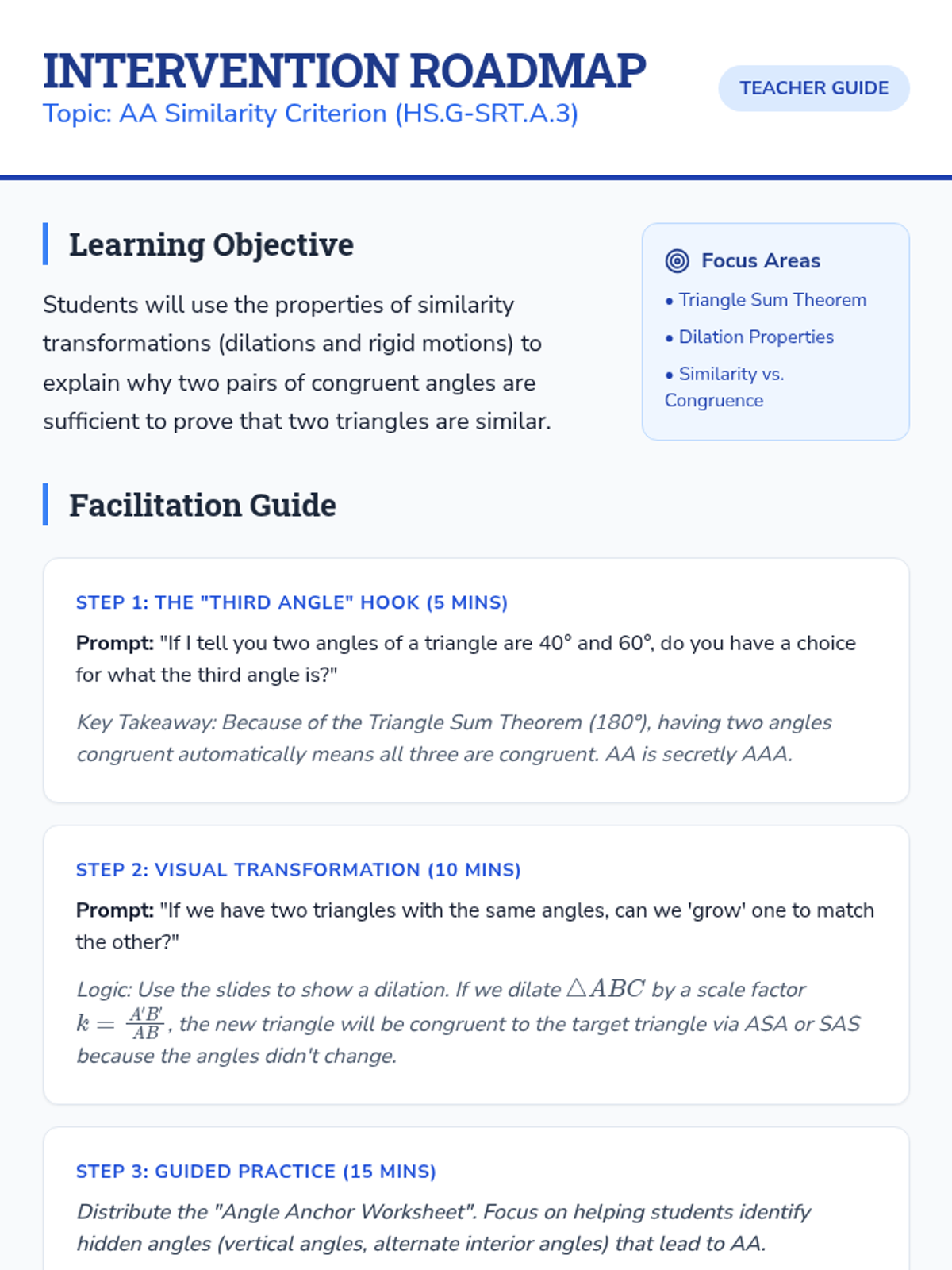 A targeted intervention lesson focused on the AA Similarity Criterion, using transformation-based reasoning and visual proofs to help Tier 2 learners understand why two angles are sufficient to prove triangle similarity.