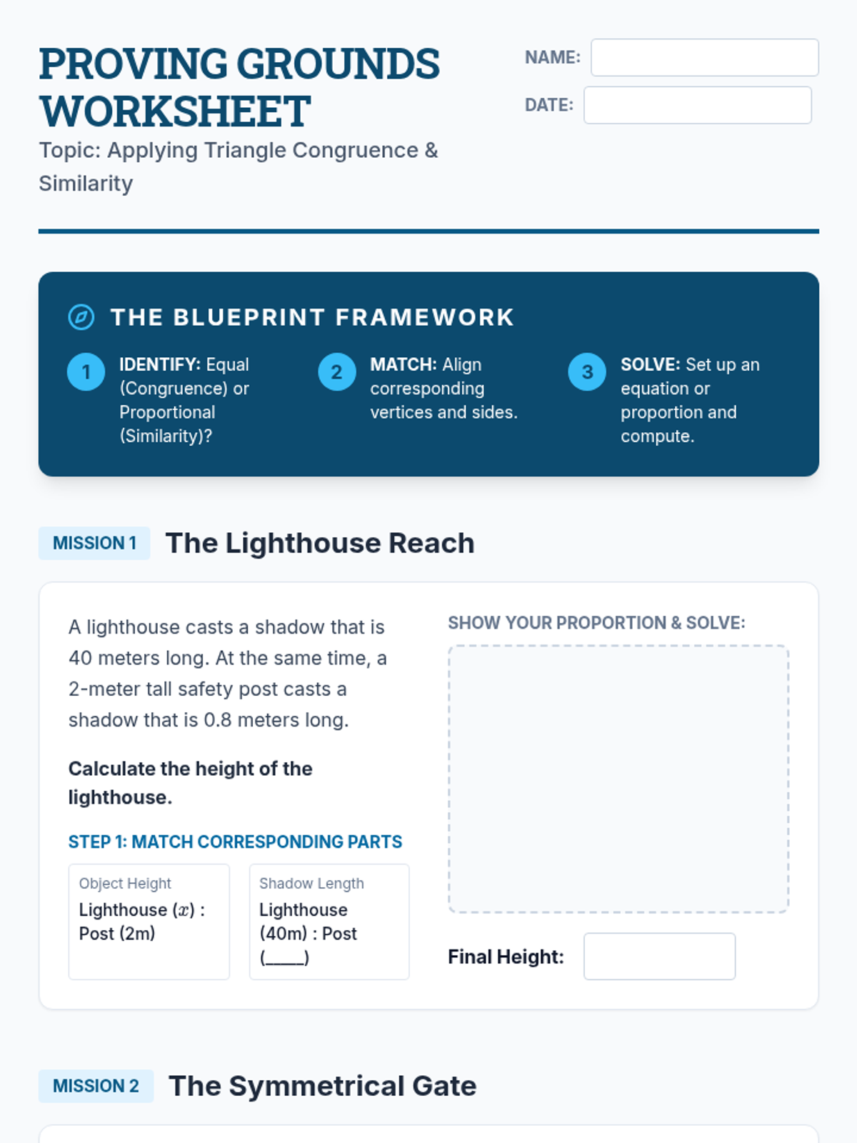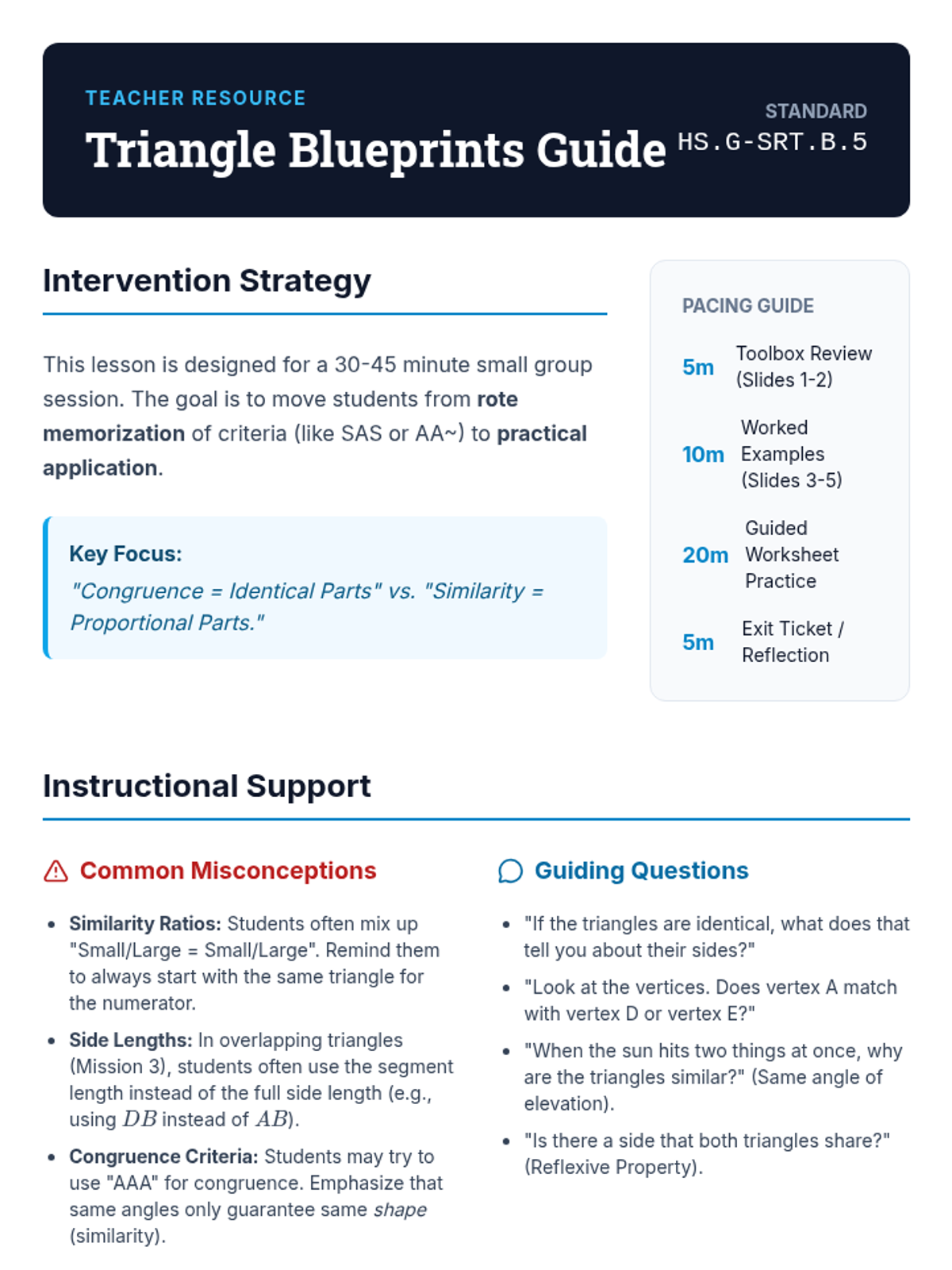 A targeted intervention lesson focusing on the practical application of triangle congruence and similarity criteria. Includes step-by-step problem-solving frameworks and scaffolded real-world scenarios for small group support.
