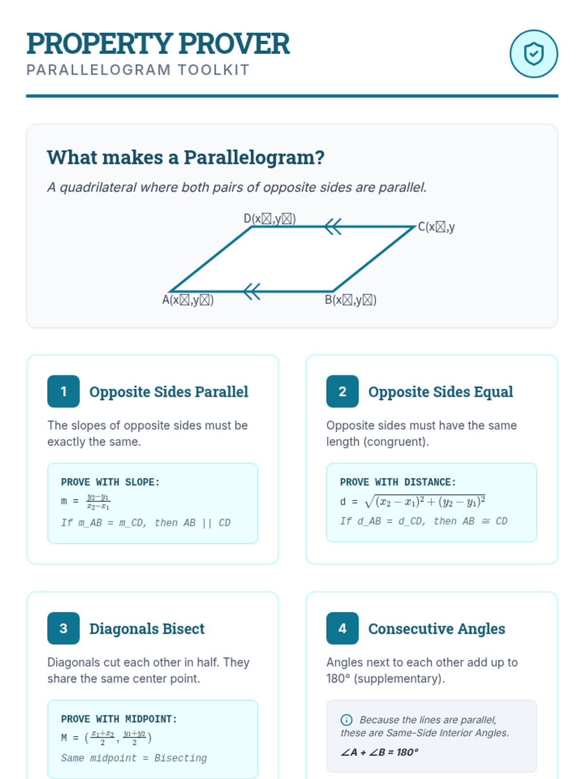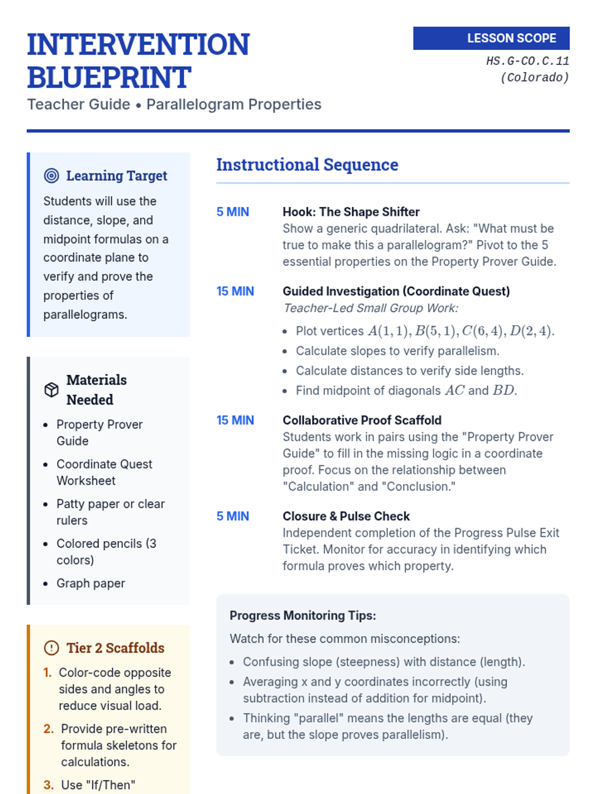 A targeted Tier 2 intervention lesson focusing on the properties of parallelograms using coordinate geometry and scaffolded proofs to support struggling learners.