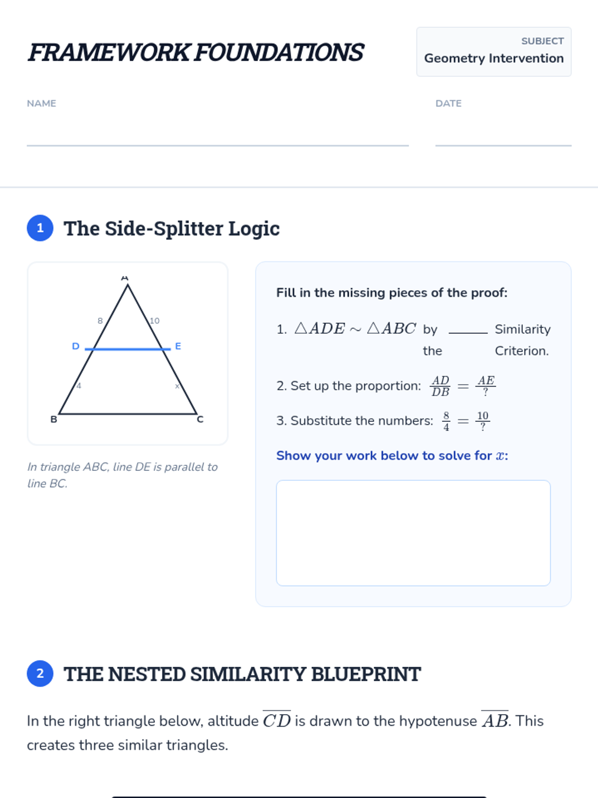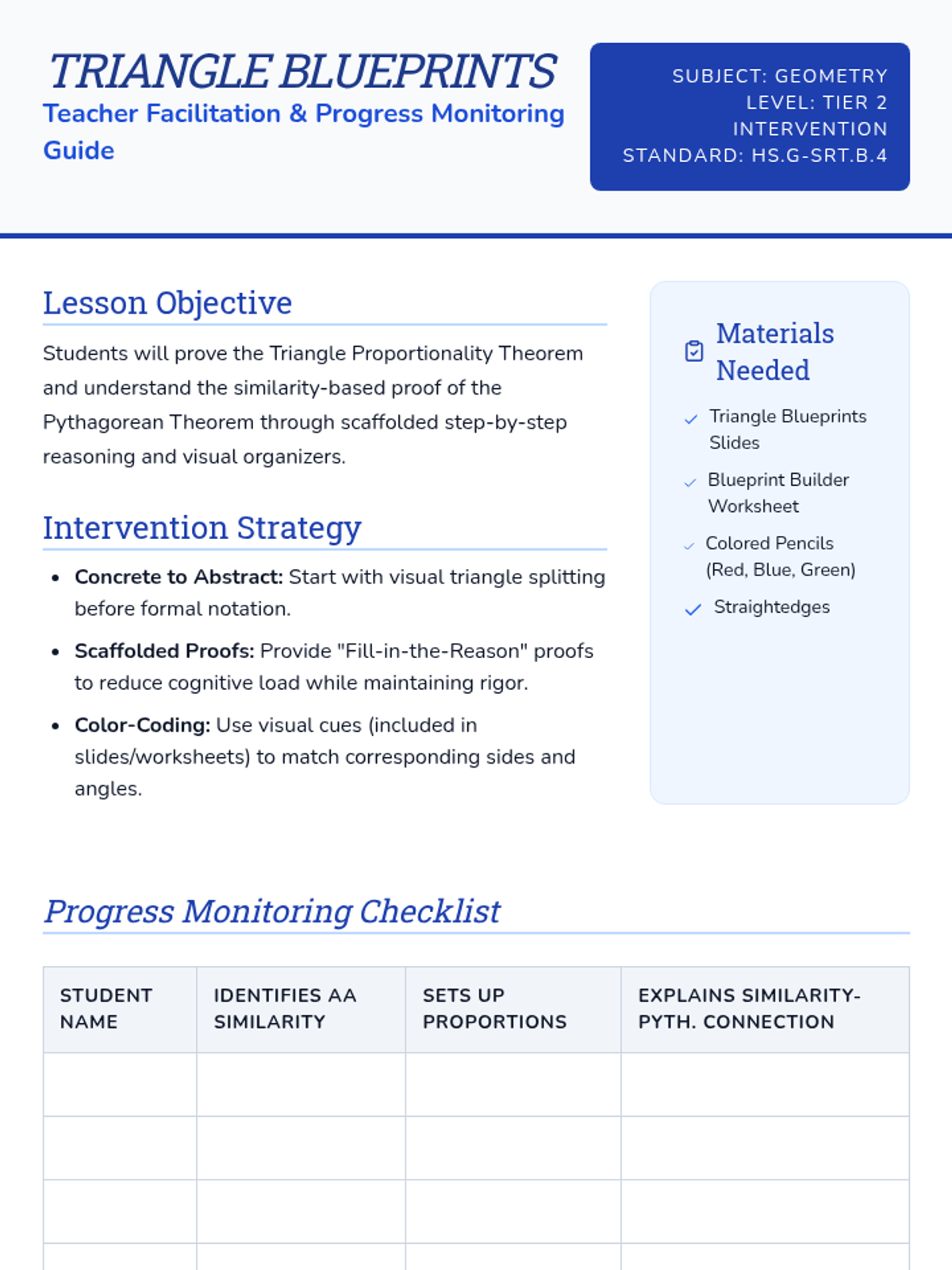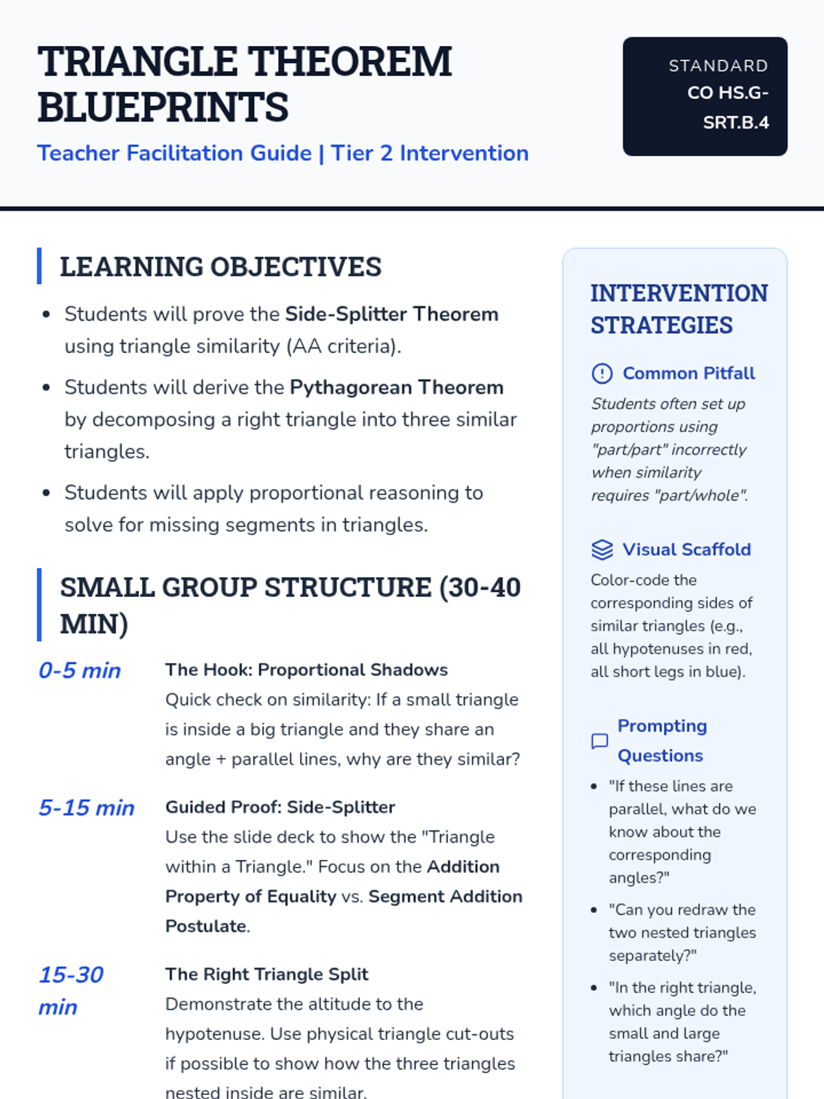 A targeted Tier 2 intervention lesson focusing on proving the Side-Splitter Theorem and the Pythagorean Theorem through triangle similarity. Designed for small group support with scaffolded proofs and visual aids.