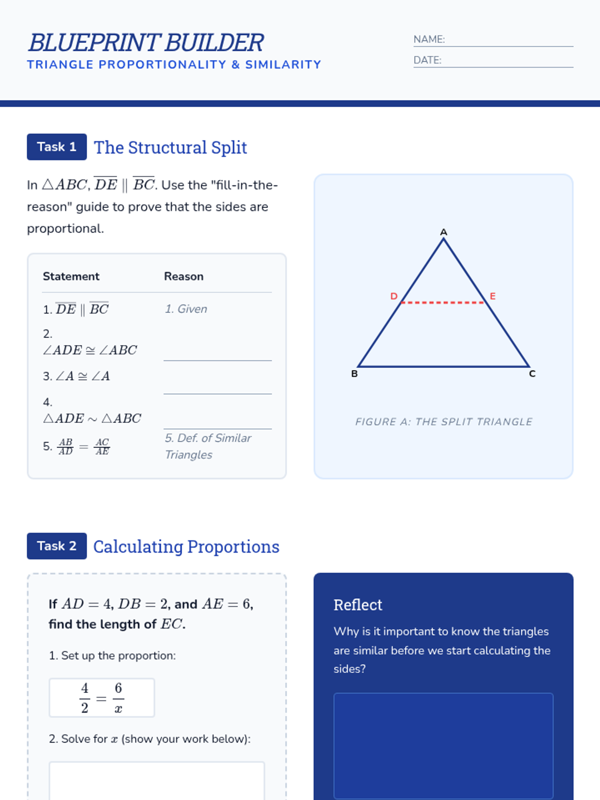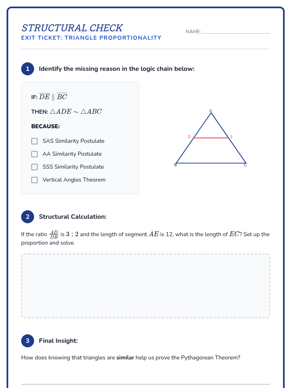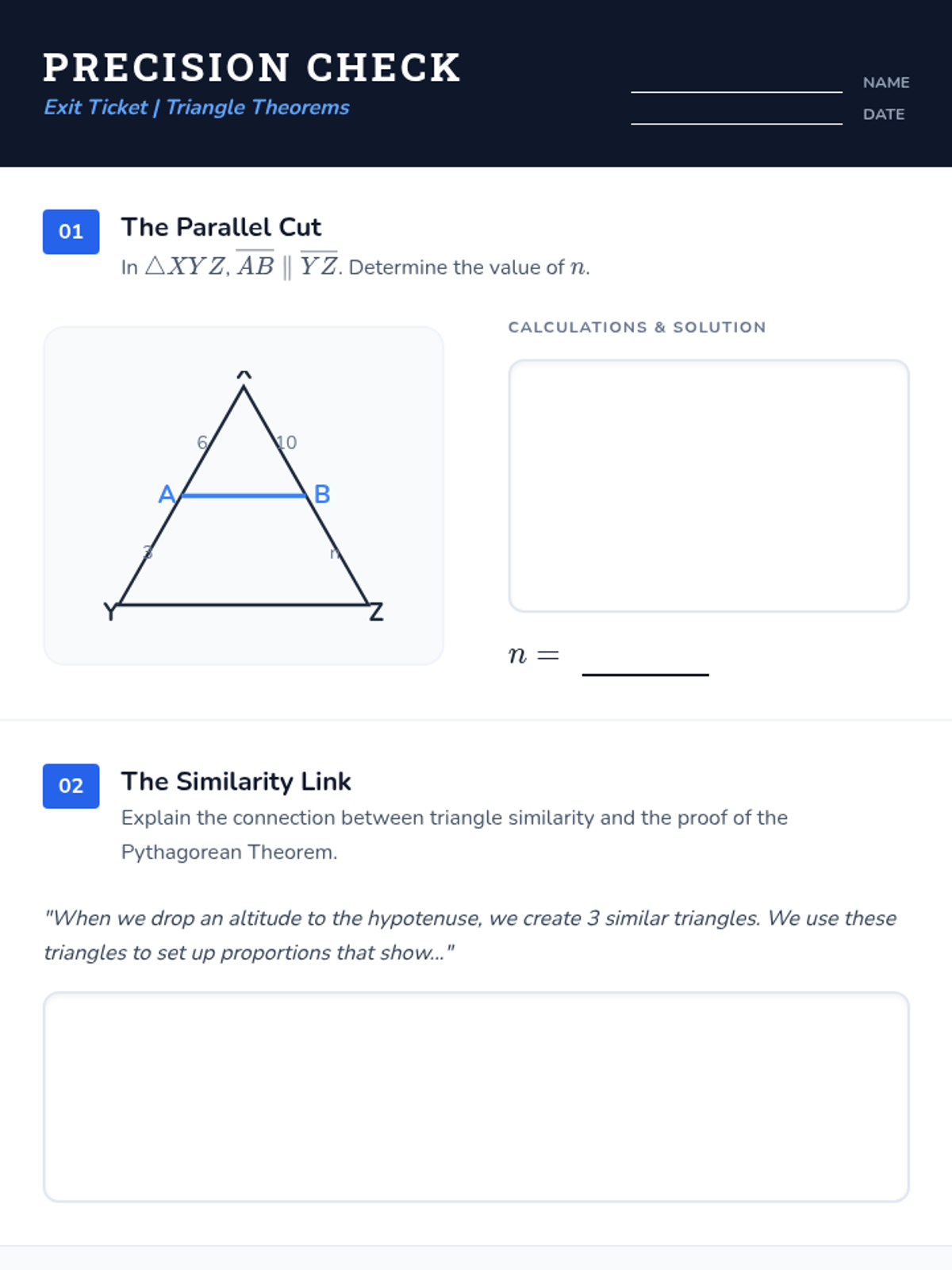 A targeted Tier 2 intervention lesson focusing on proving the Side-Splitter Theorem and the Pythagorean Theorem through triangle similarity. Designed for small group support with scaffolded proofs and visual aids.