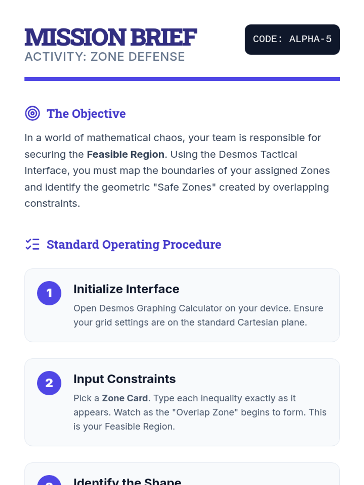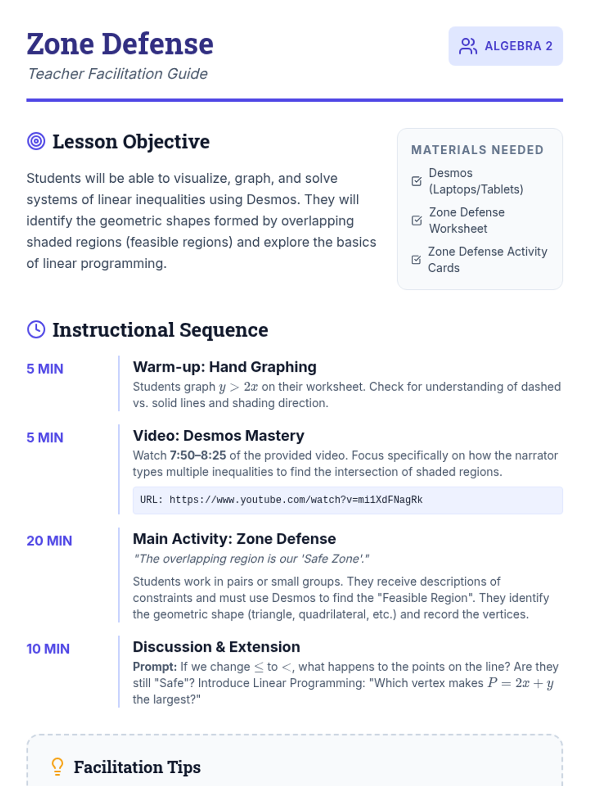 A high-energy Algebra 2 lesson where students use Desmos to visualize systems of linear inequalities and identify 'feasible regions' as geometric shapes, culminating in an introduction to linear programming.