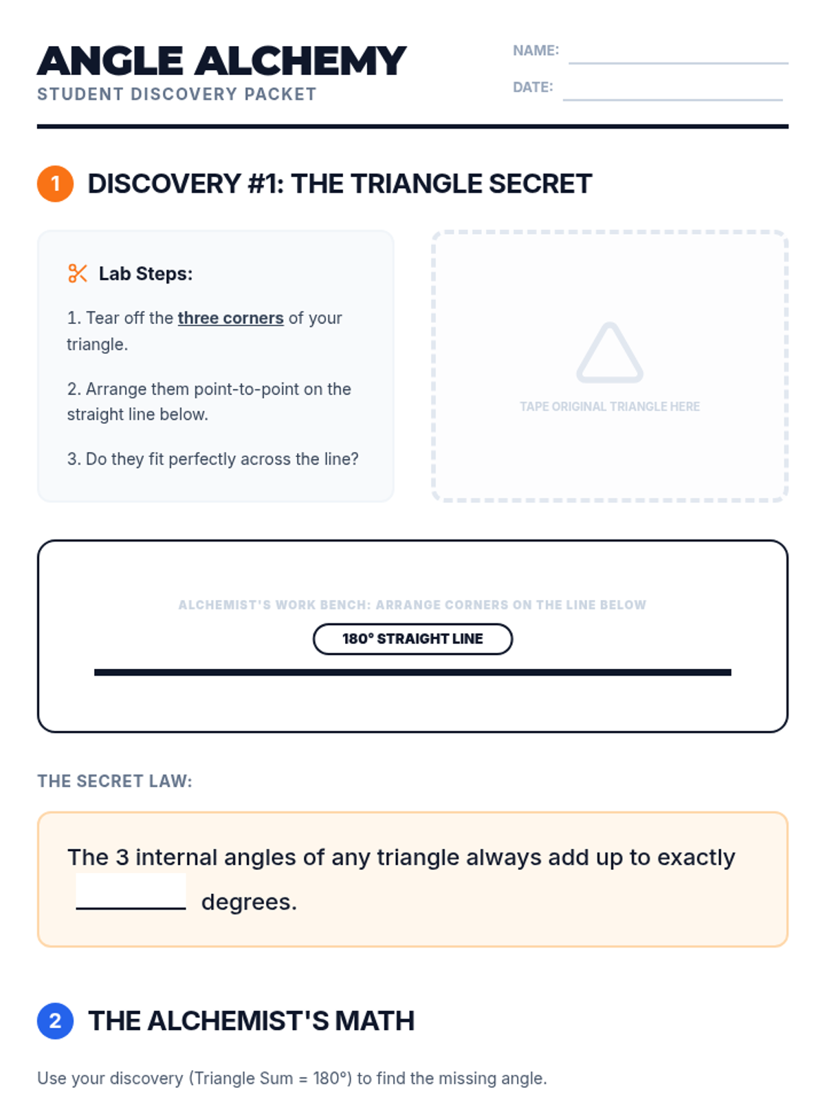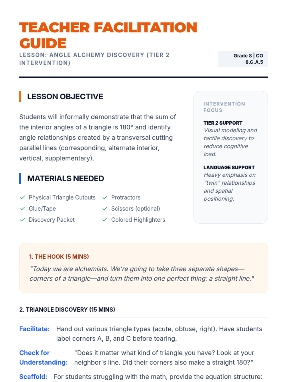 A Tier 2 intervention lesson focusing on the discovery of triangle angle sums and parallel line relationships through hands-on activities and visual models. Students will use physical triangle cutouts and protractors to explore geometry concepts in a small group setting.