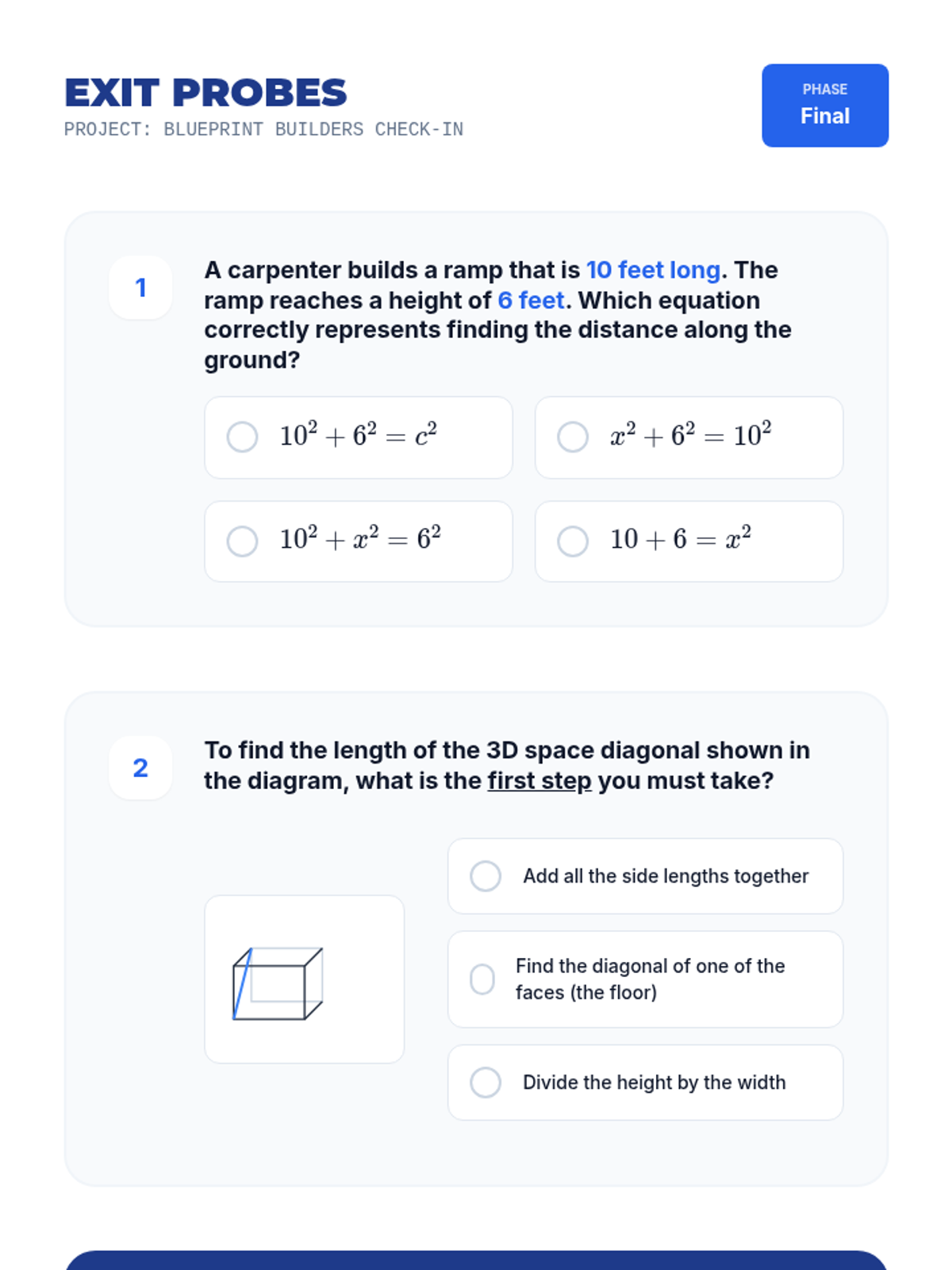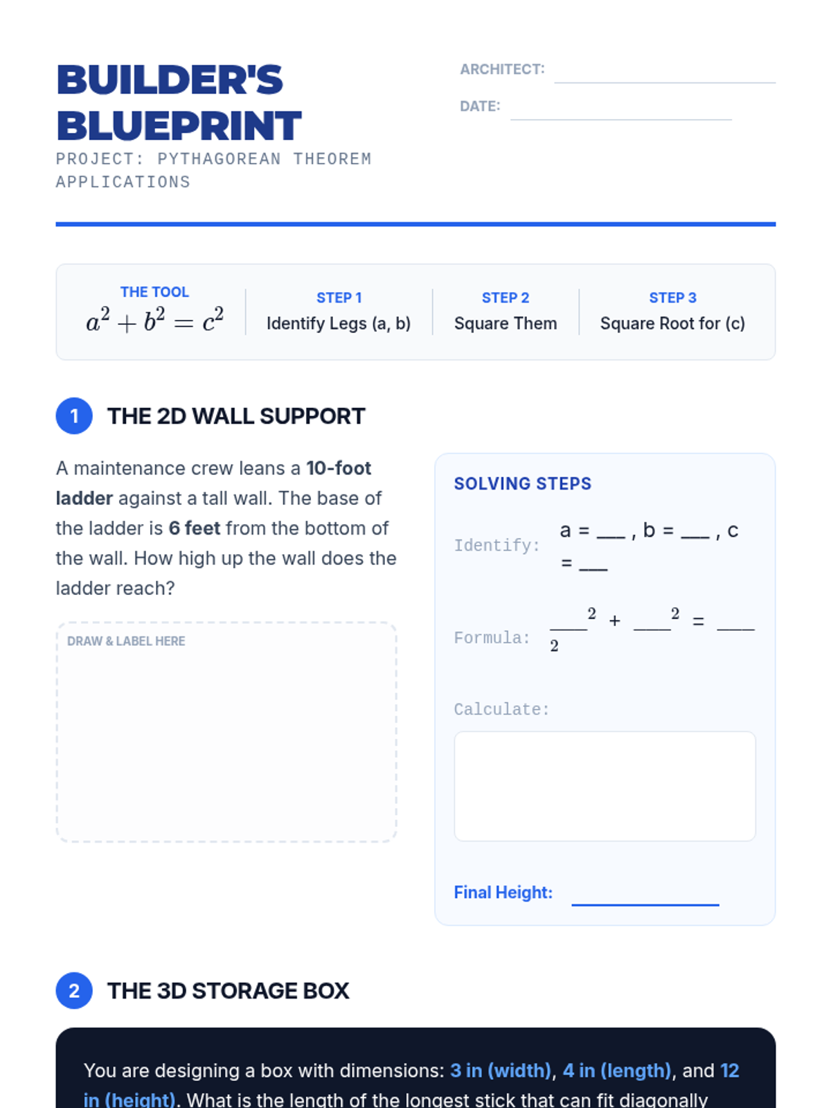 A Tier 2 intervention lesson focusing on applying the Pythagorean Theorem to 2D and 3D scenarios using a 'Blueprint Builder' theme. The lesson includes scaffolded steps for solving ladder problems and finding the diagonal of a rectangular prism.