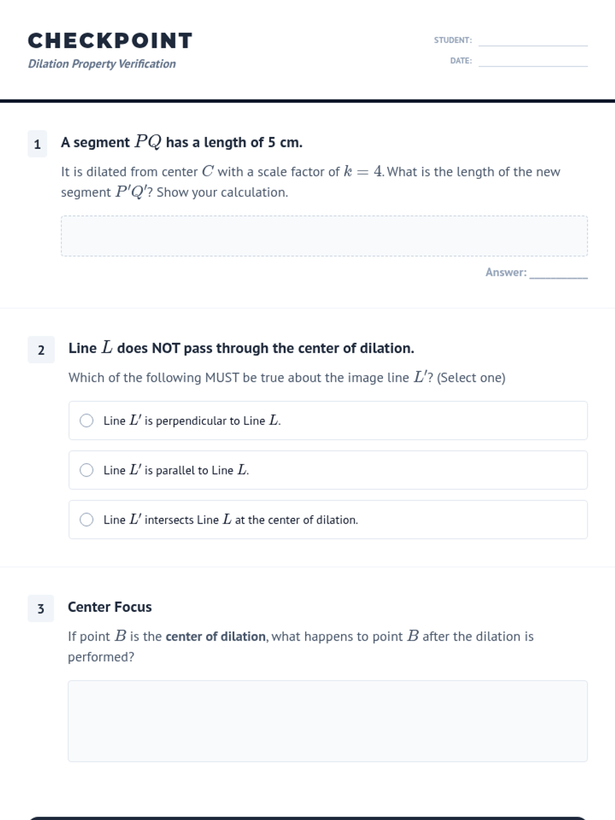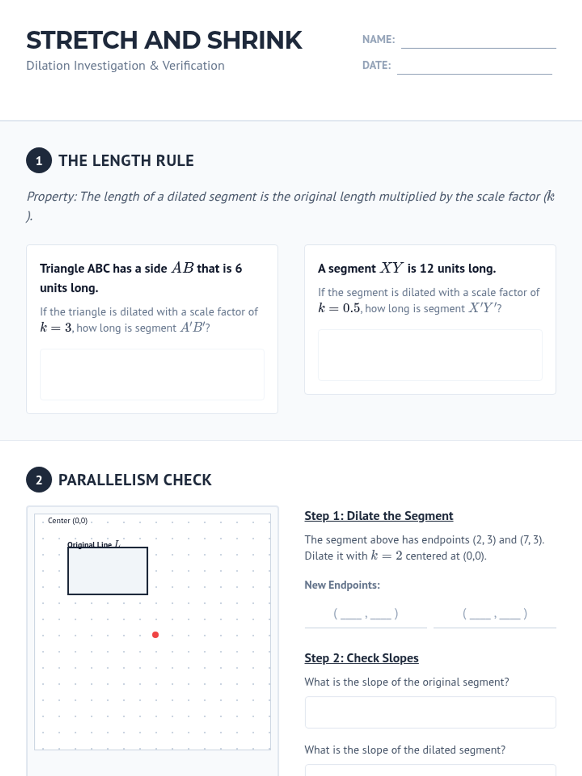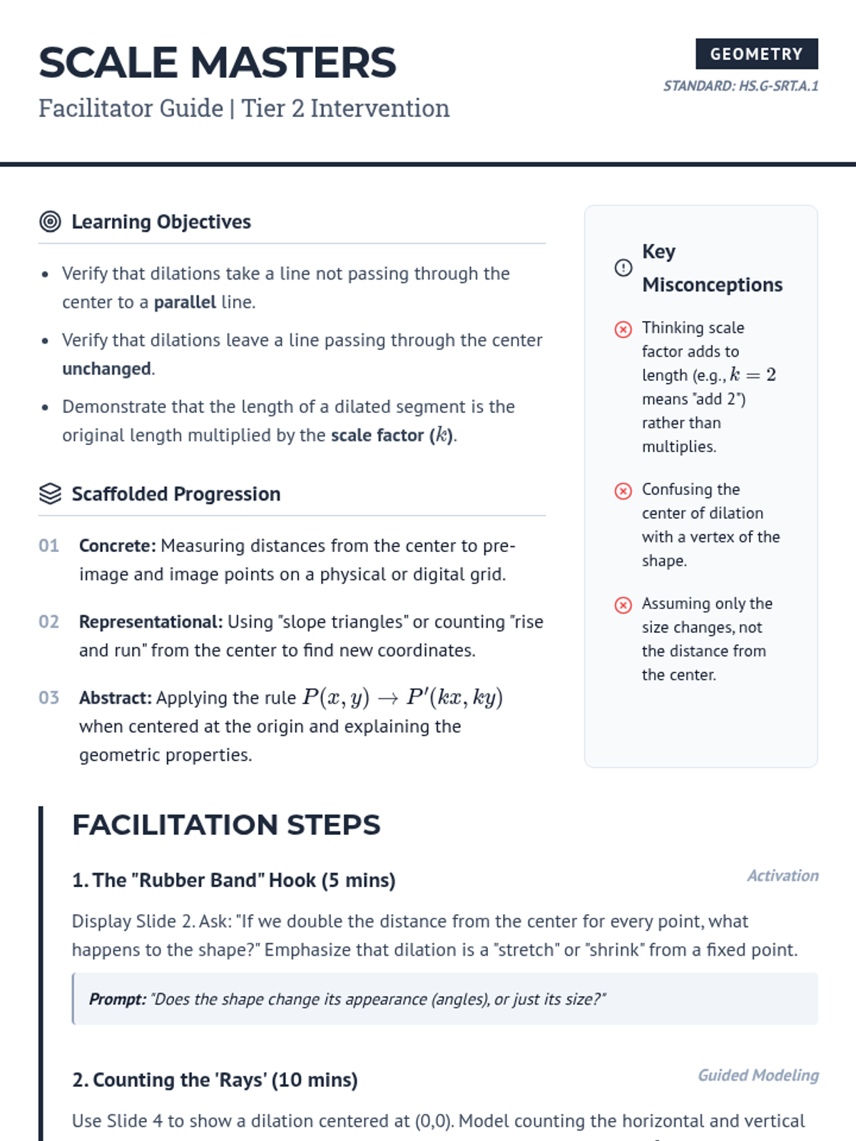 A Tier 2 intervention lesson focused on verifying dilation properties through hands-on measurement and coordinate plane exploration. Designed for small groups, it emphasizes the relationship between scale factor, distance from center, and segment length.