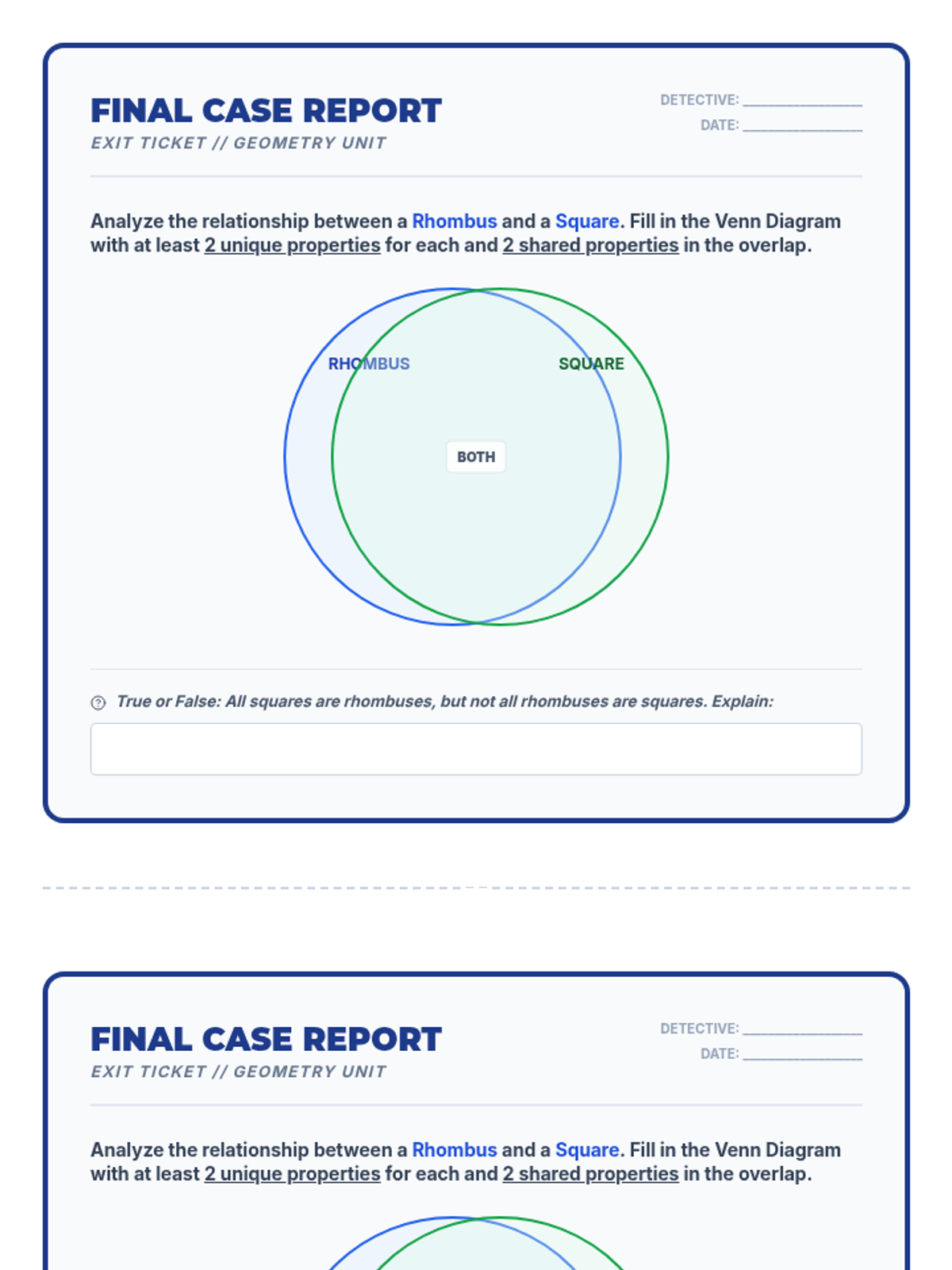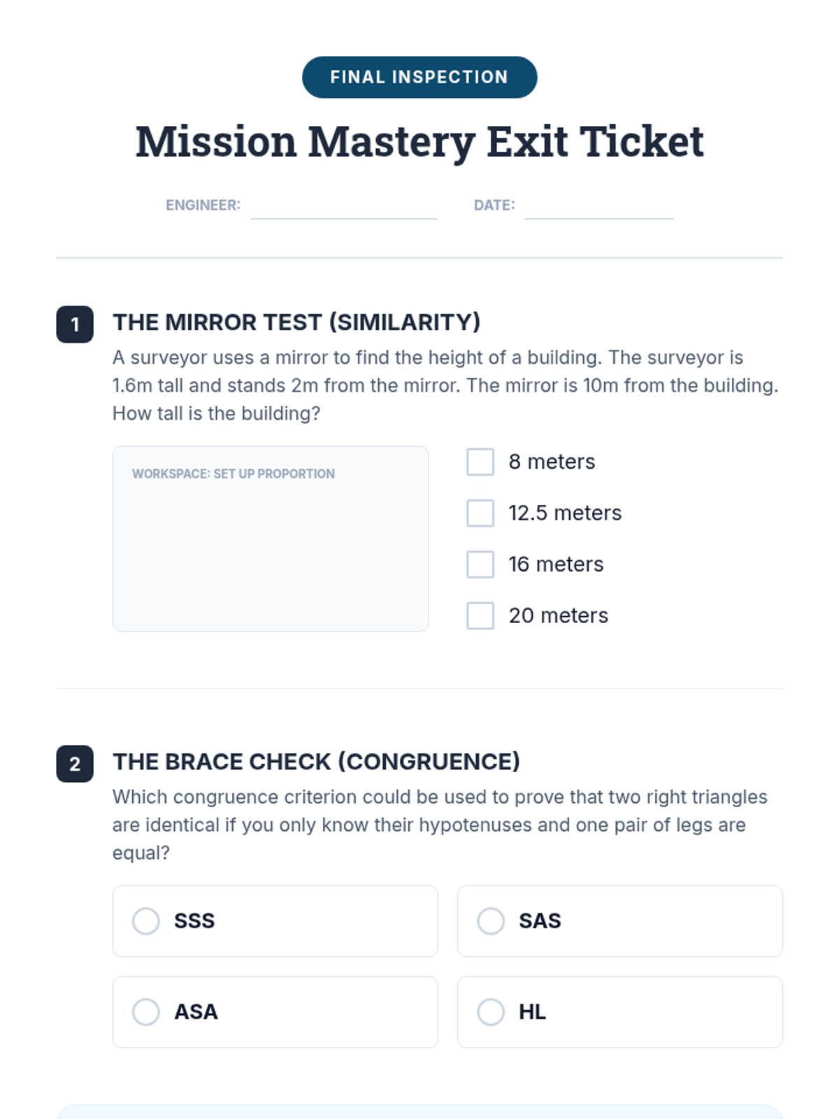 A Tier 2 intervention lesson focused on mastering congruence and similarity criteria through scaffolded proofs and real-world solving. Students will use SSS, SAS, ASA, AAS, HL, and similarity shortcuts to analyze geometric figures.