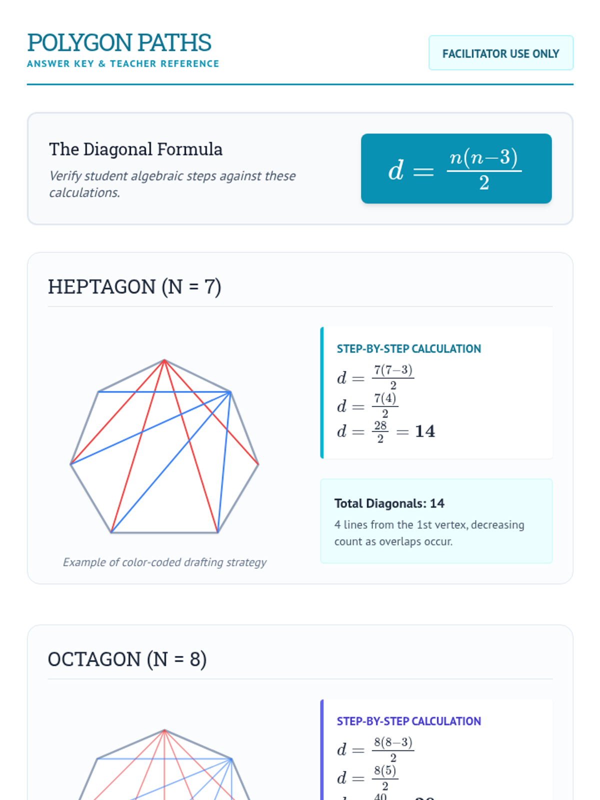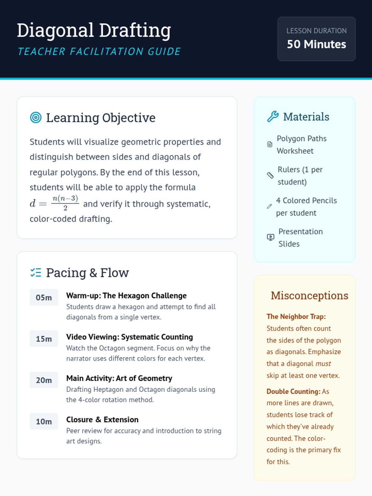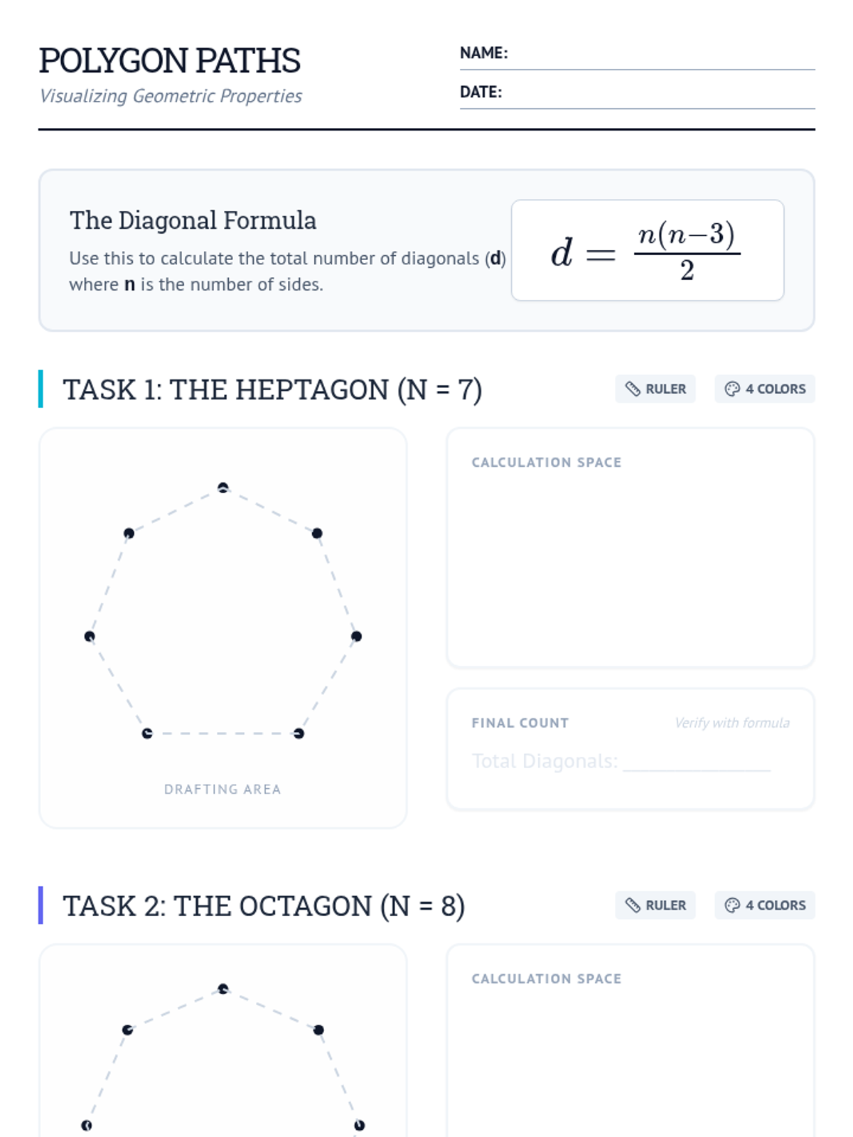 A hands-on geometry lesson where students visualize and calculate the diagonals of regular polygons, moving from concrete color-coded drawings to abstract algebraic formulas.