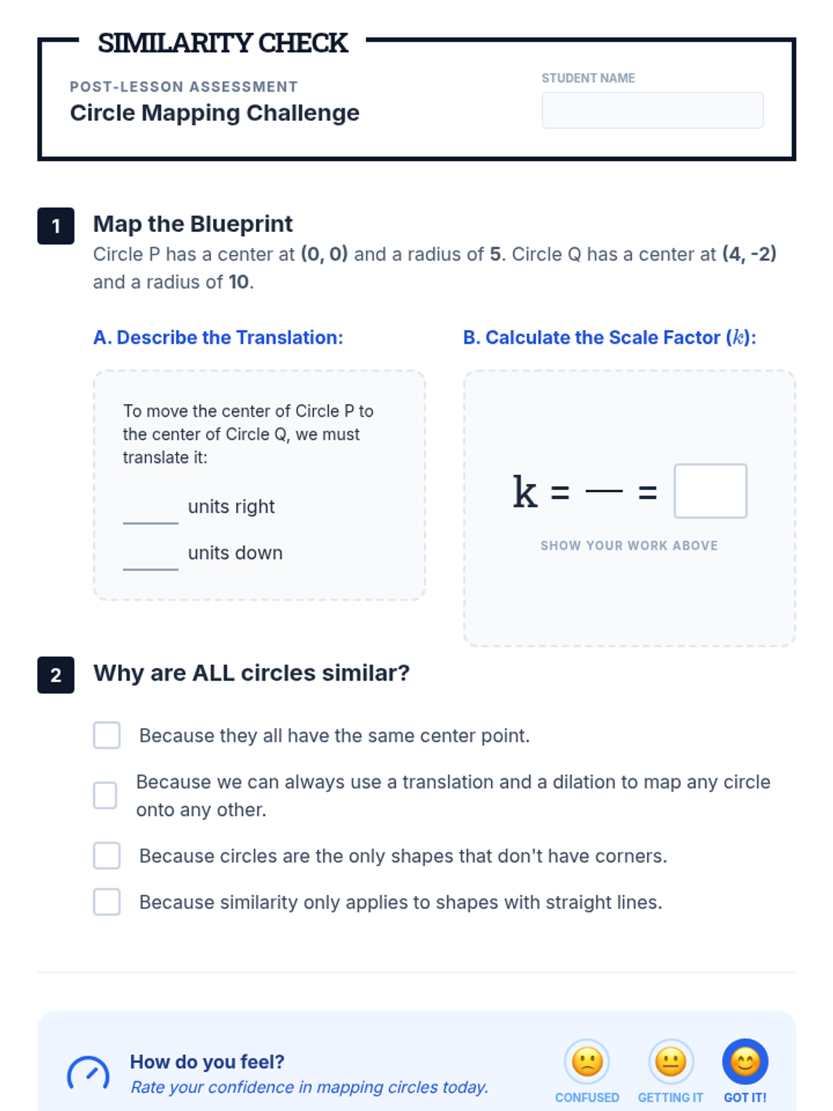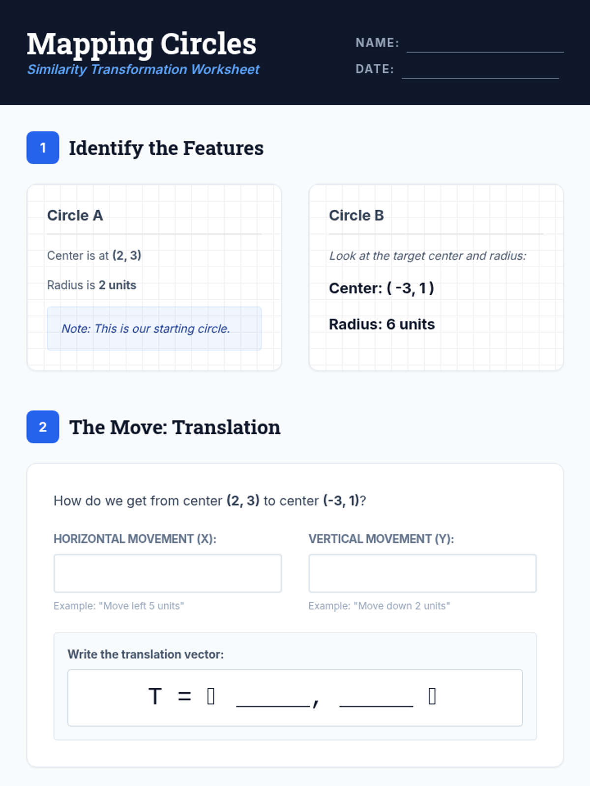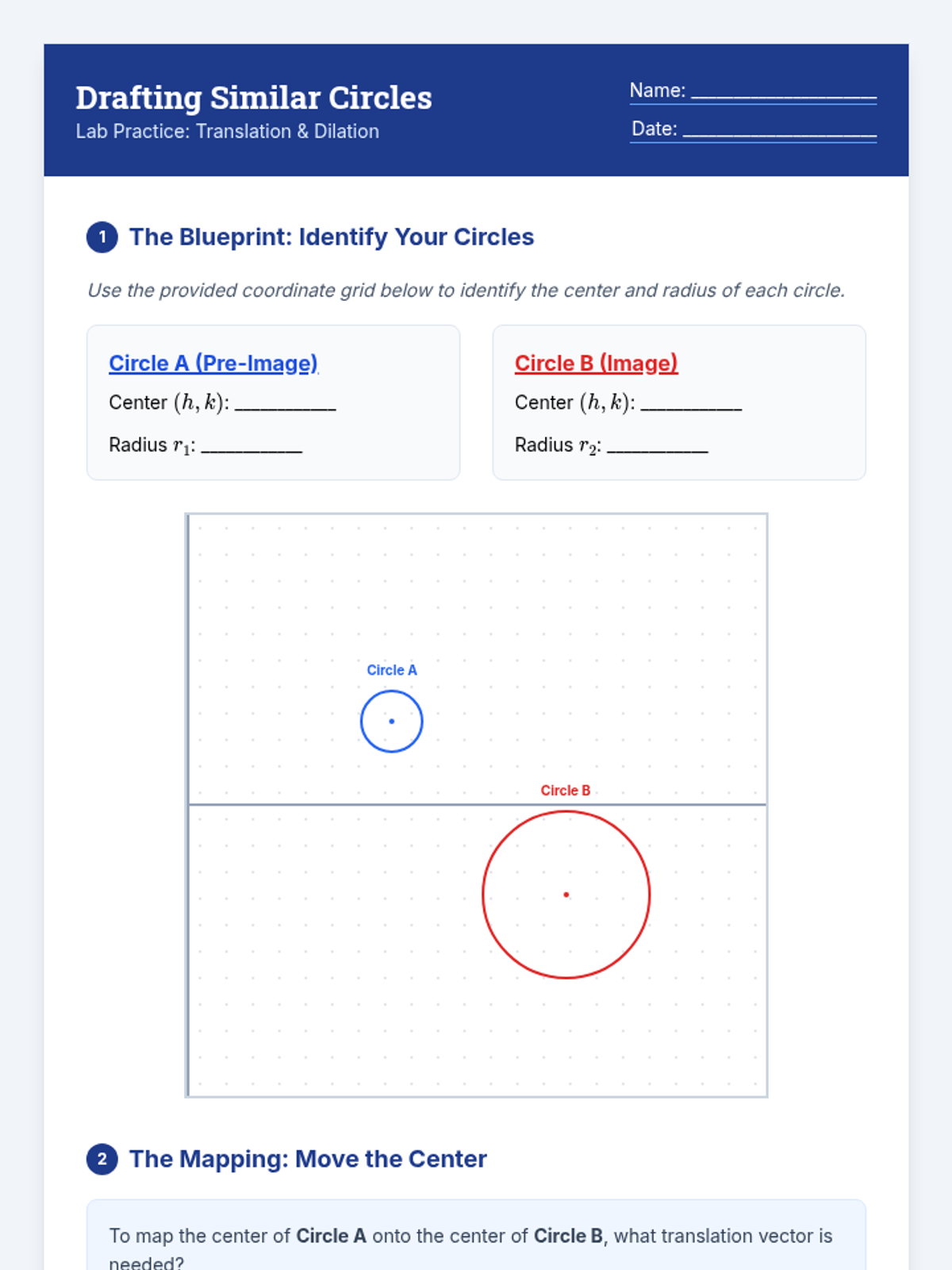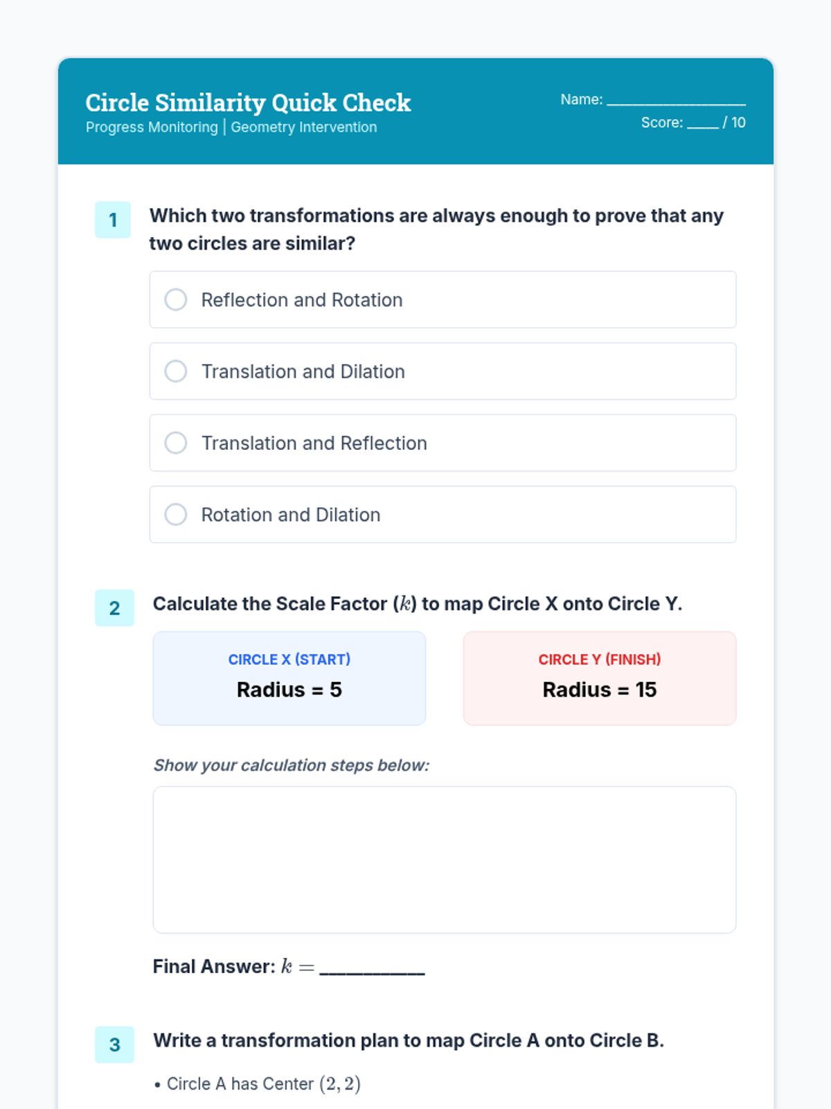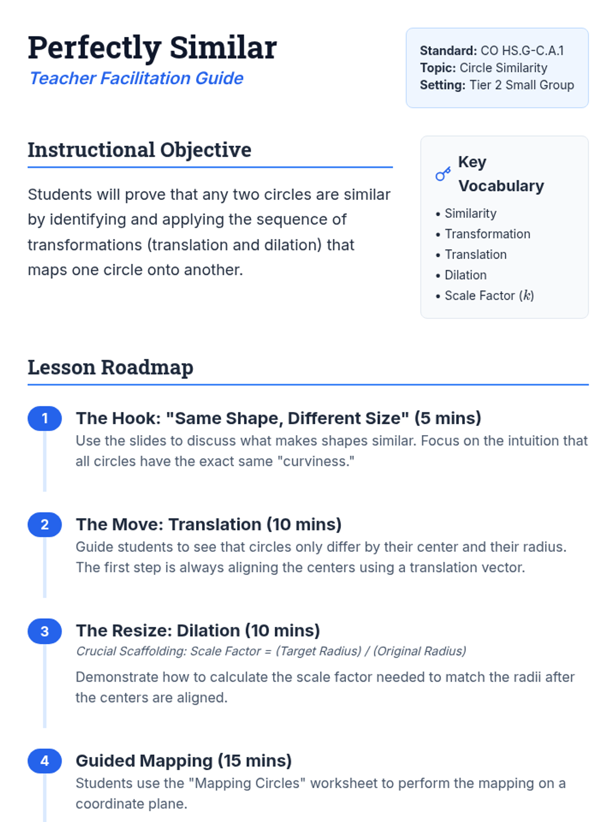 A targeted Tier 2 intervention lesson focusing on proving circle similarity through translation and dilation transformations. Designed for small group instruction with scaffolded hands-on practice.