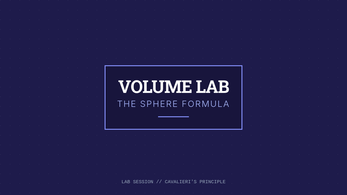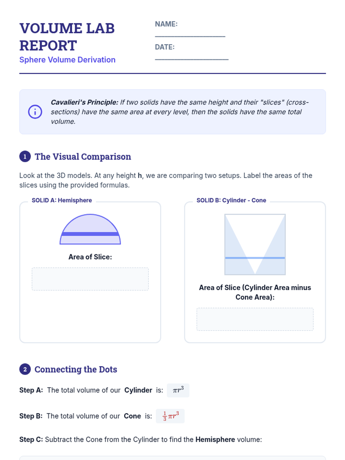 A small-group intervention lesson focusing on the conceptual derivation of sphere volume by comparing its cross-sections to a cylinder with a cone removed, utilizing Cavalieri's Principle.