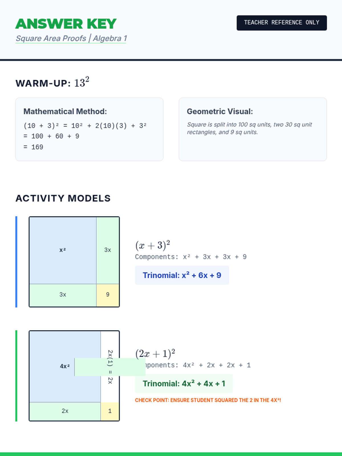 Students visualize perfect square trinomials through geometric area models, debunking the 'Freshman's Dream' misconception and physically proving the existence of the middle 2ab term.
