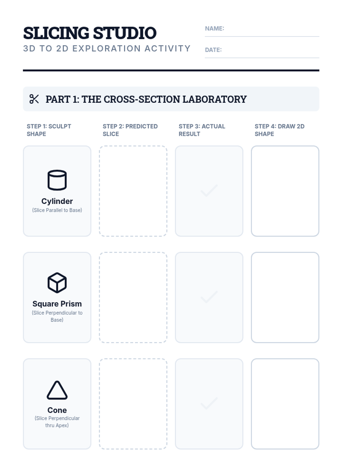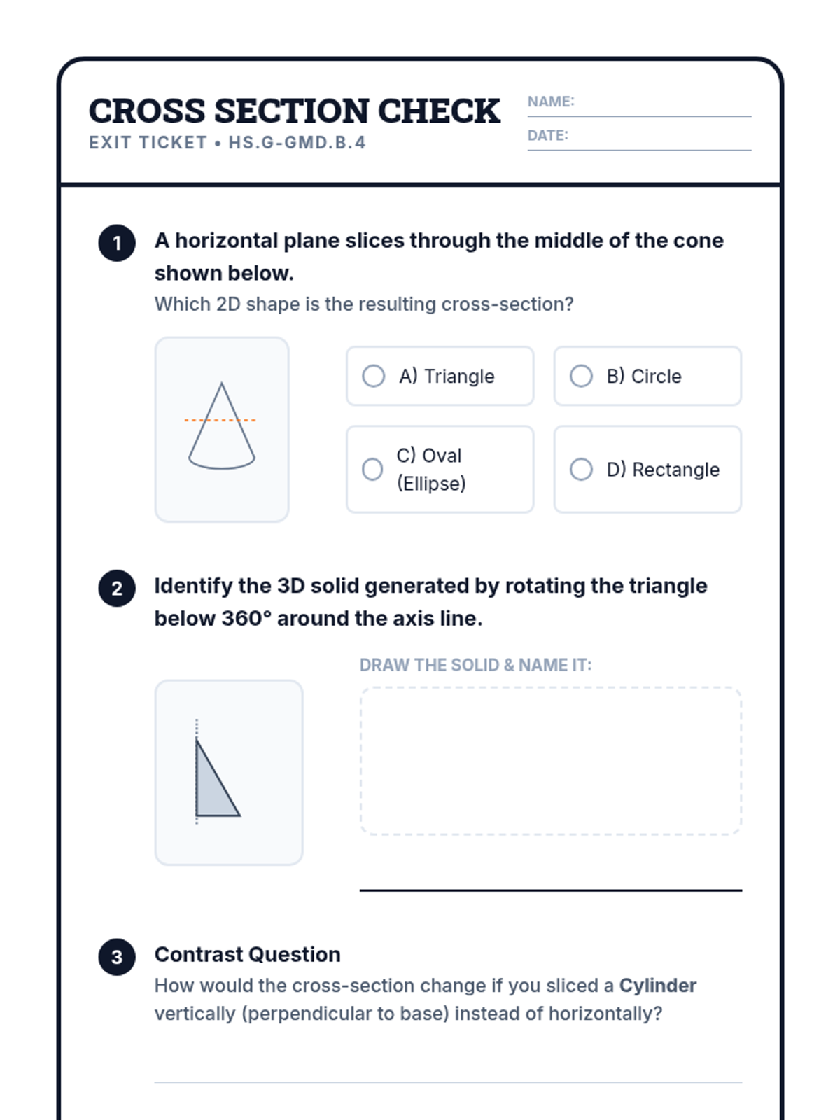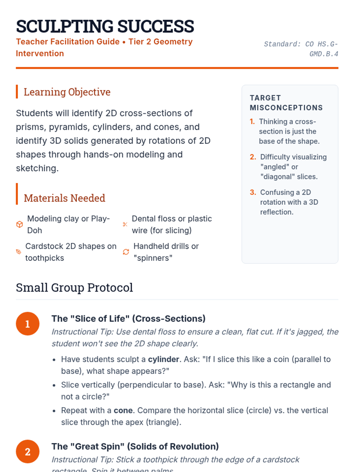 A Tier 2 intervention lesson focusing on hands-on exploration of cross-sections and solids of revolution using physical models and sketching. Students transition from 3D manipulation to 2D visualization to meet standard HS.G-GMD.B.4.