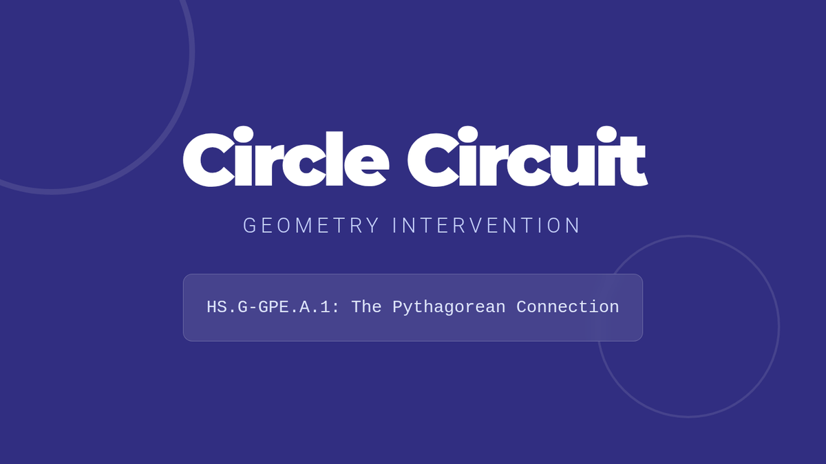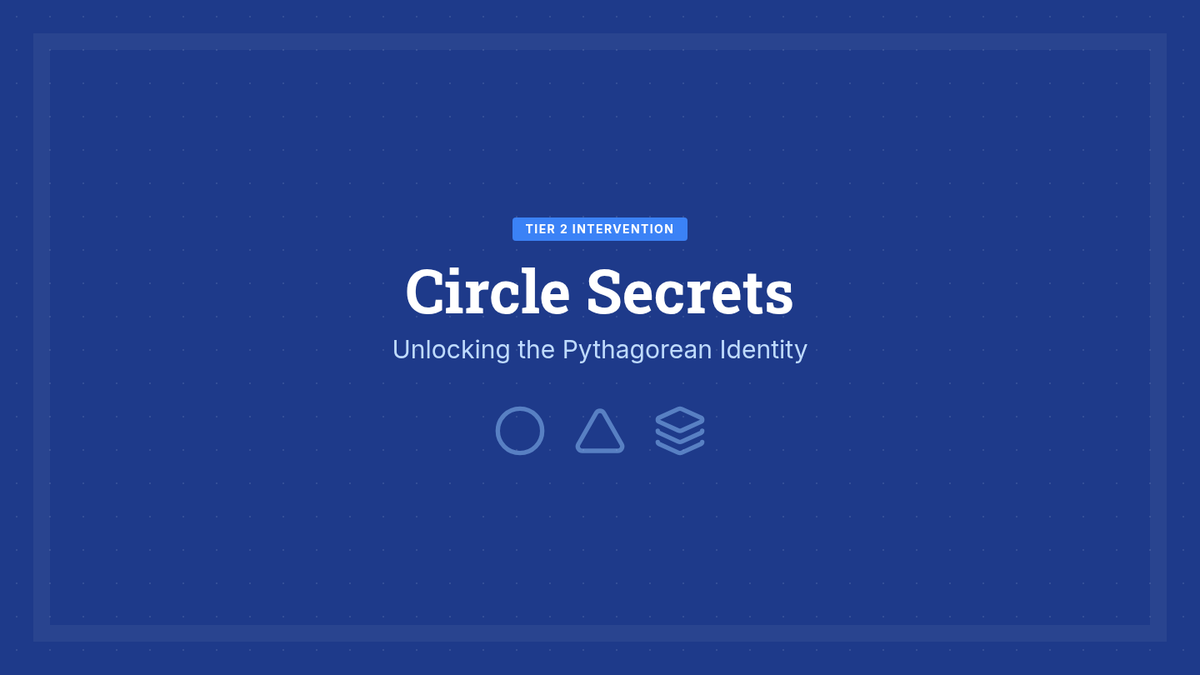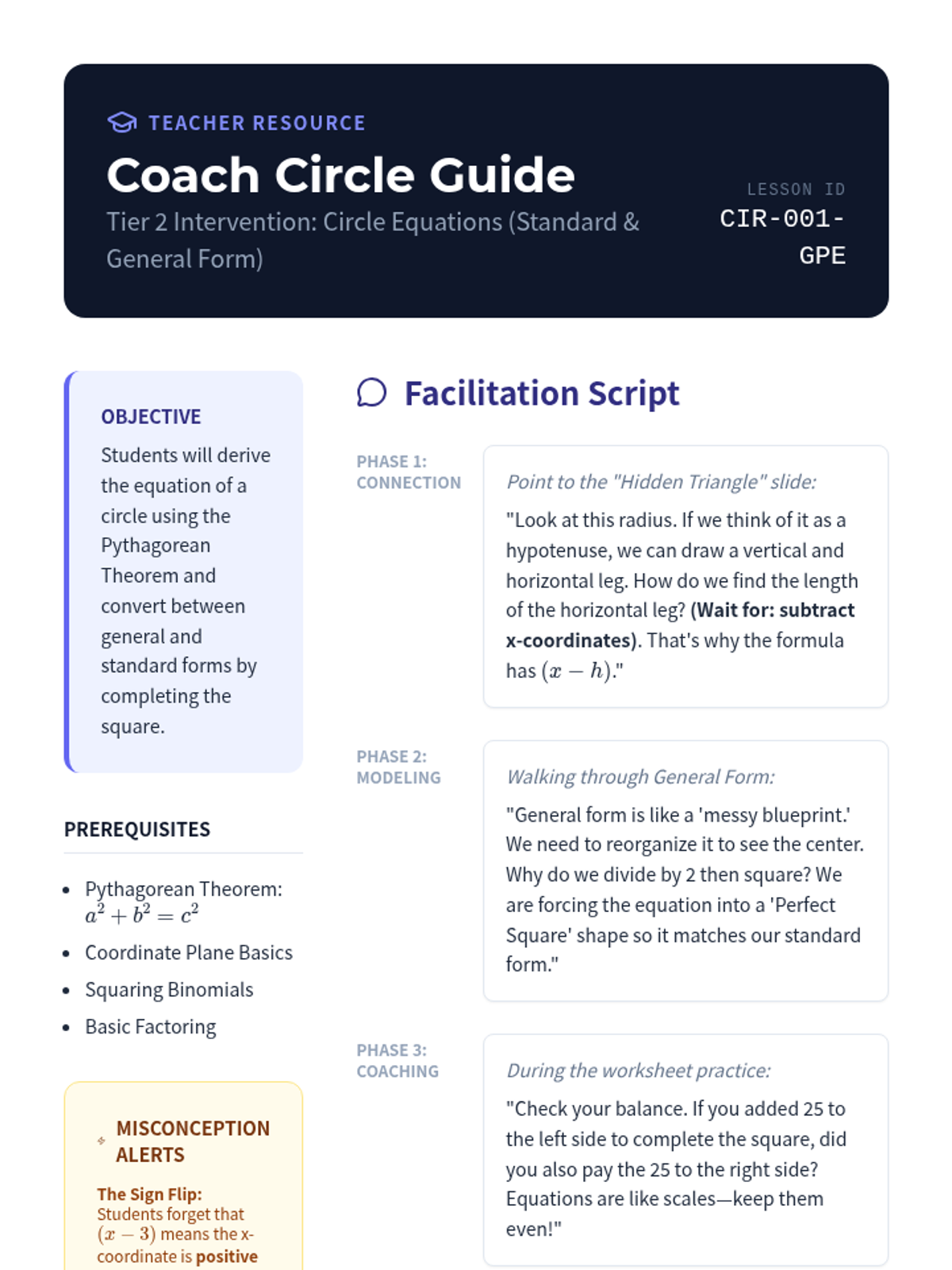 A targeted Tier 2 intervention lesson focusing on the conceptual link between the Pythagorean Theorem and circle equations, covering both standard and general forms.