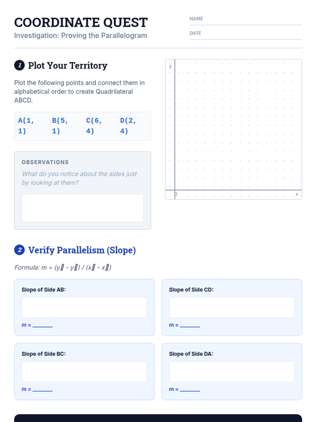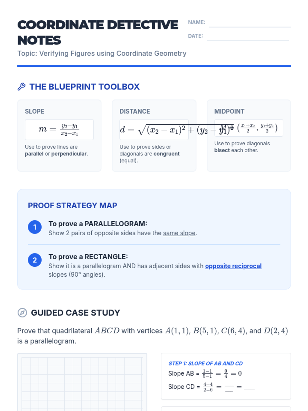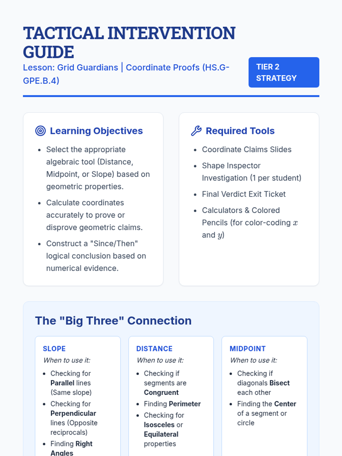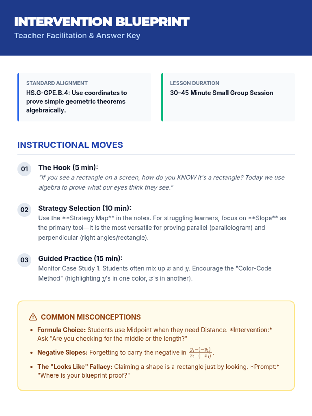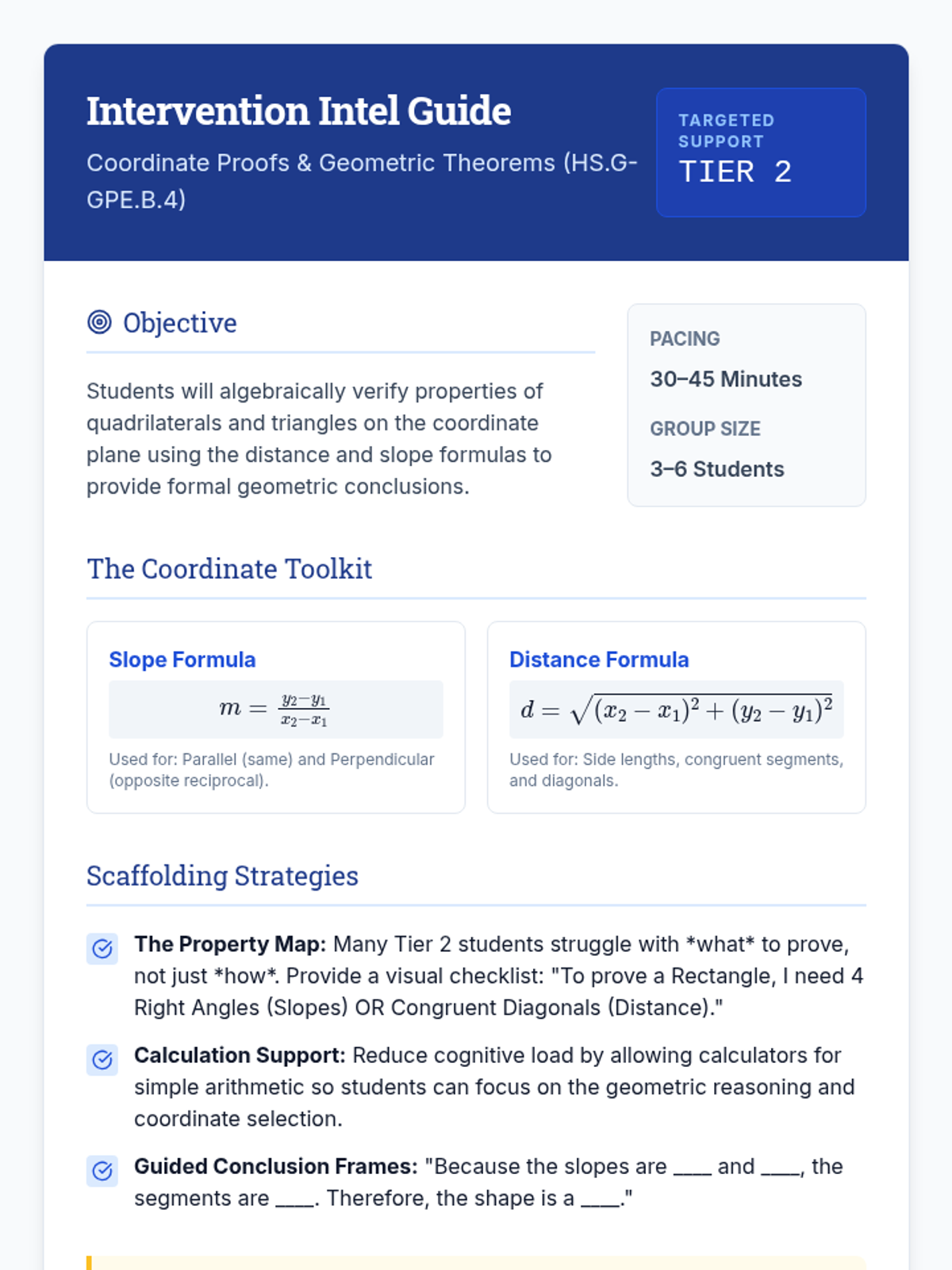 A targeted Tier 2 intervention lesson designed for small groups to master coordinate proof strategies. The lesson focuses on using slope, distance, and midpoint formulas to verify geometric properties of quadrilaterals like parallelograms and rectangles.