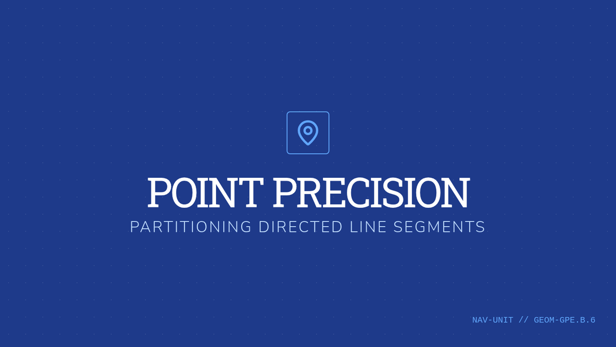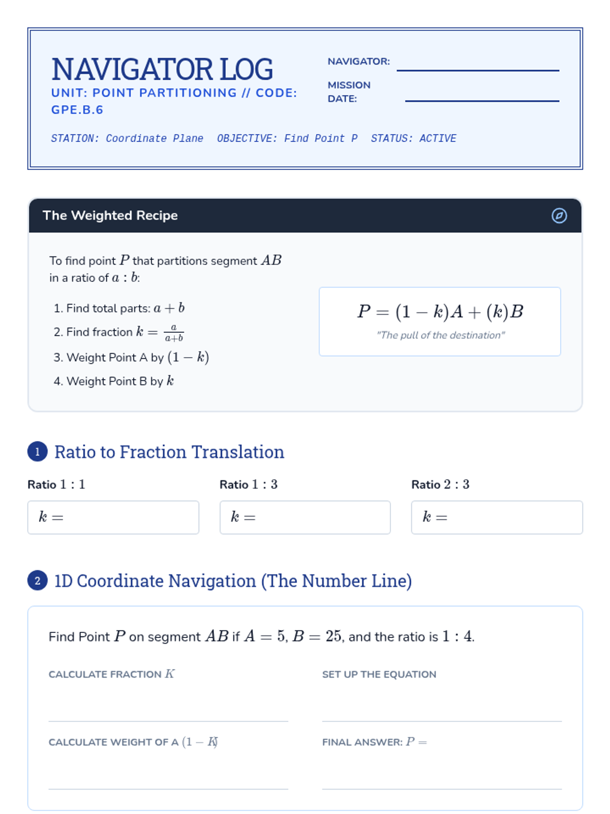 A targeted intervention lesson for high school geometry students on partitioning directed line segments using weighted averages and coordinate reasoning. This lesson uses a navigation-themed blueprint aesthetic to guide students through visual models and step-by-step calculations.