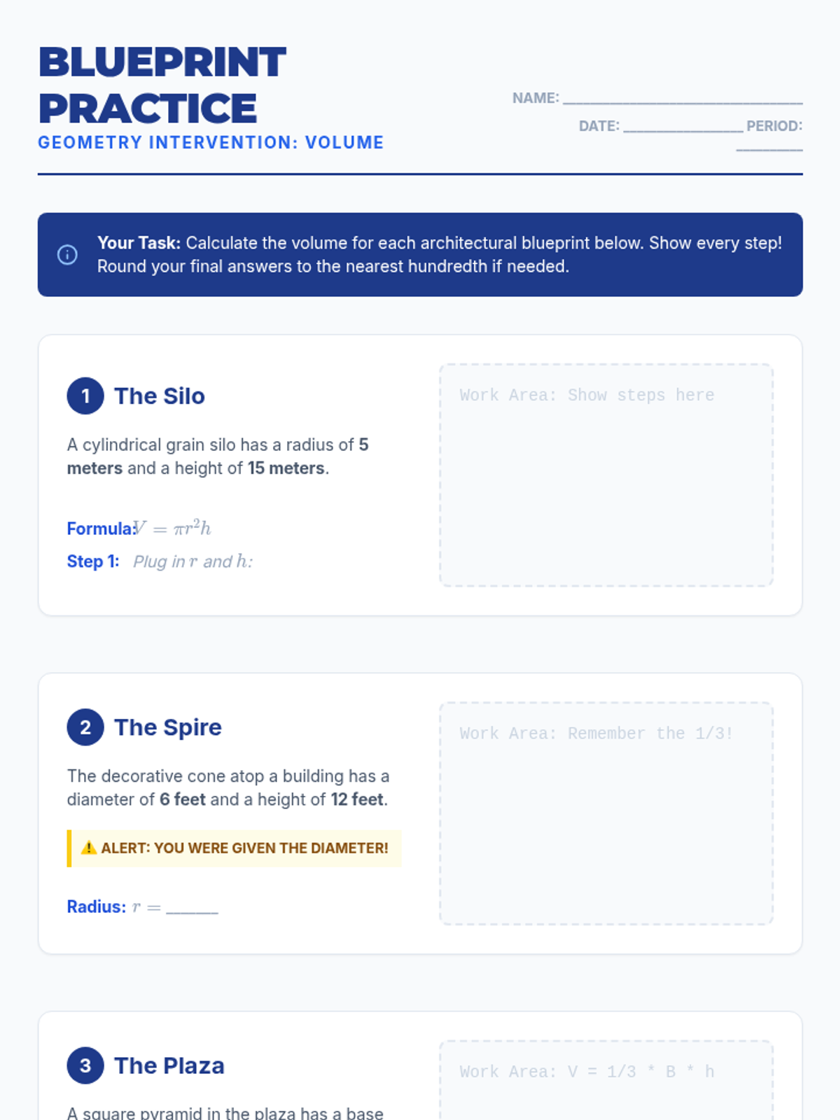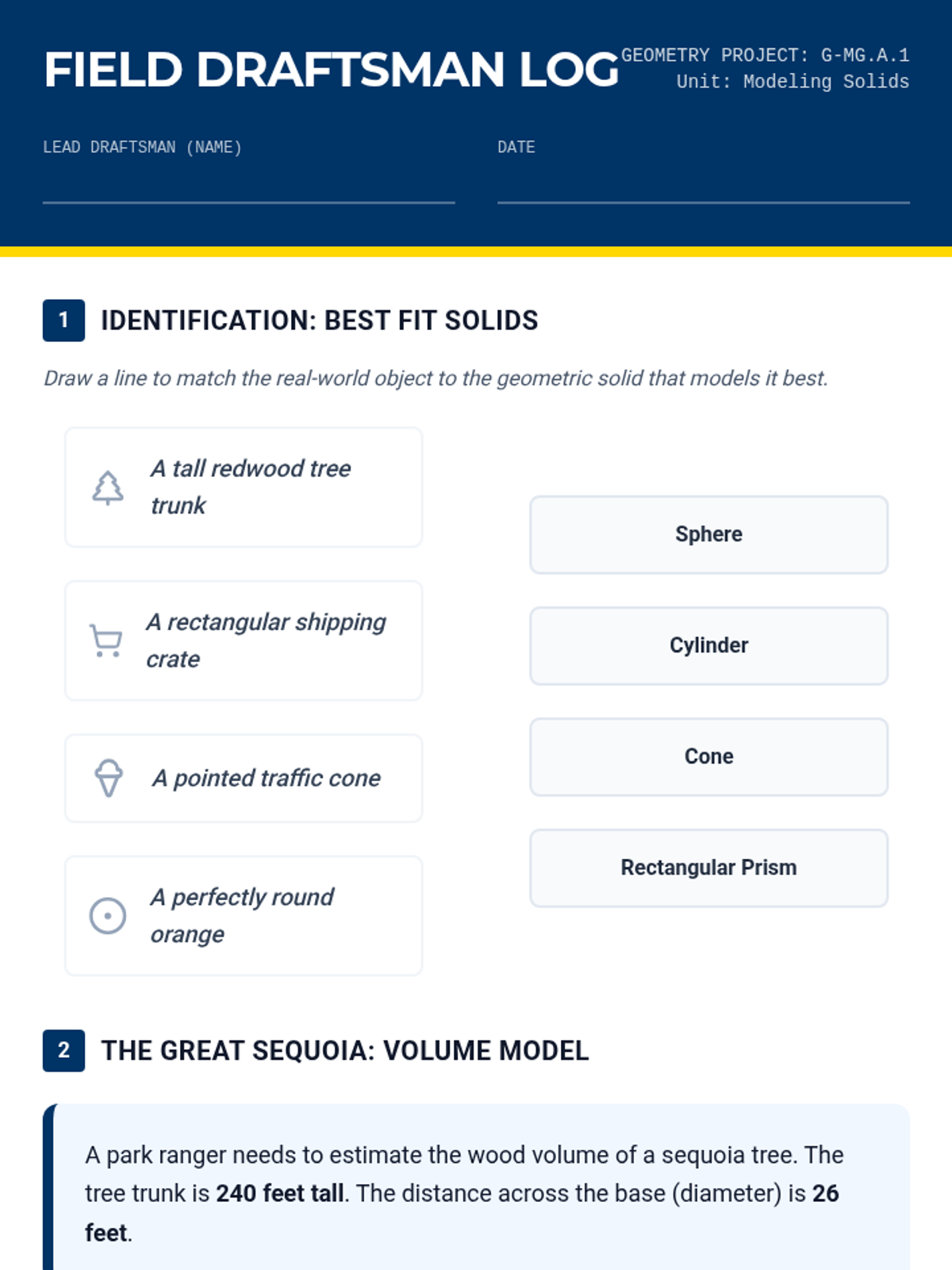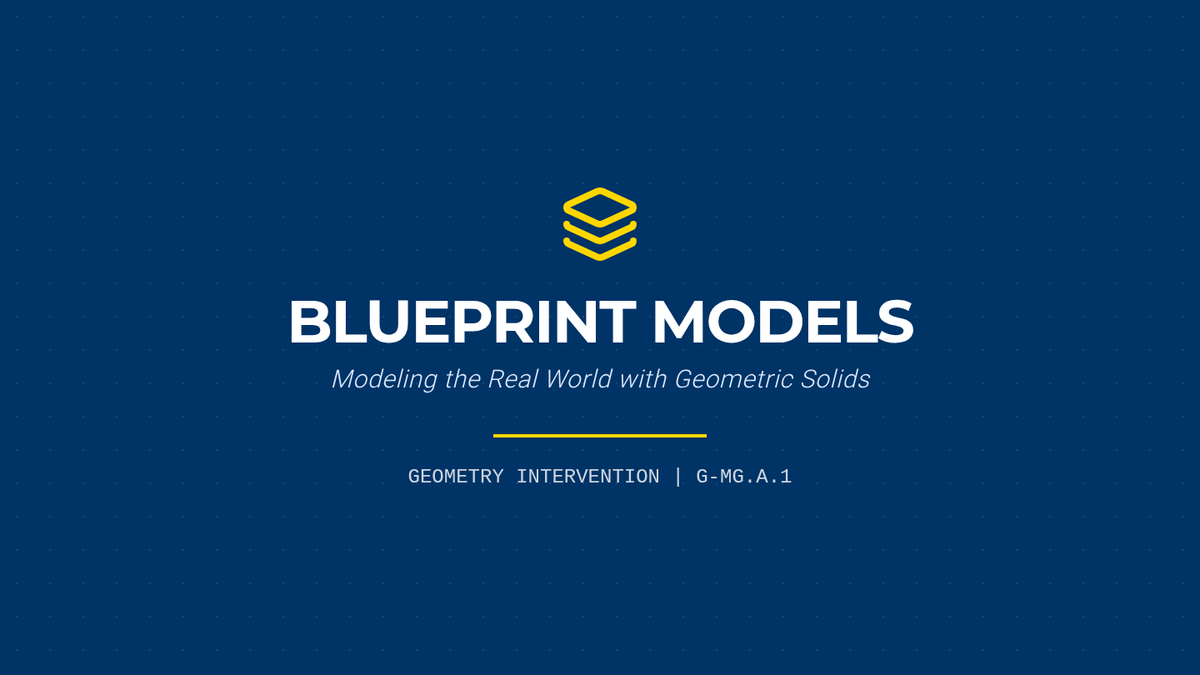 A Tier 2 intervention lesson focusing on G-MG.A.1, helping students model real-world objects as geometric solids. This lesson uses a blueprint/drafting theme to make geometric modeling concrete and accessible for struggling learners.