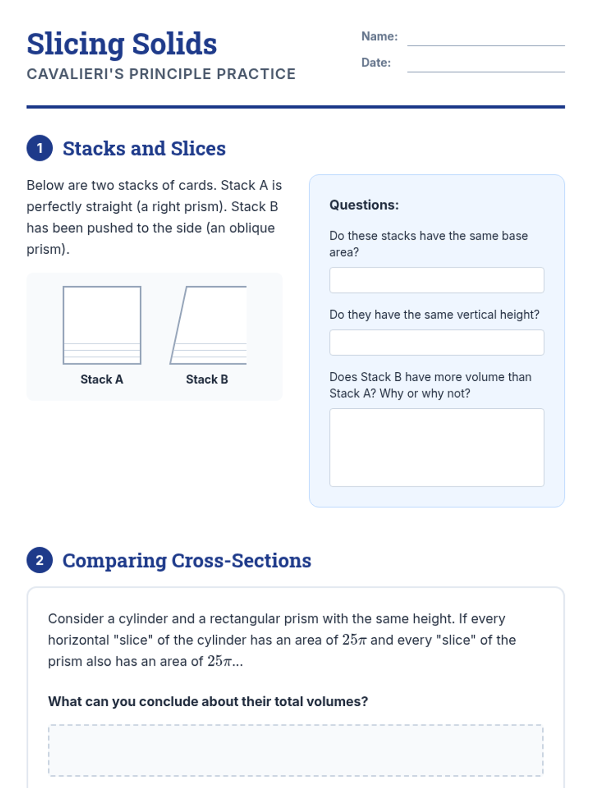 A Tier 2 intervention lesson exploring Cavalieri's Principle to understand why volume formulas work, specifically focusing on spheres and prisms through informal arguments. Includes visual aids and scaffolded tasks for students needing additional support.