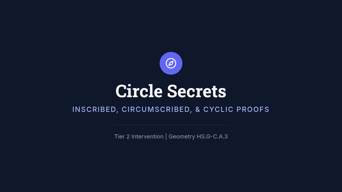 A small-group intervention lesson exploring inscribed angles, diameter relationships, and tangent-radius perpendicularity through dynamic exploration and scaffolded practice.