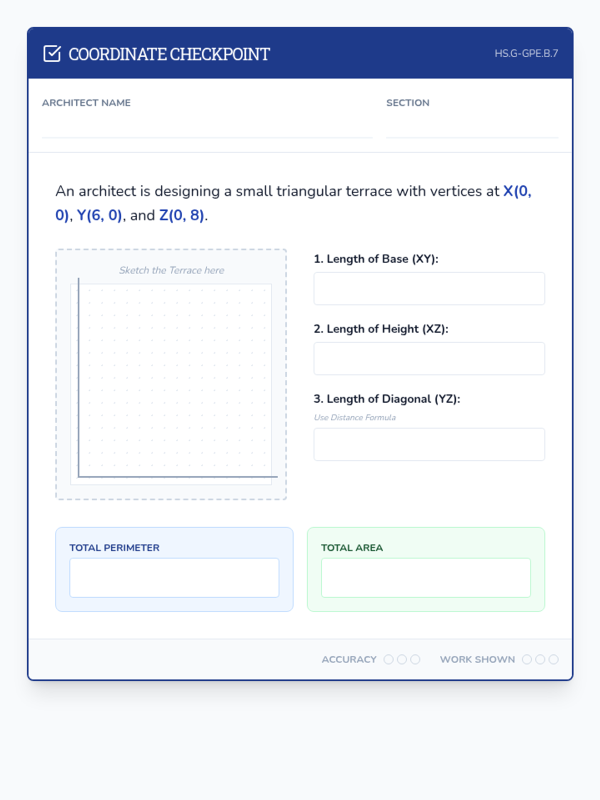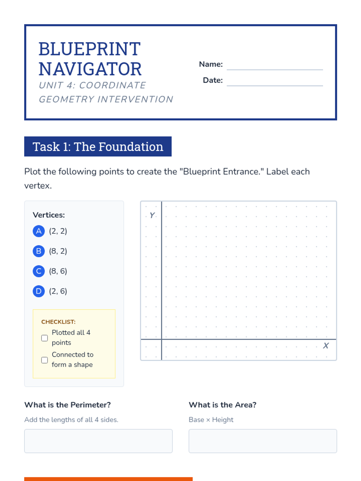 A targeted intervention lesson for high school students focusing on finding the perimeter and area of polygons on a coordinate plane using the distance formula and coordinate geometry. This lesson uses a 'Blueprint' theme to engage students in architectural measurement tasks.