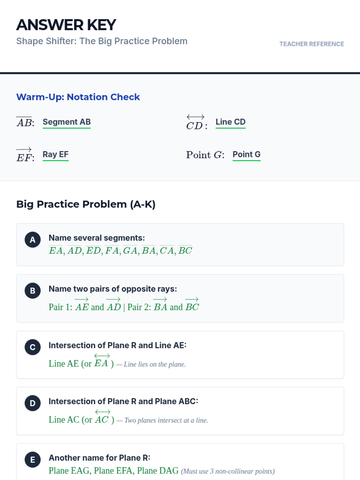 A foundational geometry lesson focusing on identifying points, lines, and planes using complex 3D diagrams, featuring a collaborative error analysis and rule-building closure.