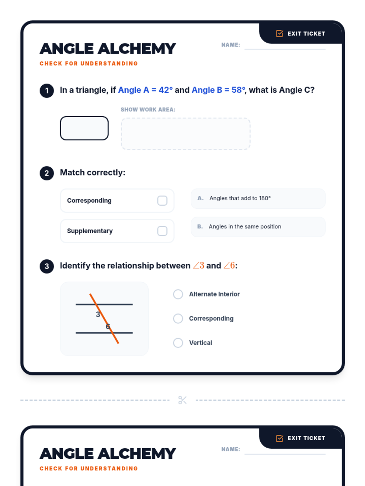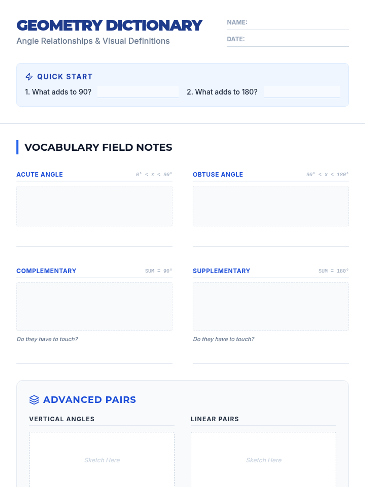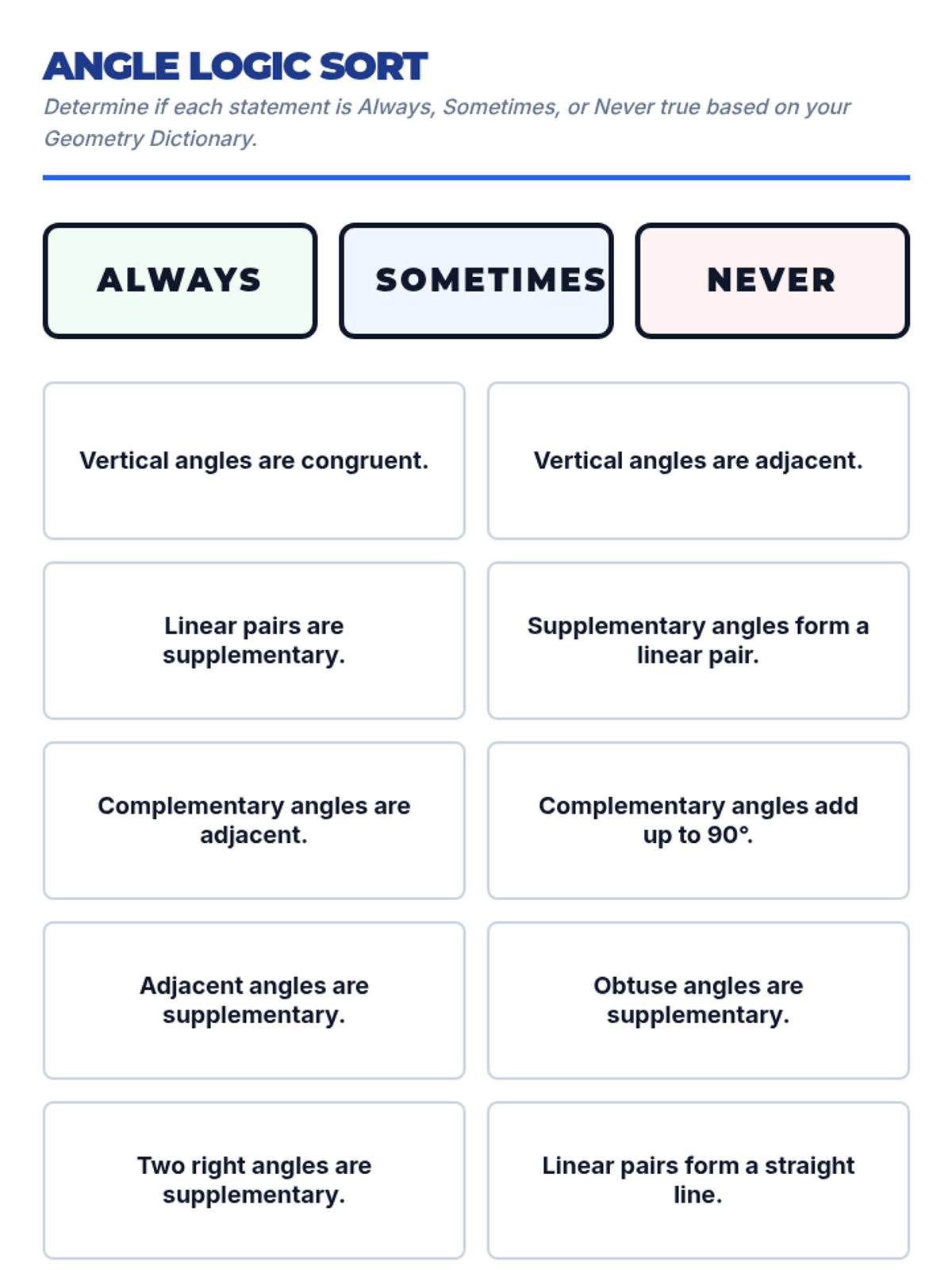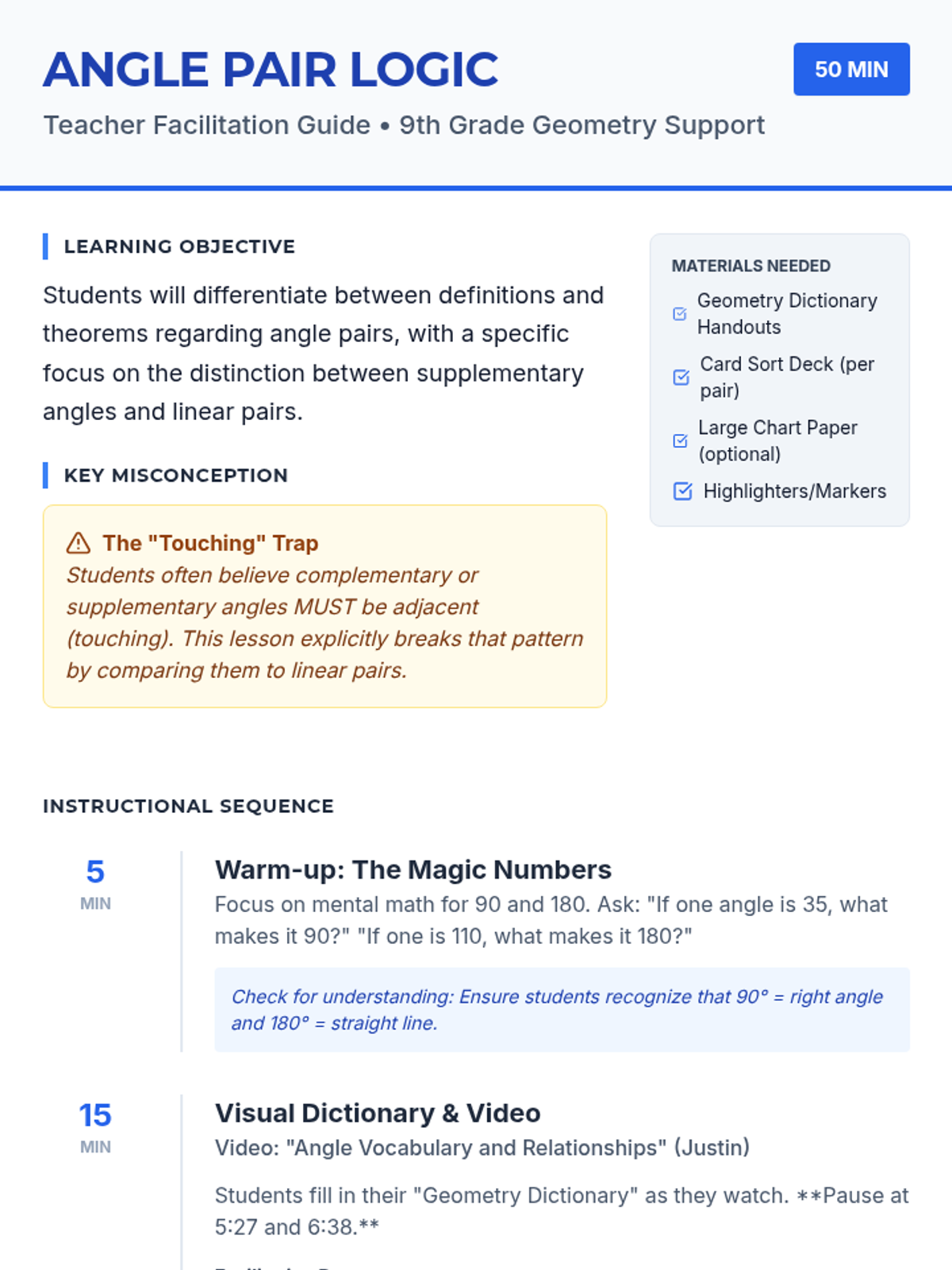 A support lesson focusing on the critical distinction between definitions and theorems of angle pairs, specifically clarifying that complementary and supplementary angles do not need to be adjacent. Students create a visual dictionary and engage in a logic-based card sort.