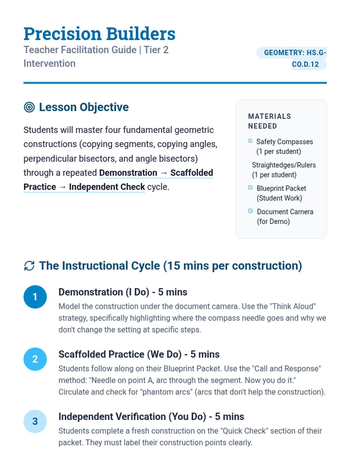A Tier 2 intervention lesson focused on mastering fundamental geometric constructions through demonstration and scaffolded practice. Students will learn to copy segments, copy angles, and bisect both using a compass and straightedge.