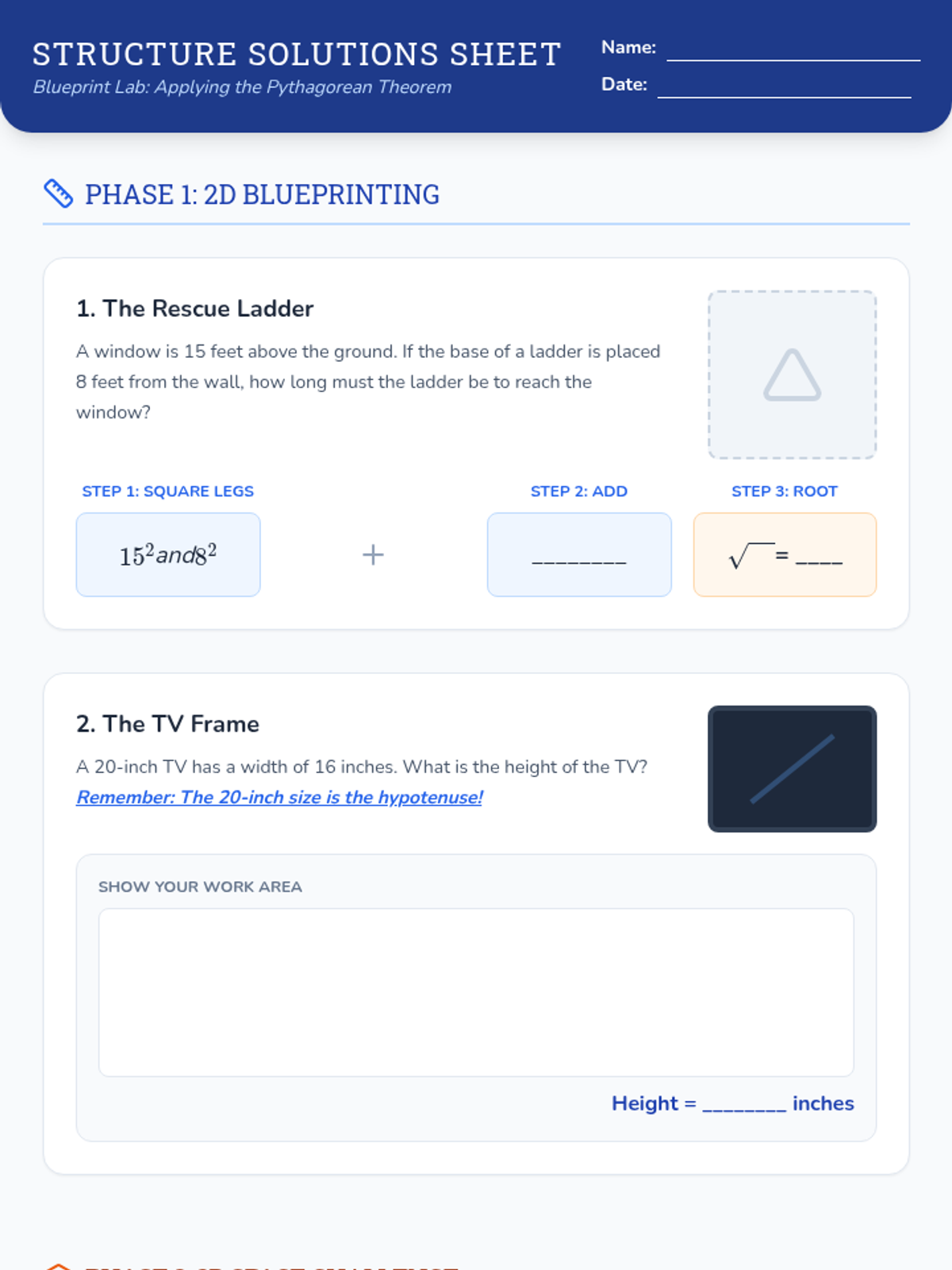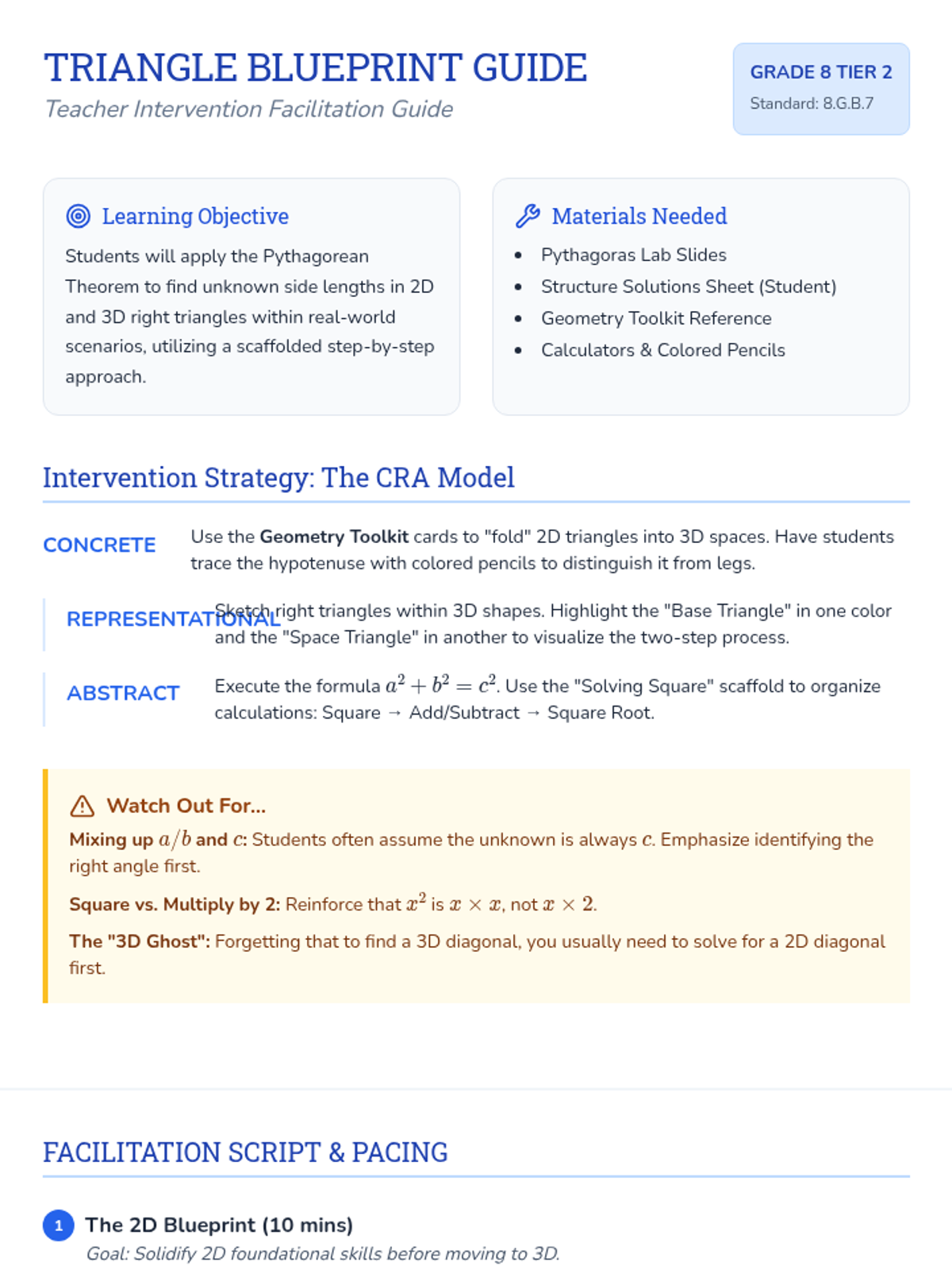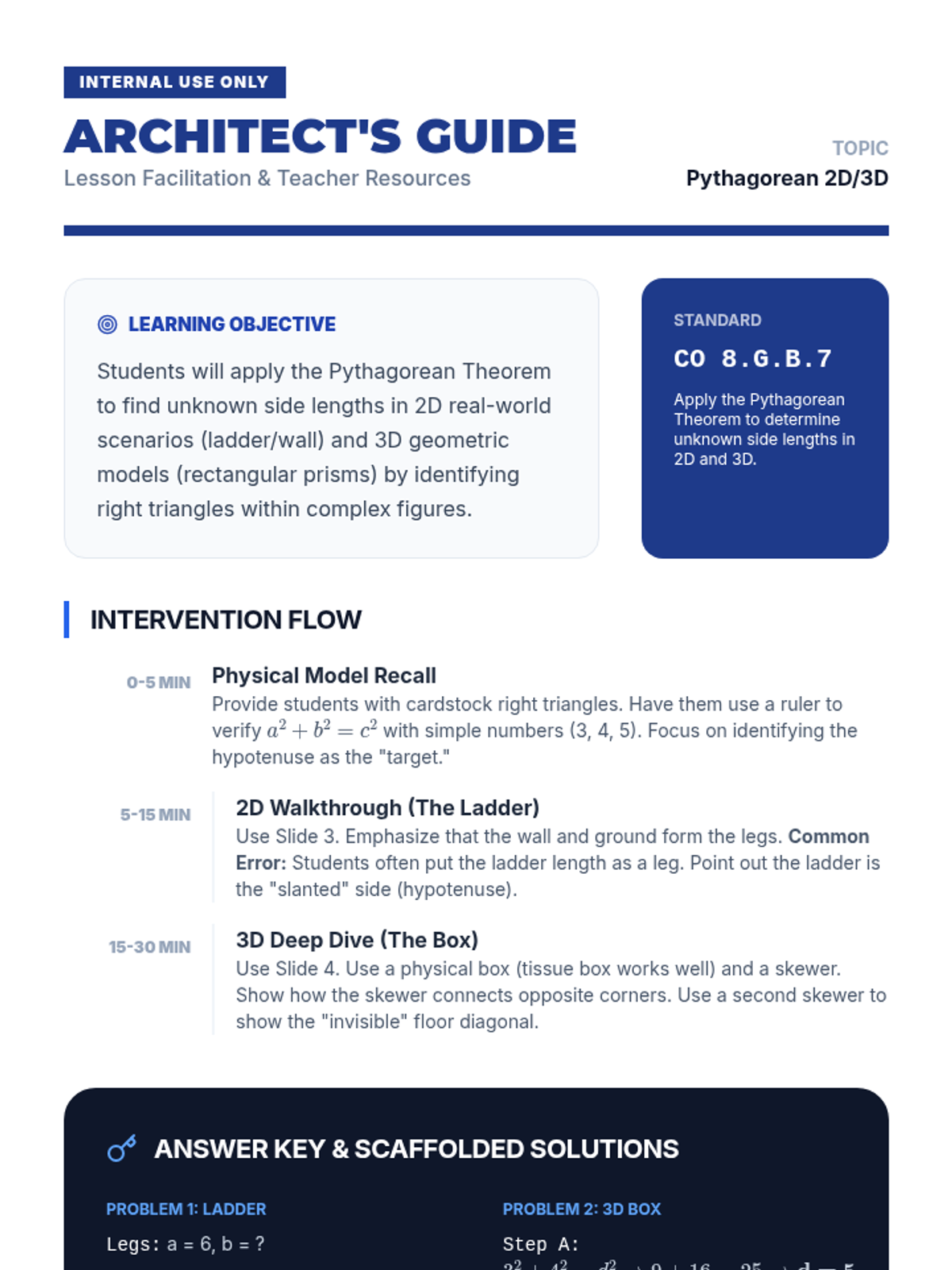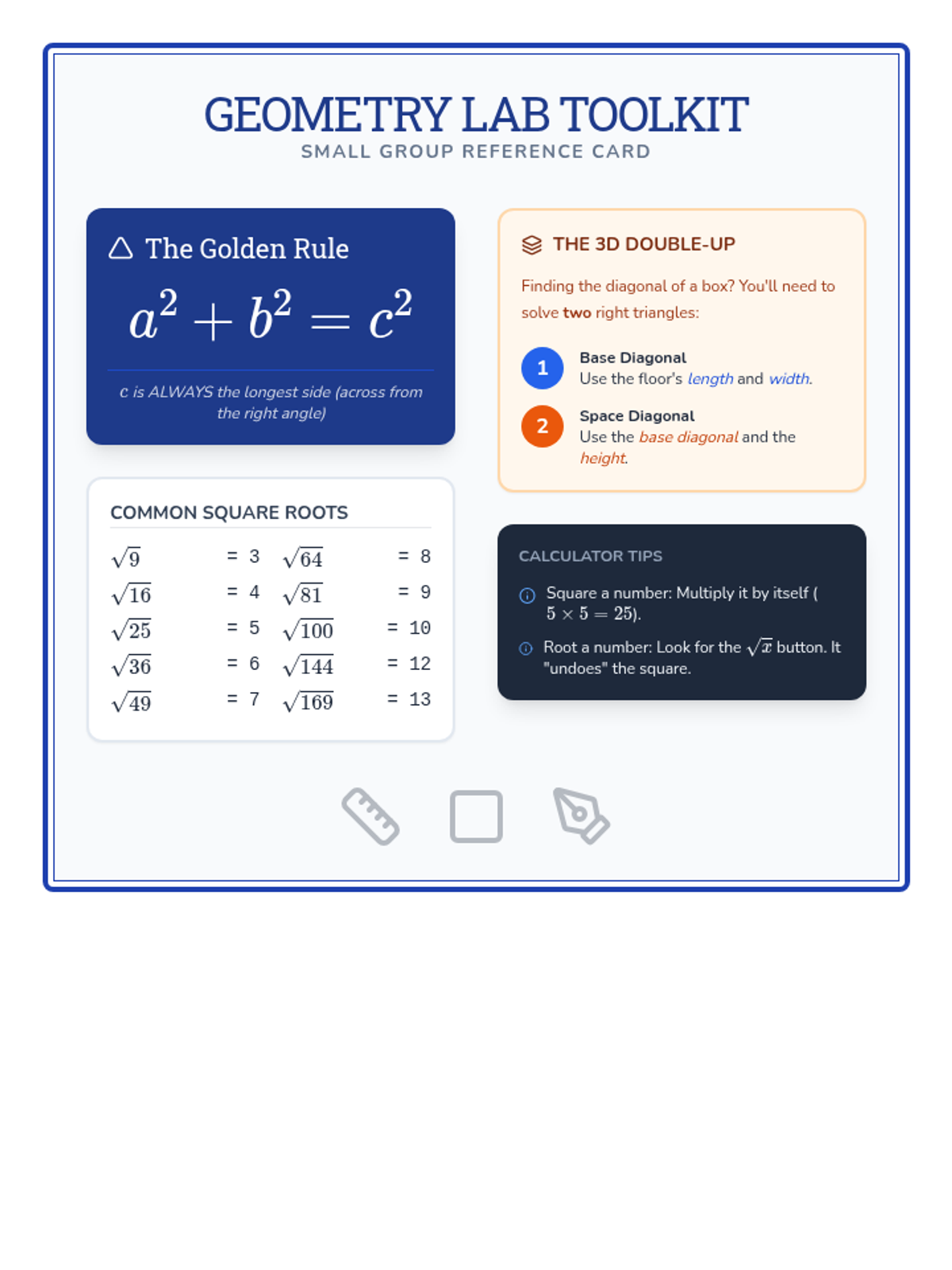 A targeted Tier 2 intervention lesson focusing on the practical application of the Pythagorean Theorem in 2D and 3D contexts, designed for small group support with scaffolded steps and visual aids.