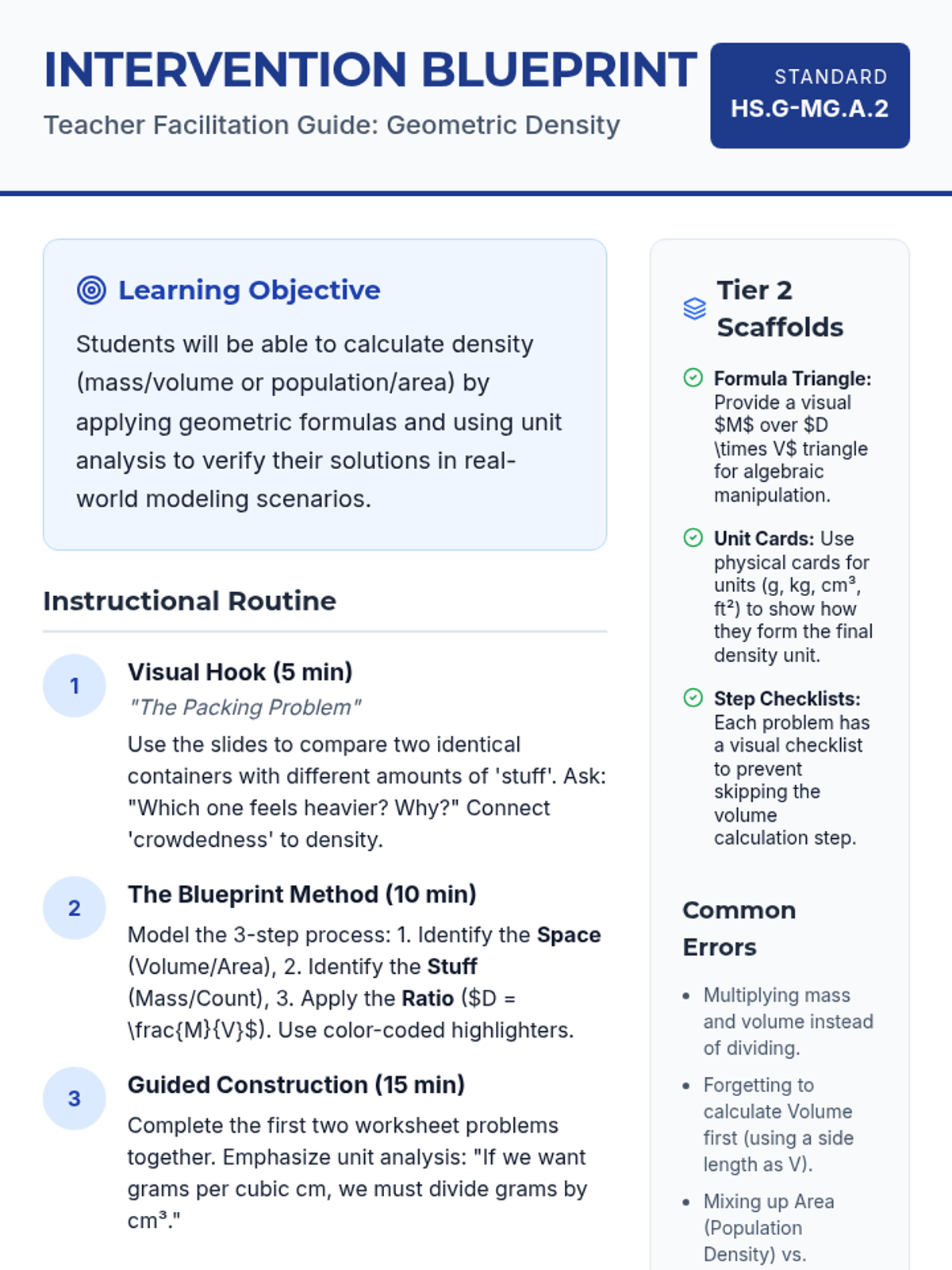 A Tier 2 intervention lesson focused on breaking down density problems through geometric measurement and unit analysis, using structured templates and visual scaffolding.