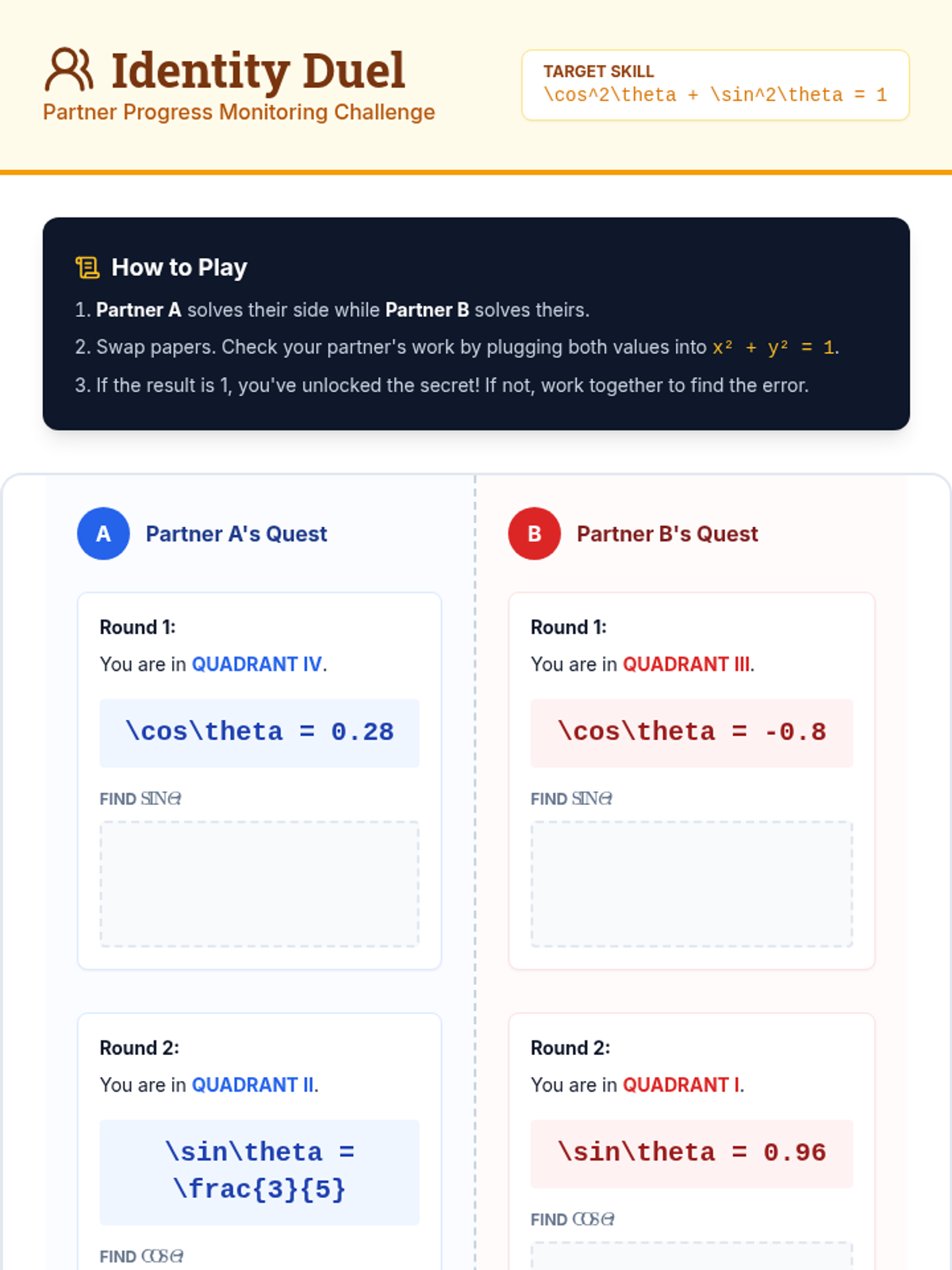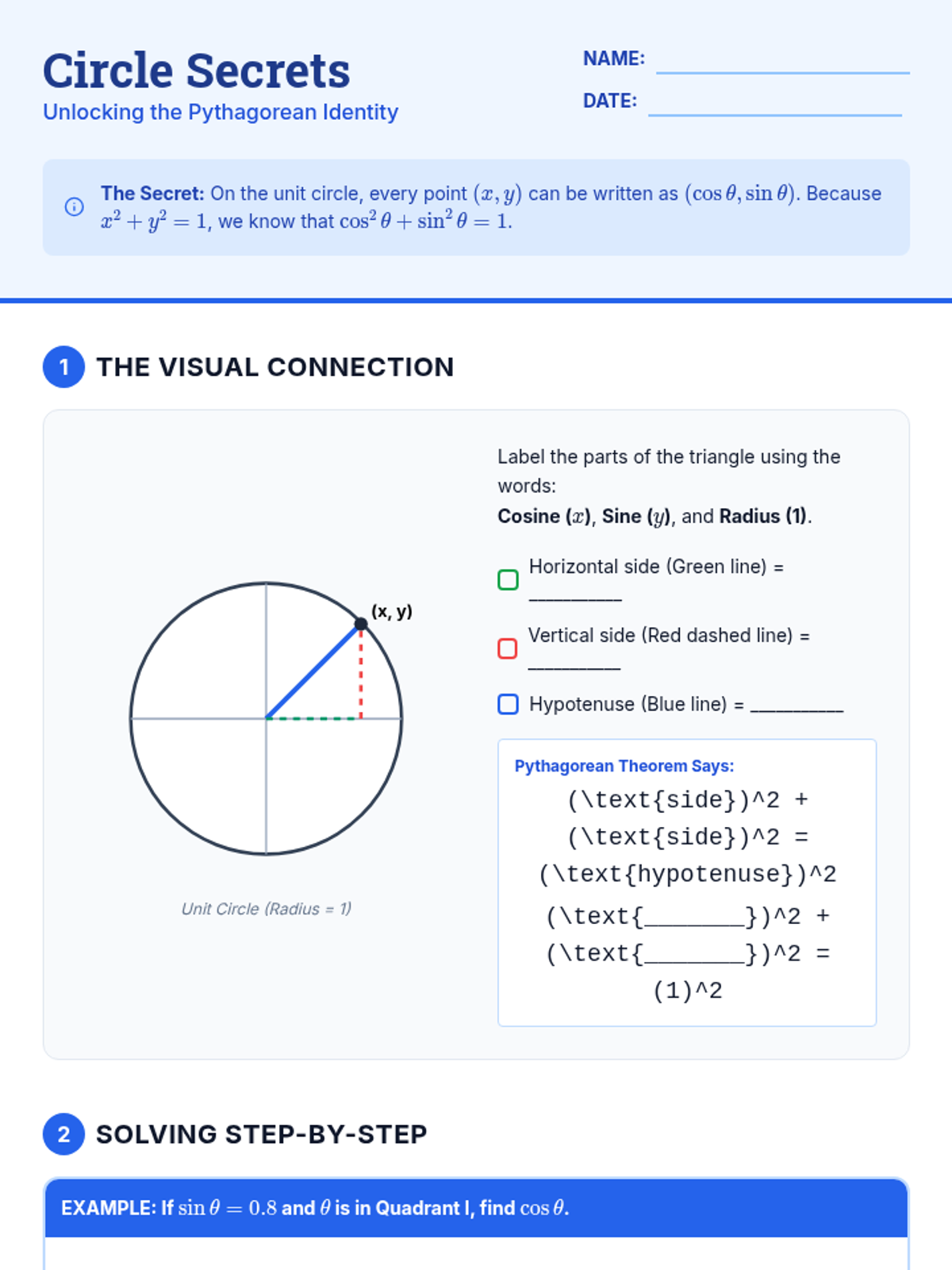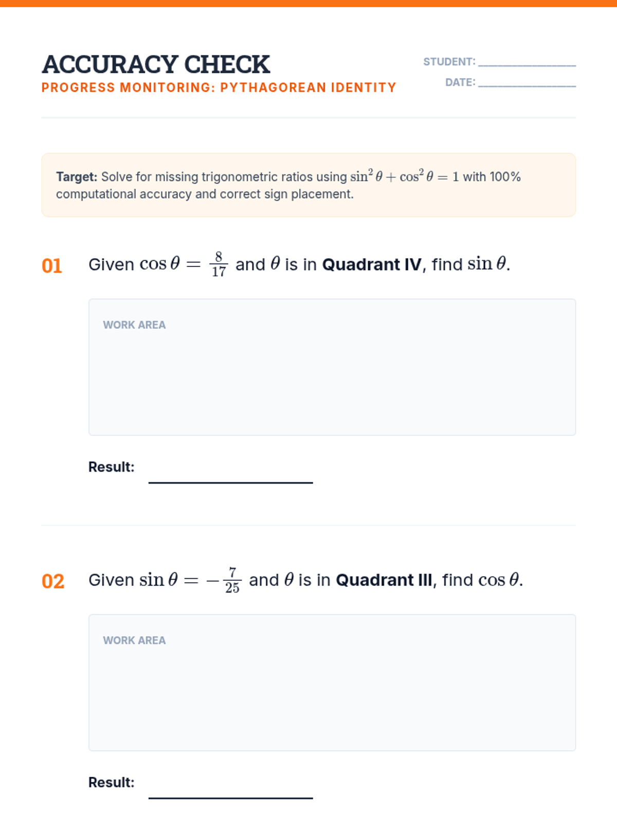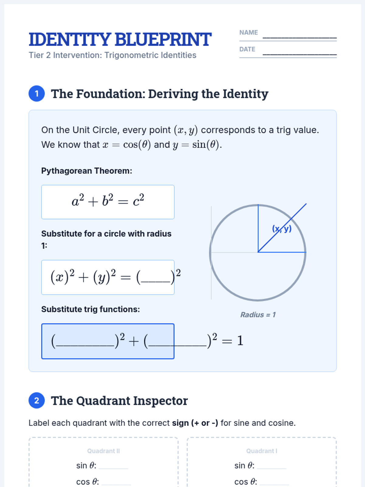 A Tier 2 small group intervention focused on deriving the Pythagorean identity and using it to find missing trigonometric ratios in specific quadrants. Includes scaffolded derivation, quadrant analysis, and structured practice.