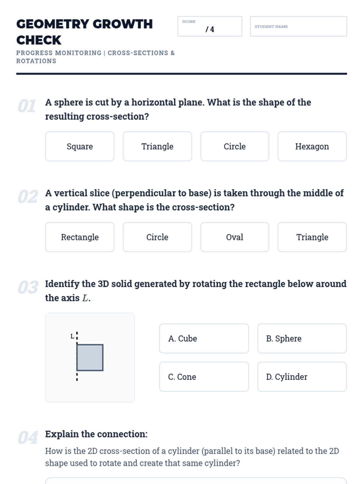 This lesson focuses on identifying cross-sections of prisms, pyramids, and cylinders, as well as visualizing the 3D solids formed by rotating 2D shapes about an axis. Includes hands-on modeling suggestions and scaffolded visual supports for Tier 2 intervention.