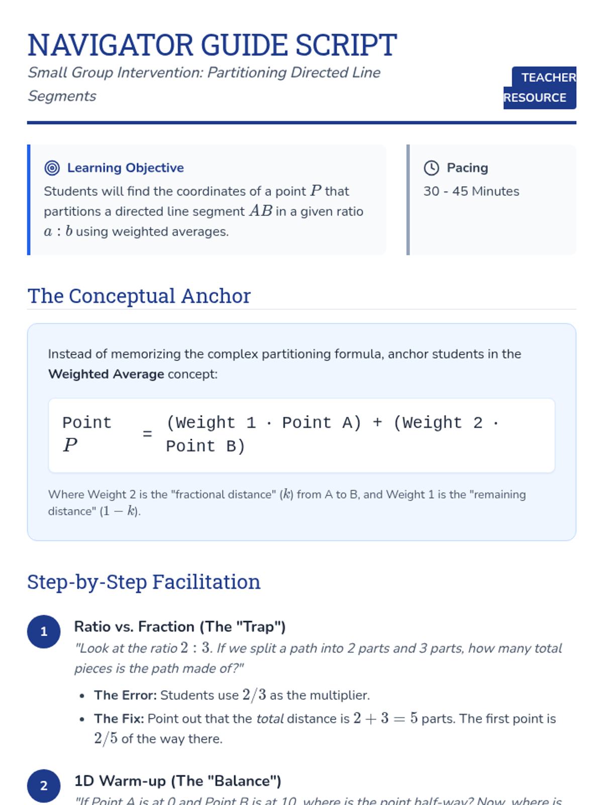 A Tier 2 intervention lesson designed to move students from 1D partitioning on a number line to 2D partitioning on a coordinate plane using the section formula. Includes explicit modeling and scaffolded practice.