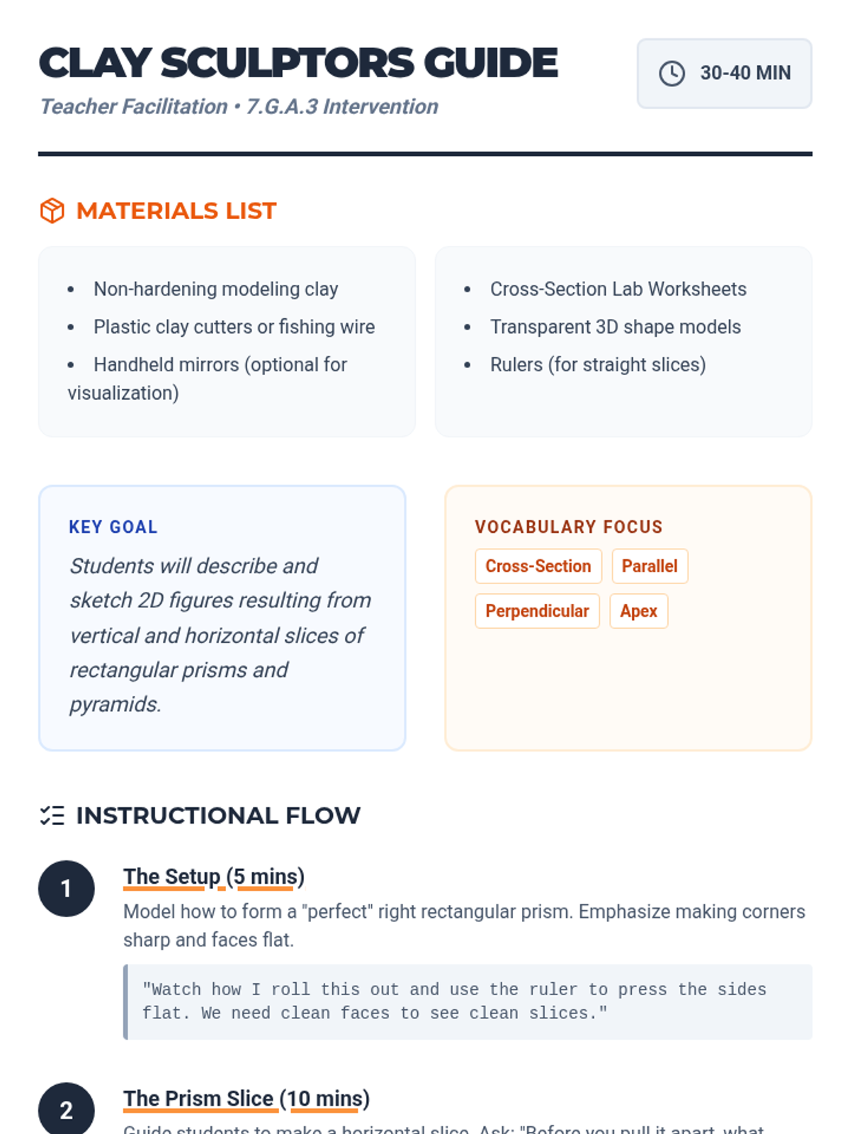 A Tier 2 intervention lesson focused on visualizing and describing 2D cross-sections of 3D figures using clay modeling, visual diagrams, and guided sketching.