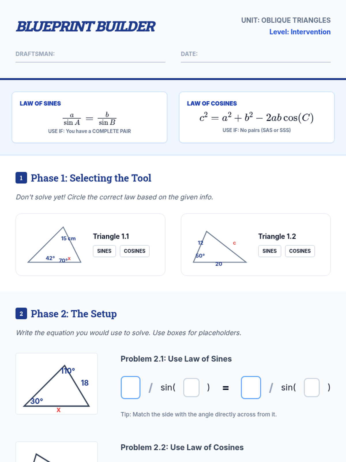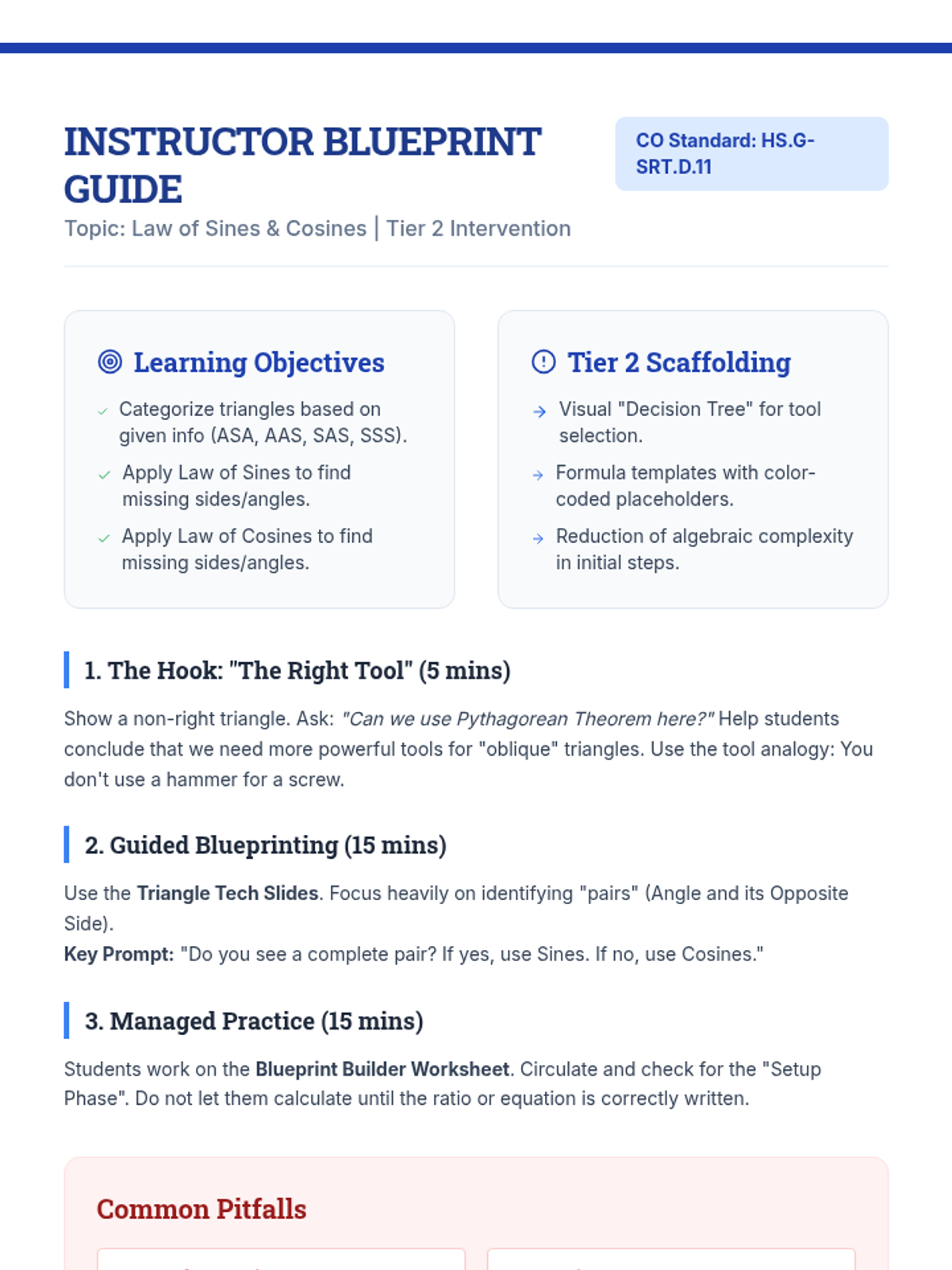 A targeted intervention lesson focusing on the Law of Sines and Law of Cosines. This lesson helps Tier 2 students identify when to use each law and provides scaffolded practice for solving unknown sides and angles in non-right triangles.