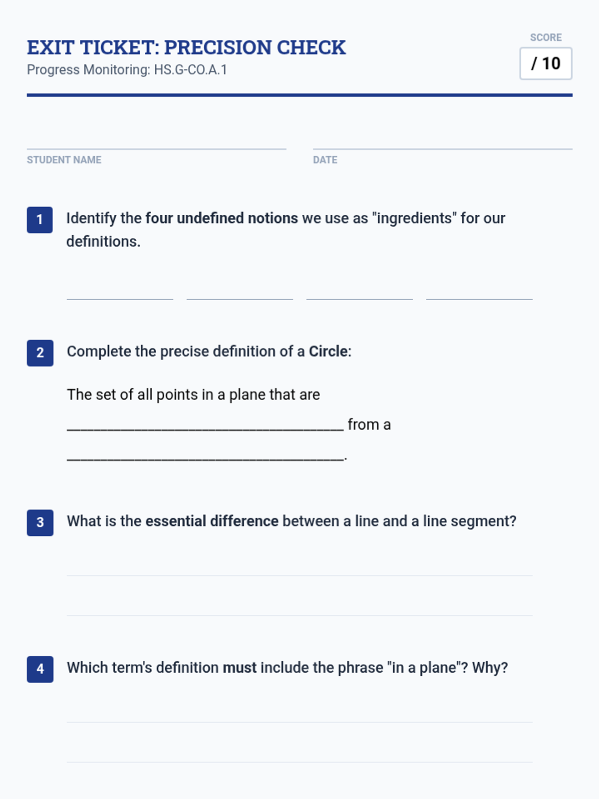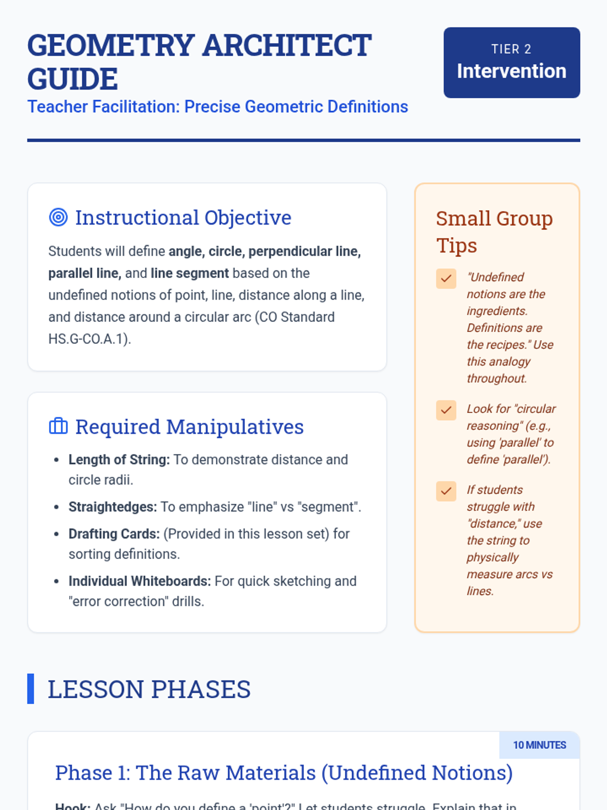 A Tier 2 intervention lesson focusing on the precise definitions of basic geometric terms (angle, circle, perpendicular line, parallel line, and line segment) using undefined notions. Designed for small group instruction with hands-on scaffolding.