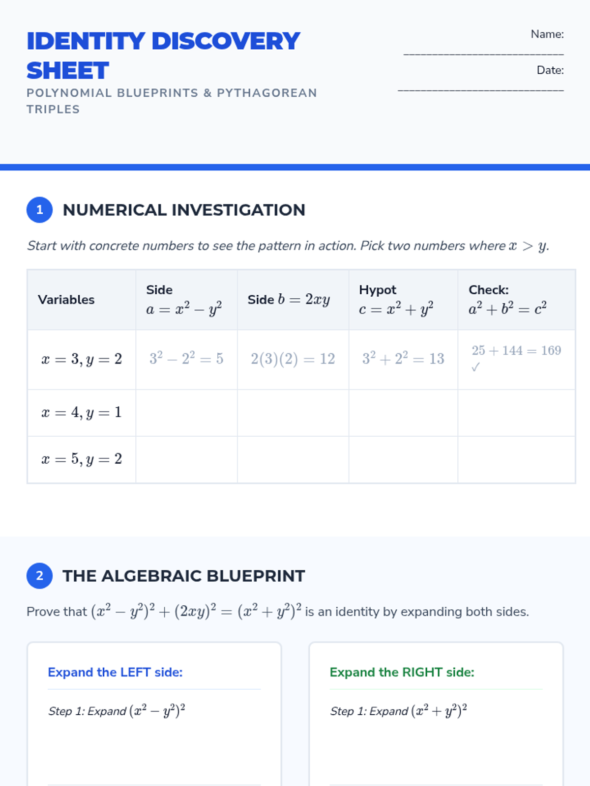 A Tier 2 intervention lesson focused on proving polynomial identities and using them to generate Pythagorean triples. The lesson transitions from concrete numerical examples to formal algebraic verification, providing scaffolded support for high school students.