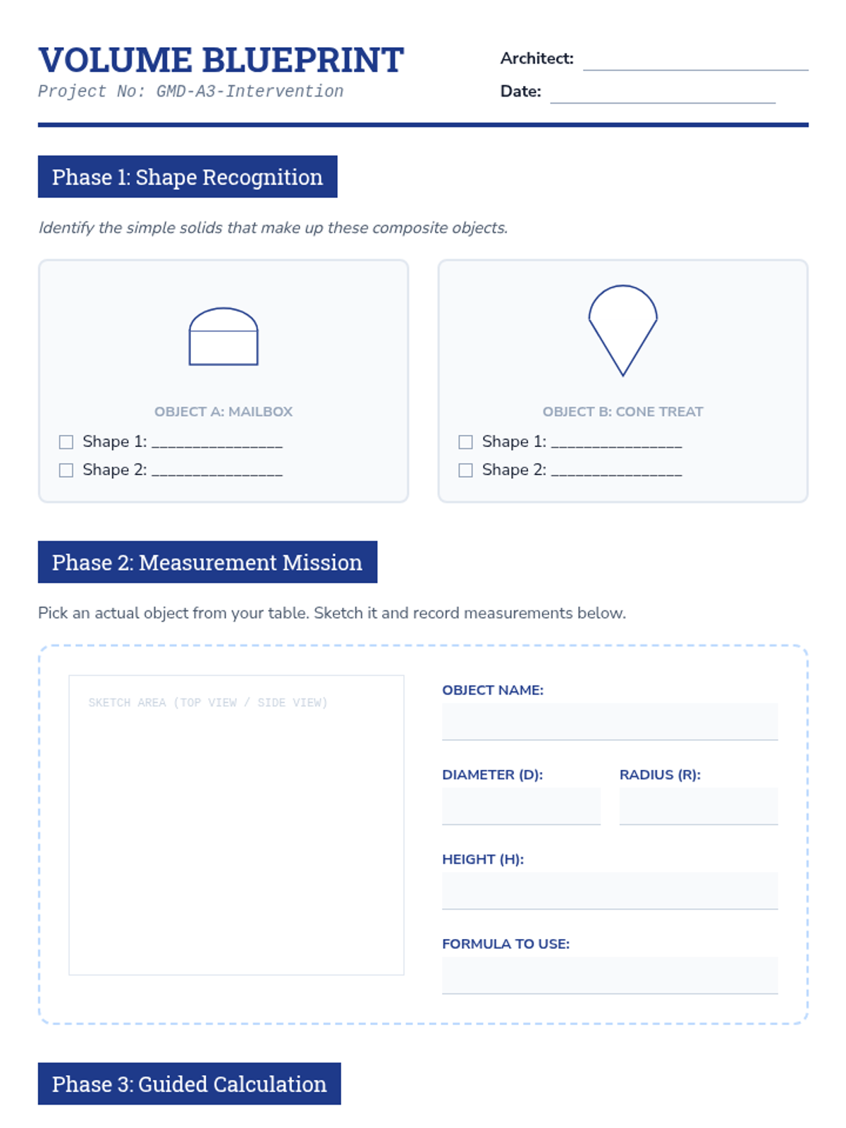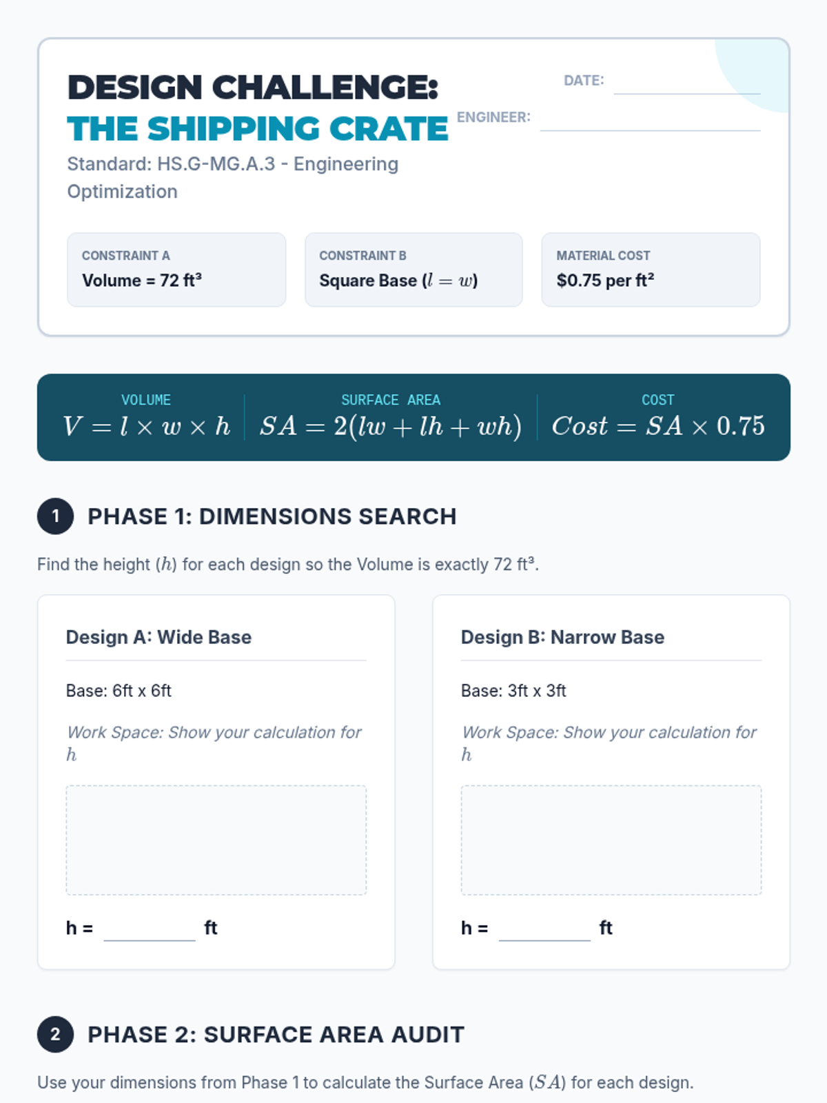A geometry intervention focused on solving real-world design problems. Students will apply surface area and volume concepts to minimize costs and respect physical constraints in engineering scenarios.
