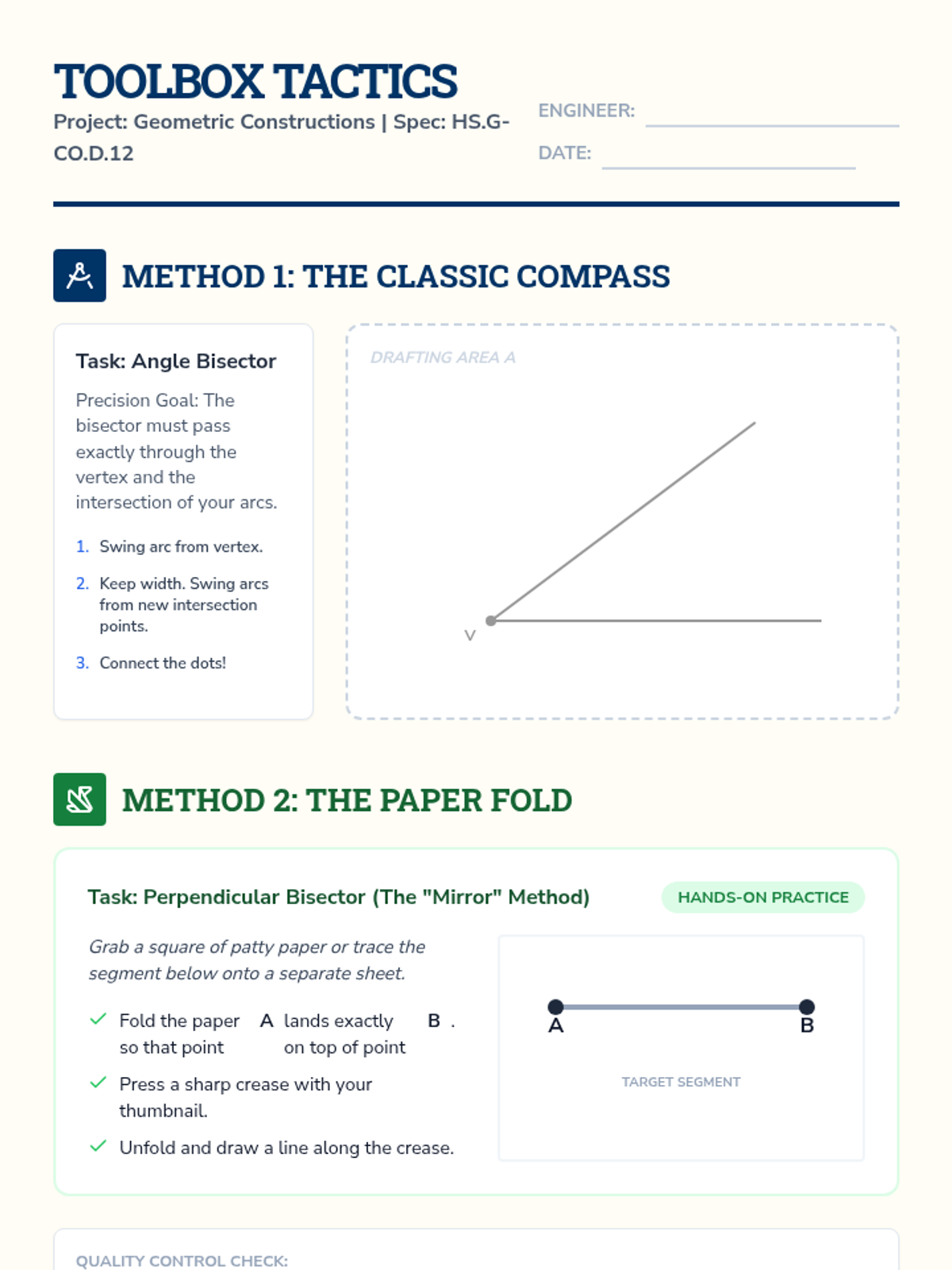 A Tier 2 intervention lesson focusing on geometric constructions using various tools. Students explore precision through compass and straightedge, paper folding, and dynamic software.