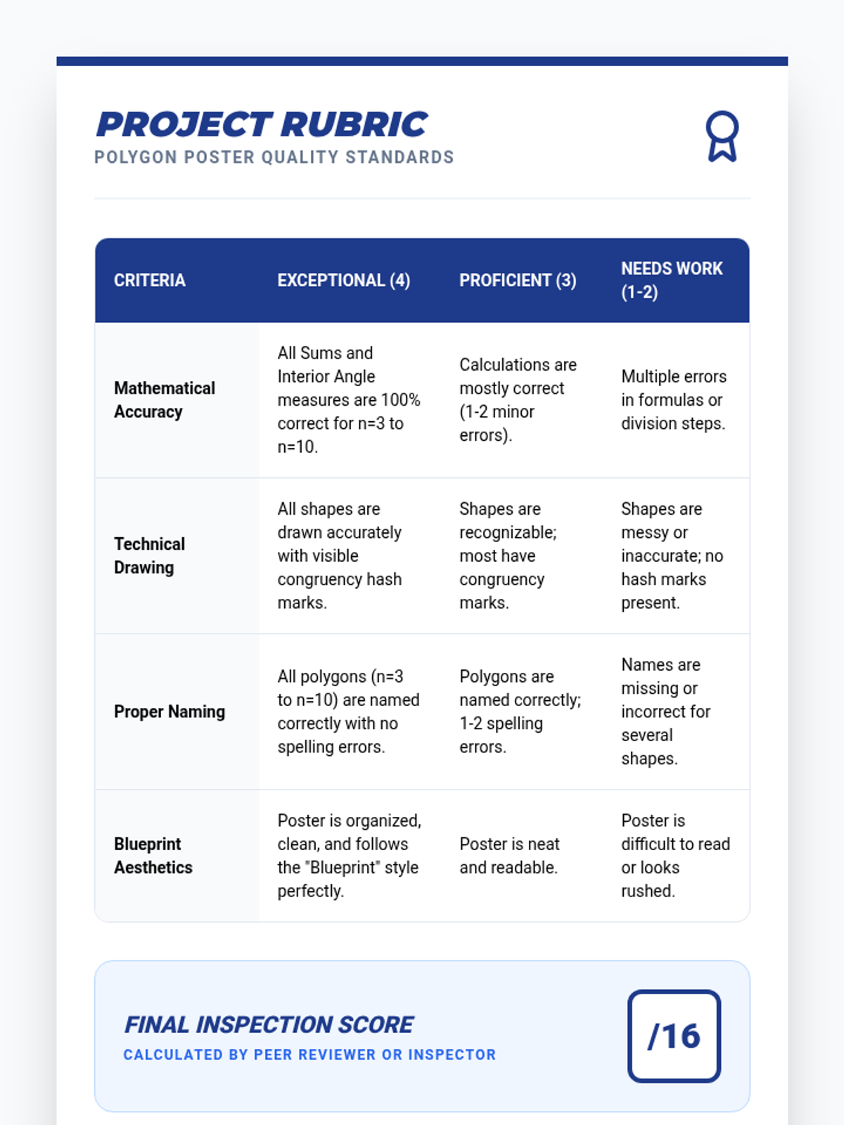 A high school math intervention lesson focused on polygon properties, interior angle formulas, and real-world geometry applications through a creative poster project.