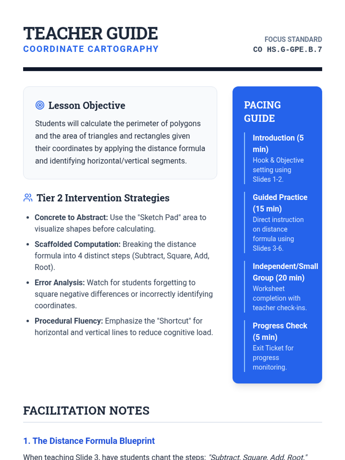 A Tier 2 intervention lesson focused on calculating perimeter and area of polygons using the distance formula on a coordinate plane. Designed for high school students needing scaffolded support with CO Standard HS.G-GPE.B.7.