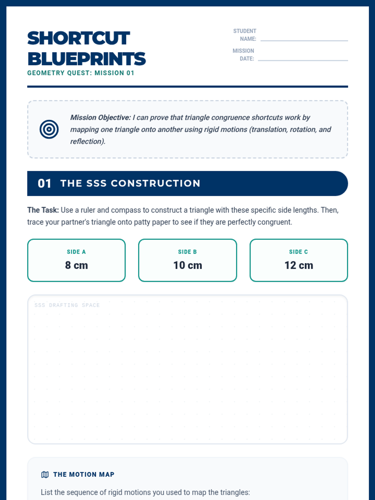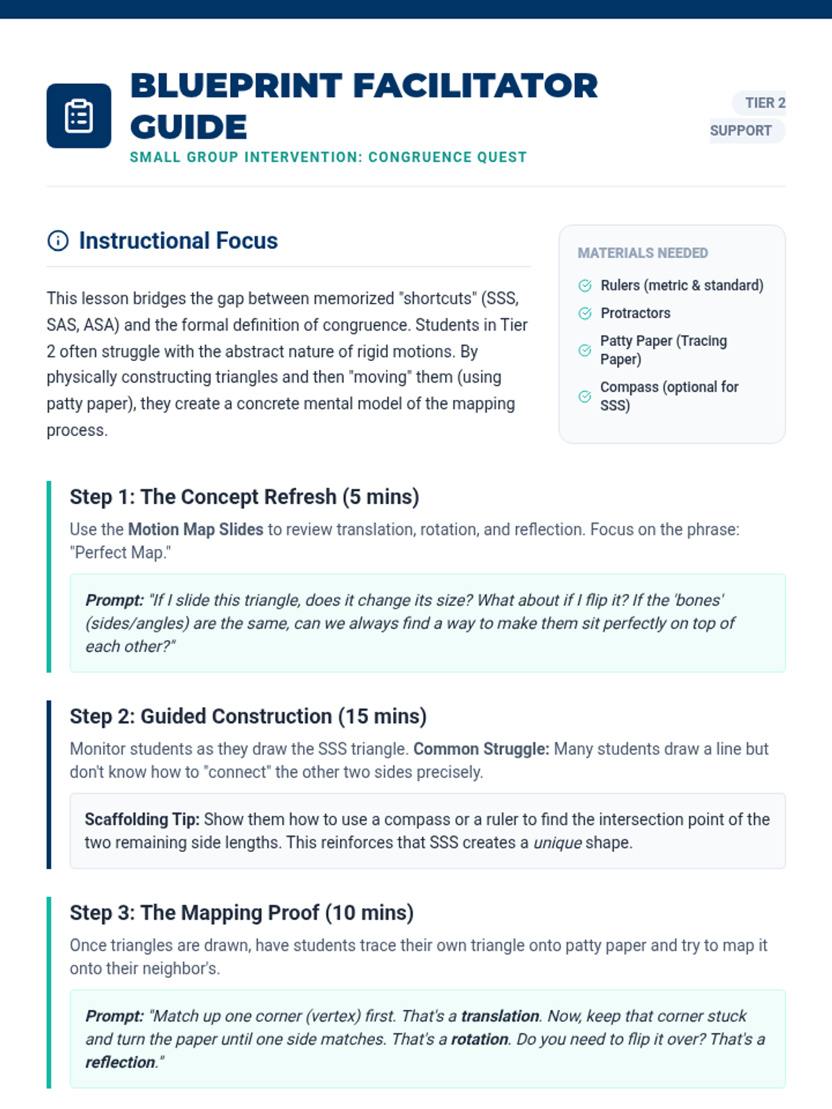 A targeted Tier 2 intervention lesson focusing on the conceptual bridge between triangle congruence shortcuts and rigid motions through hands-on construction and mapping.