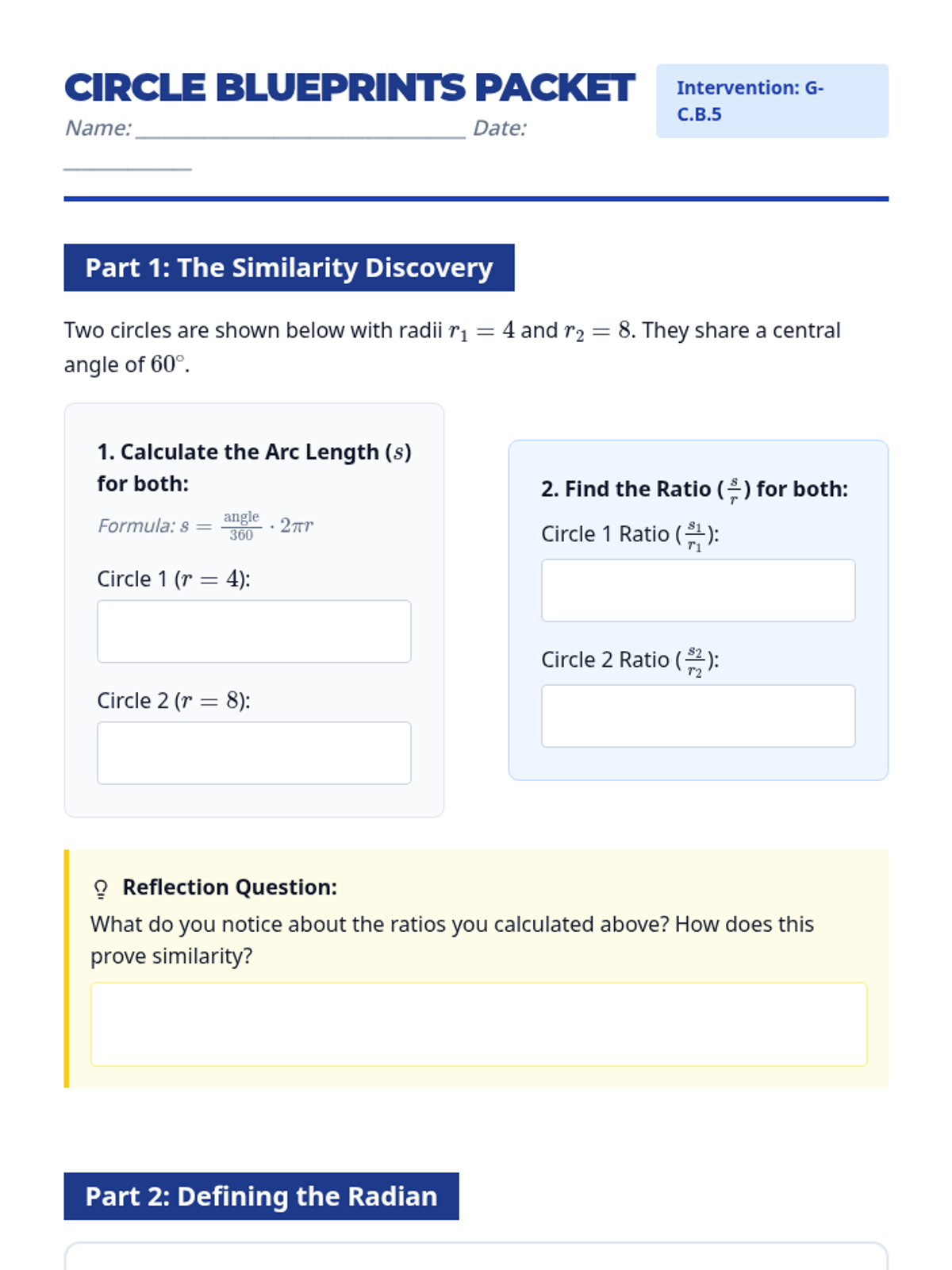 A targeted small group intervention lesson focused on deriving circle formulas using similarity, defining radians, and calculating sector areas with scaffolded support.