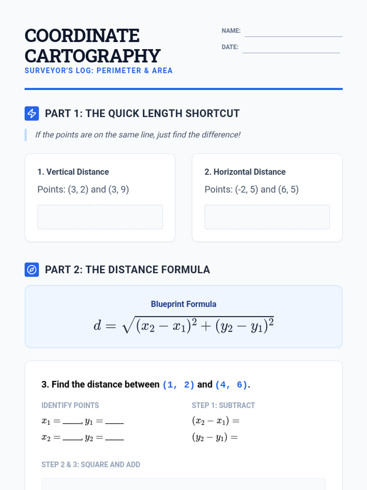Students will master the distance formula by substituting coordinates to find segment lengths, featuring a collaborative relay activity and video-guided practice.