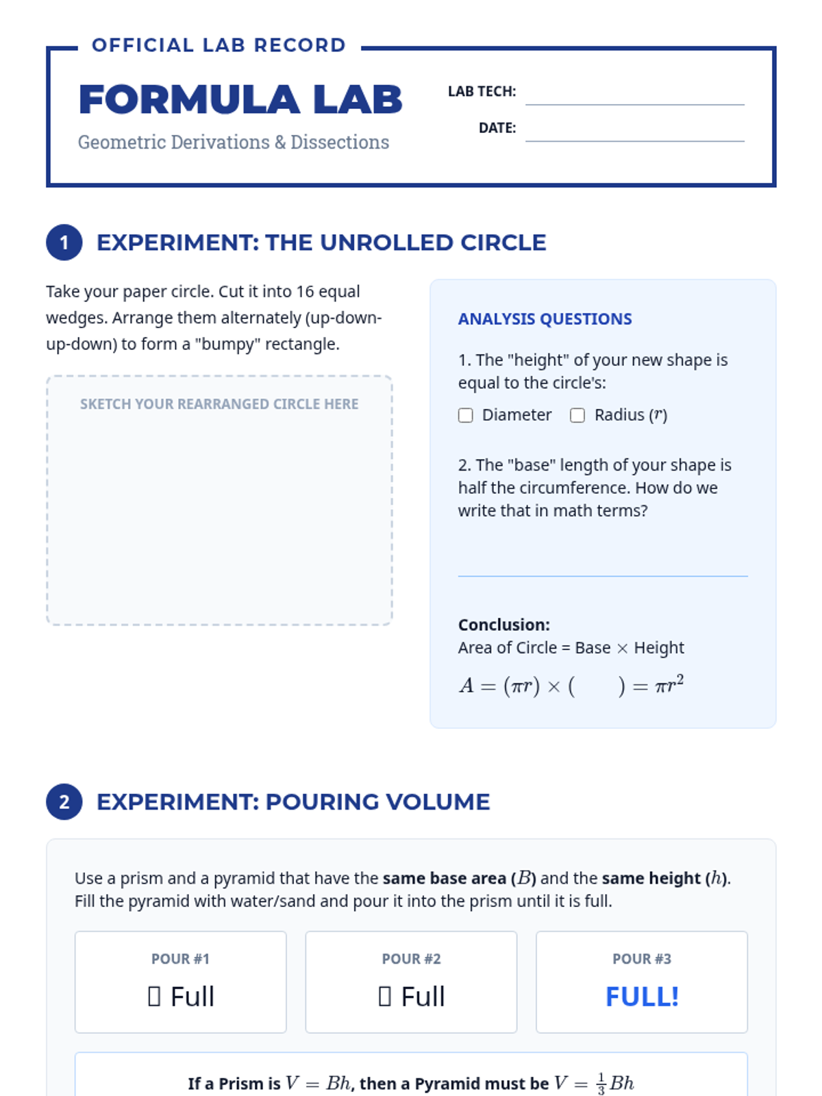 A targeted small-group intervention focused on deriving formulas for circle area and solid volumes through hands-on dissection and comparison. This lesson helps students move beyond memorization to conceptual understanding of G-GMD.A.1.
