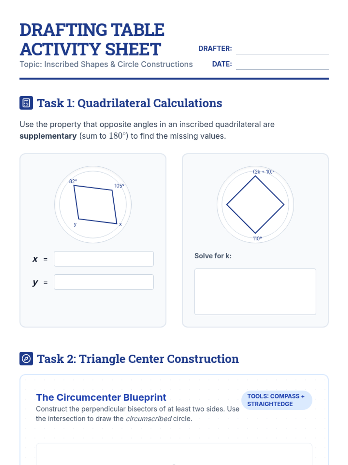A targeted Tier 2 intervention lesson focusing on the properties of inscribed quadrilaterals and the construction of triangle centers (circumcenter and incenter). Students use compass and straightedge tools to explore geometric relationships and complete scaffolded proofs.