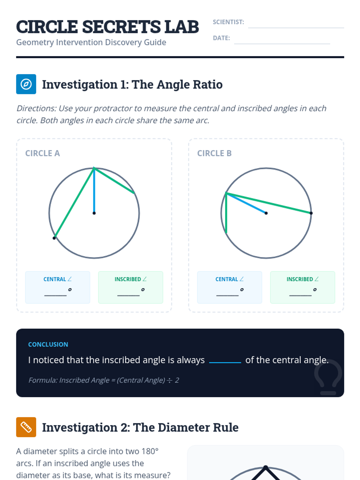 A Tier 2 geometry intervention lesson focusing on the discovery of inscribed angles, central angles, and chord-radius relationships through hands-on measurement and guided inquiry.