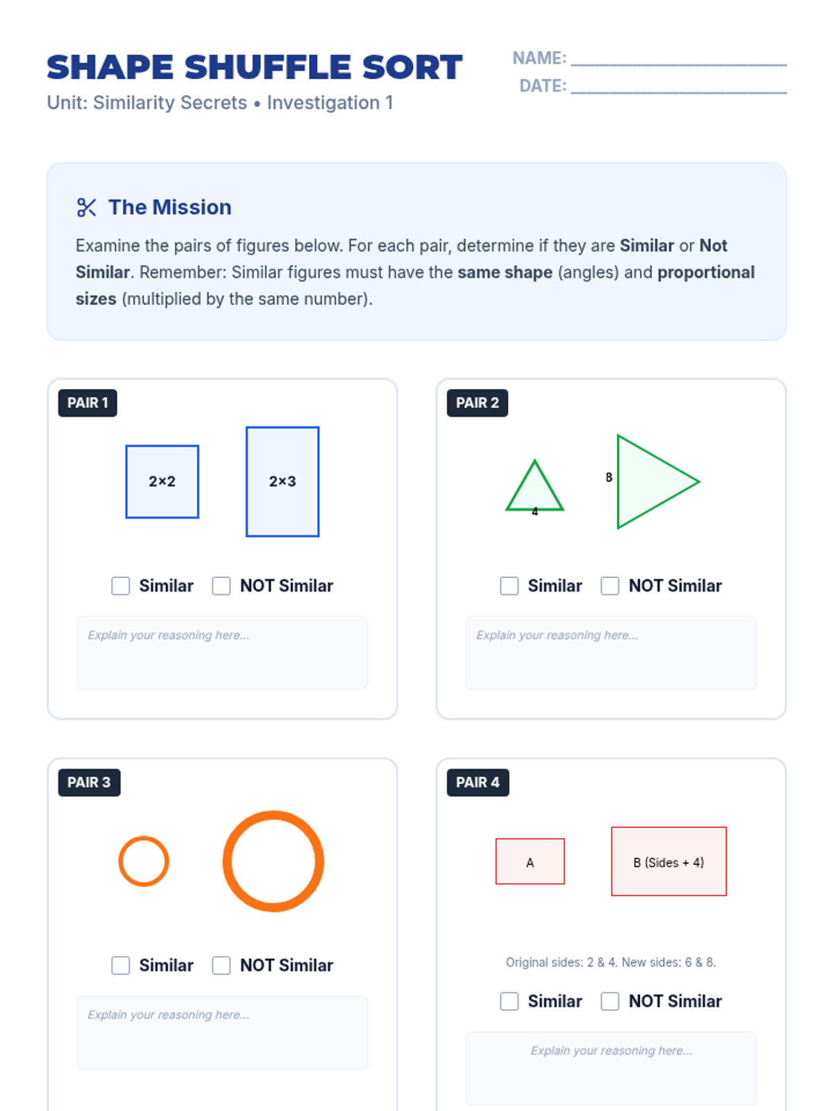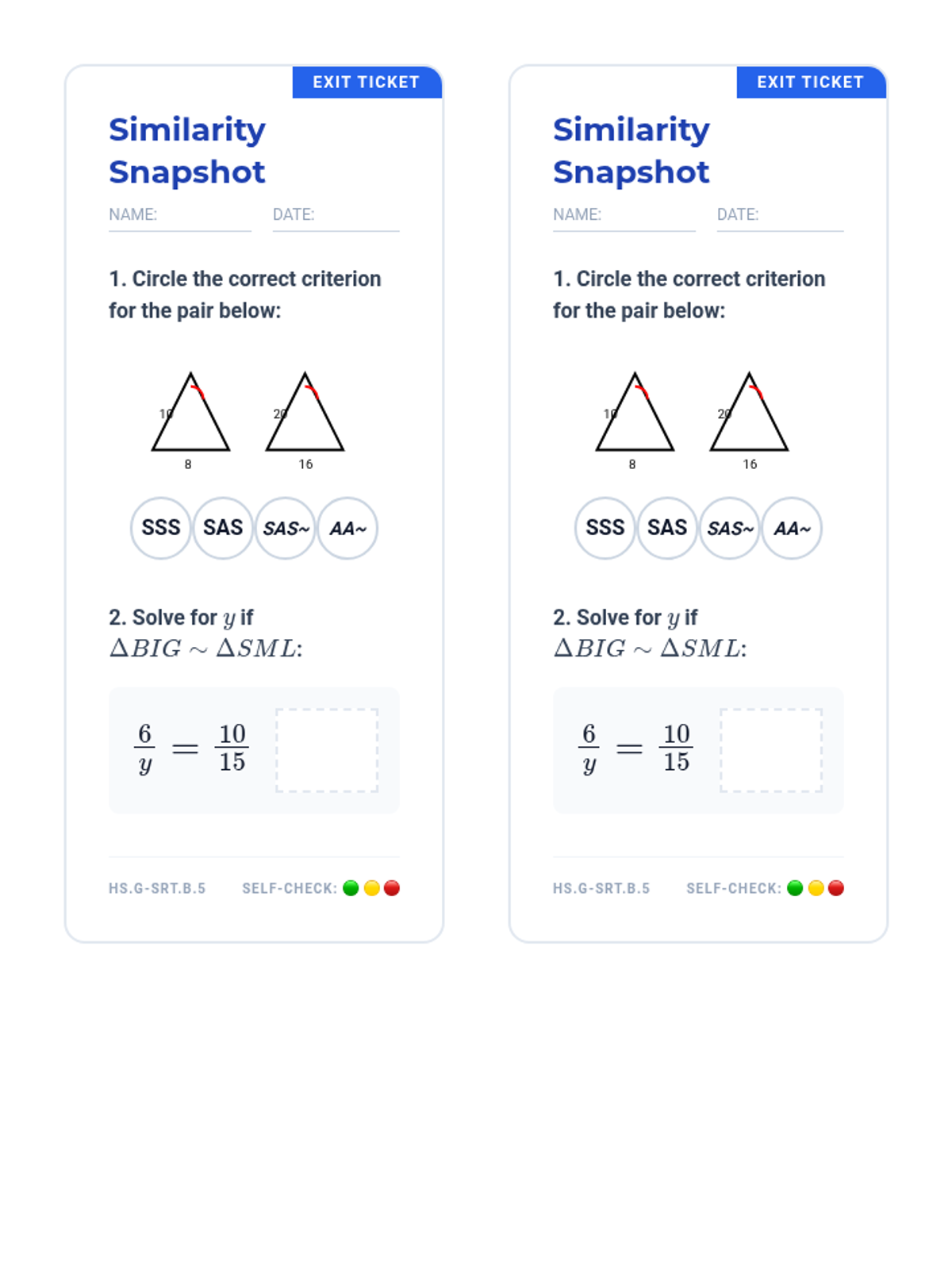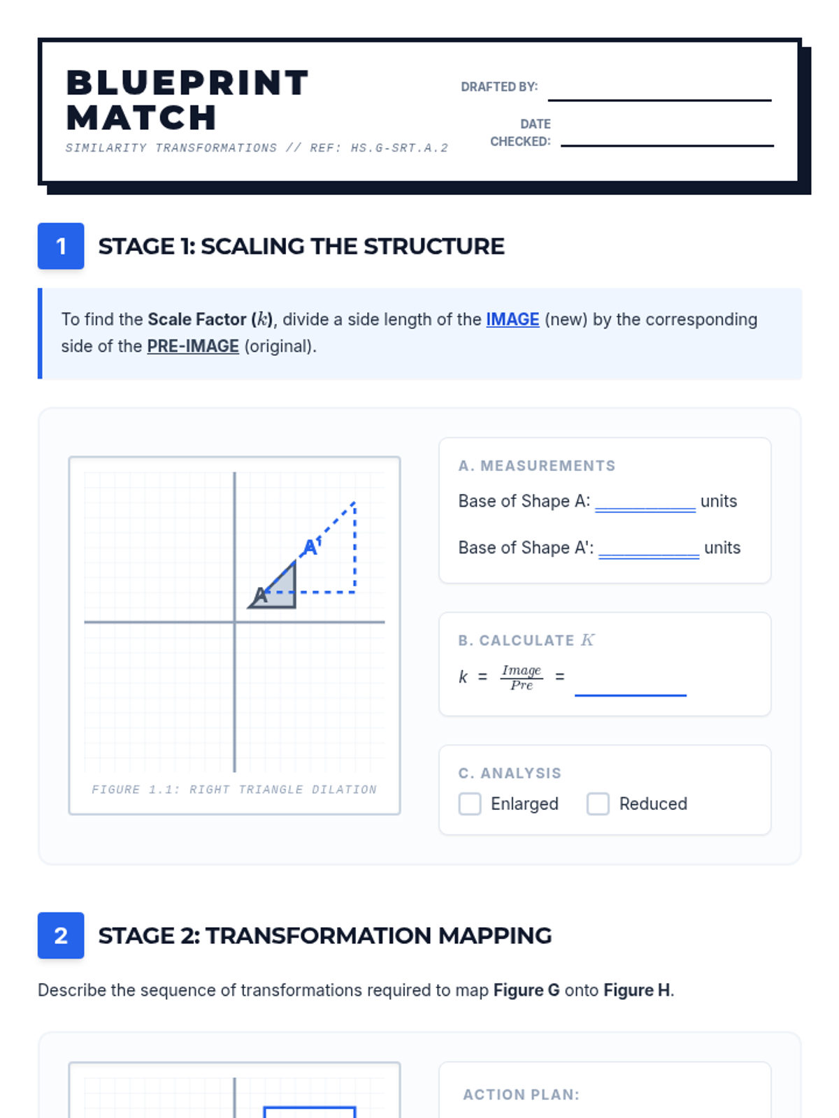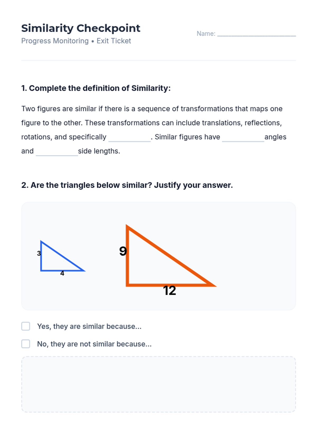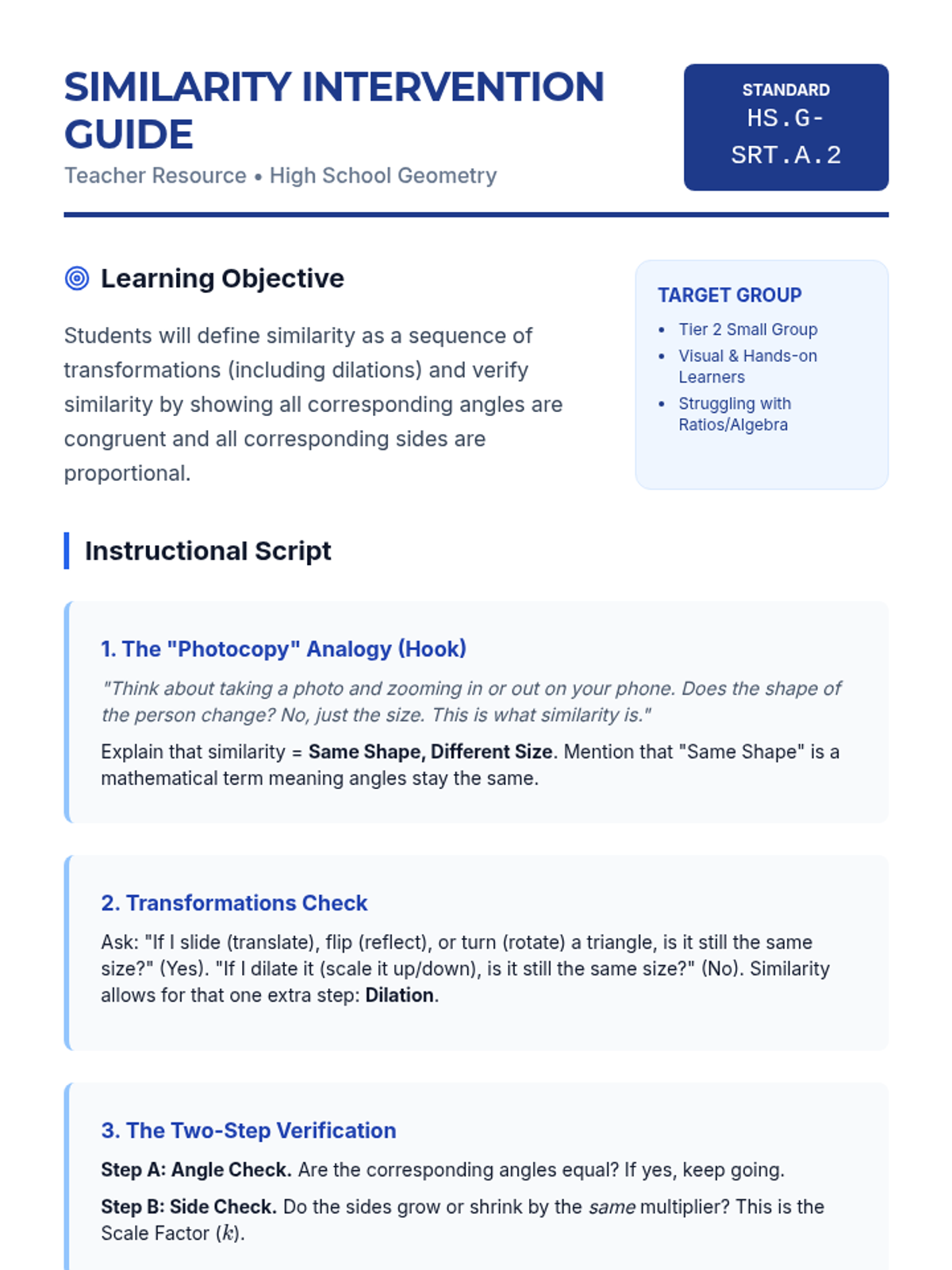 A targeted Tier 2 intervention lesson focusing on defining similarity through transformations and verifying it through angle and side ratio comparisons. Designed for high school students who need structured support with HS.G-SRT.A.2.