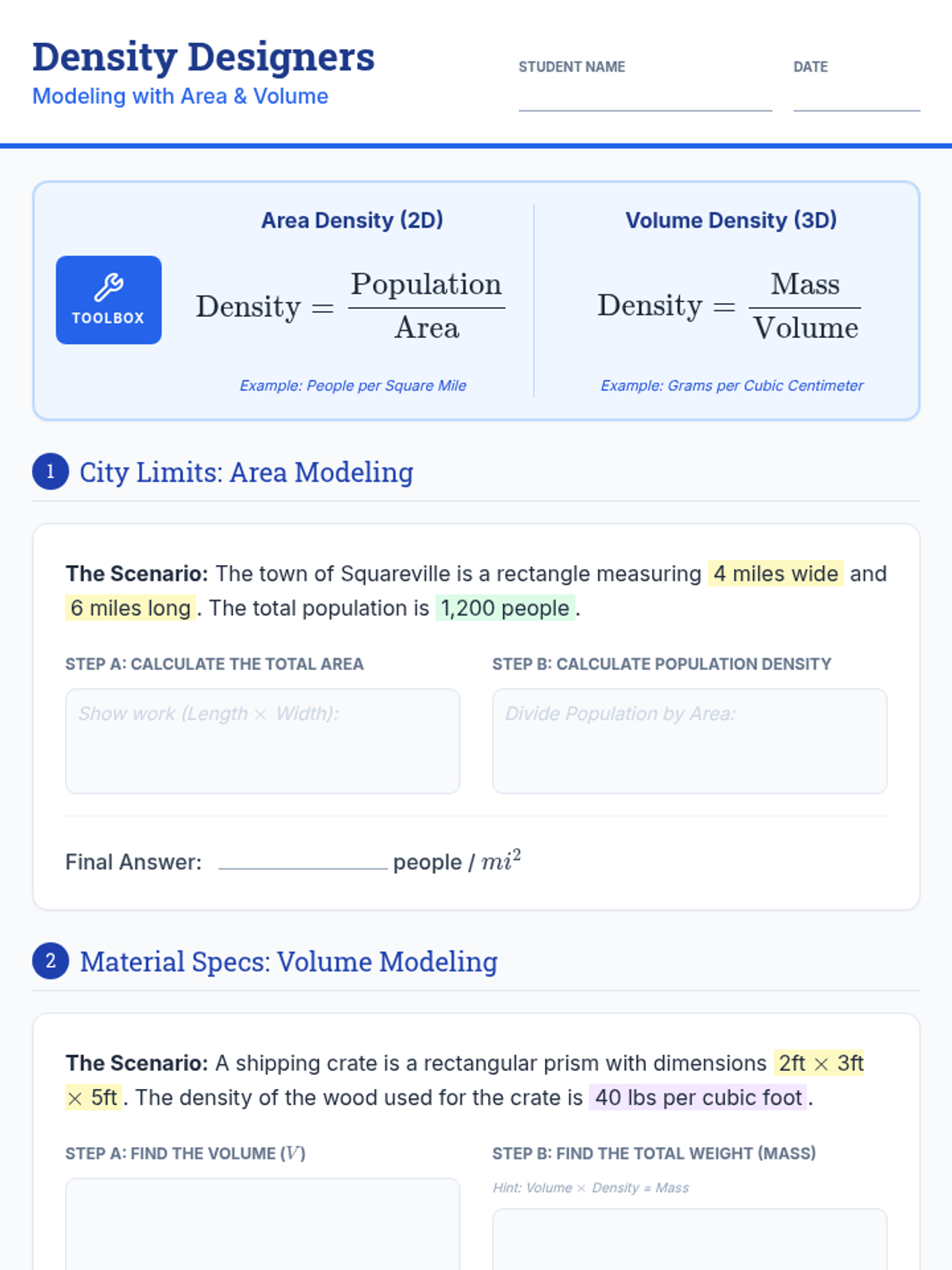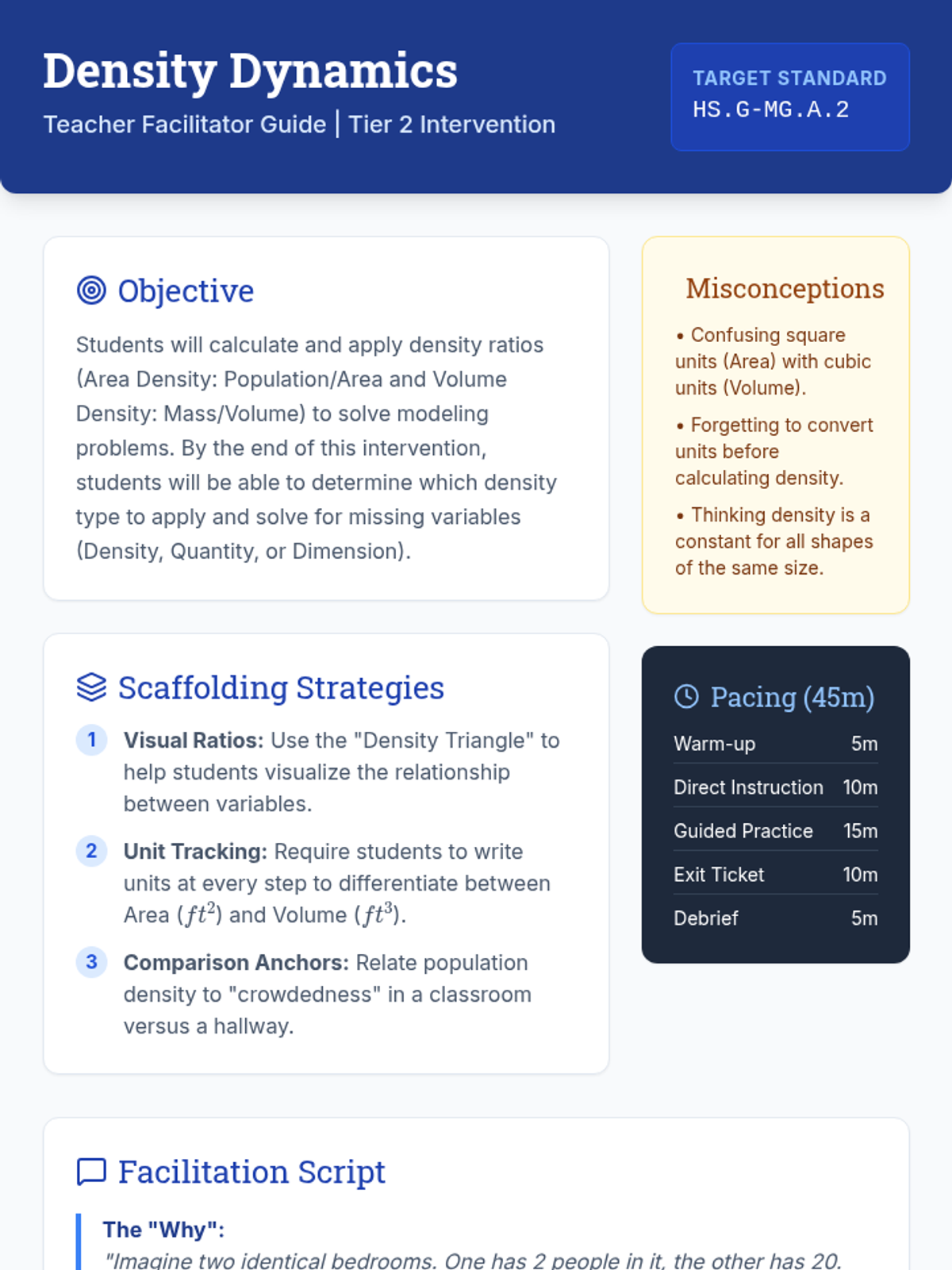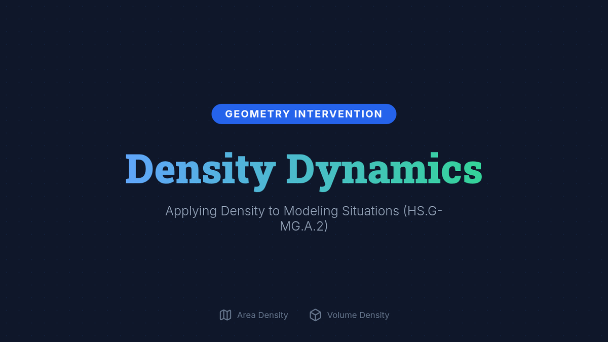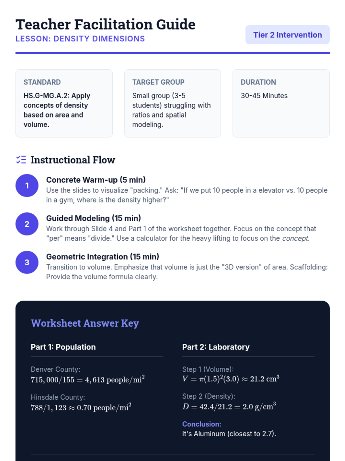 A Tier 2 intervention lesson focused on mastering density concepts using area and volume. Students will use modeling to solve real-world problems like population density and material mass.
