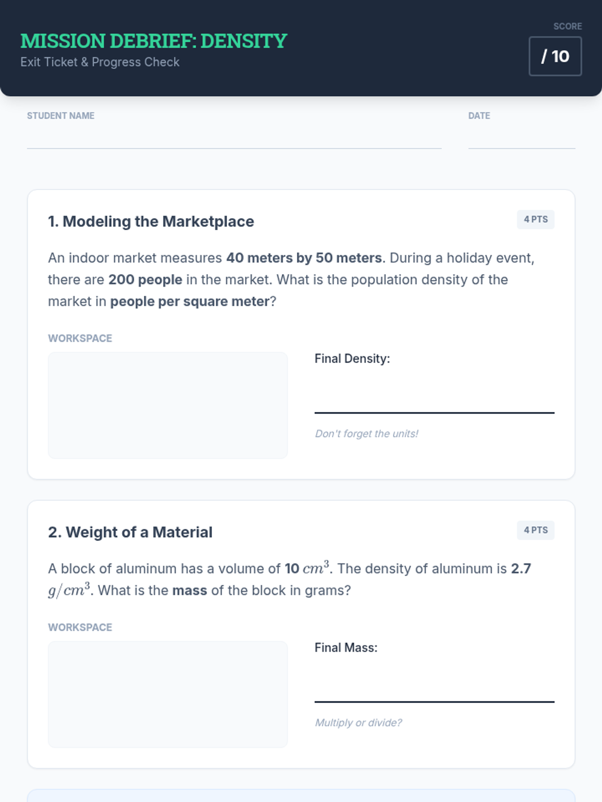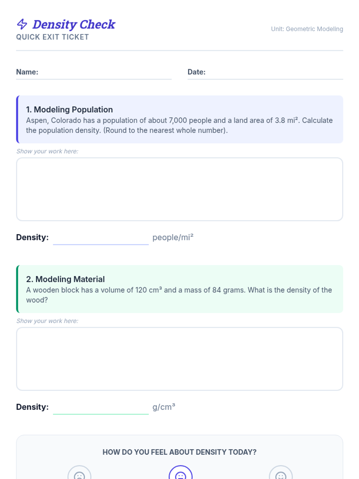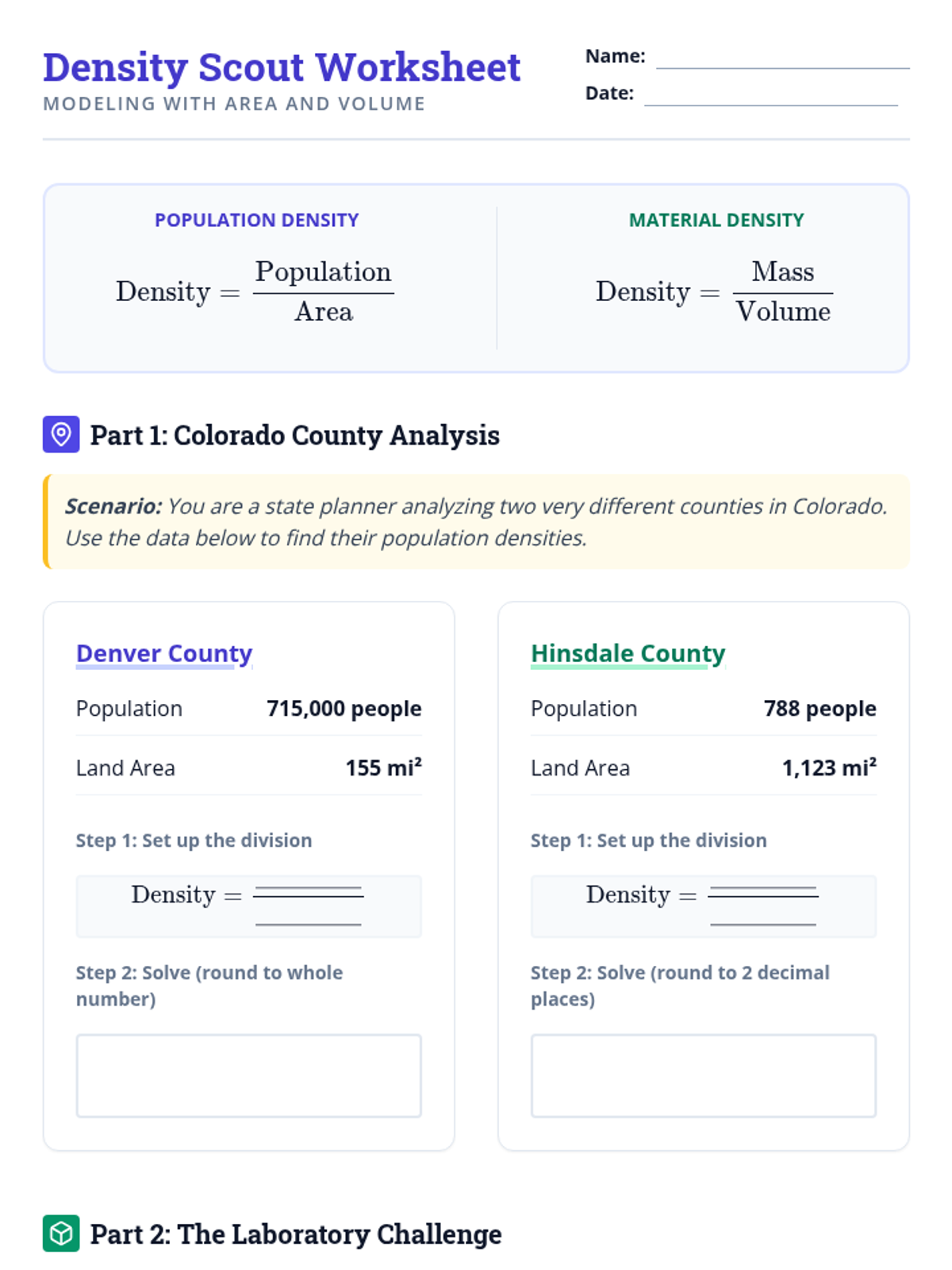 A Tier 2 intervention lesson focused on mastering density concepts using area and volume. Students will use modeling to solve real-world problems like population density and material mass.