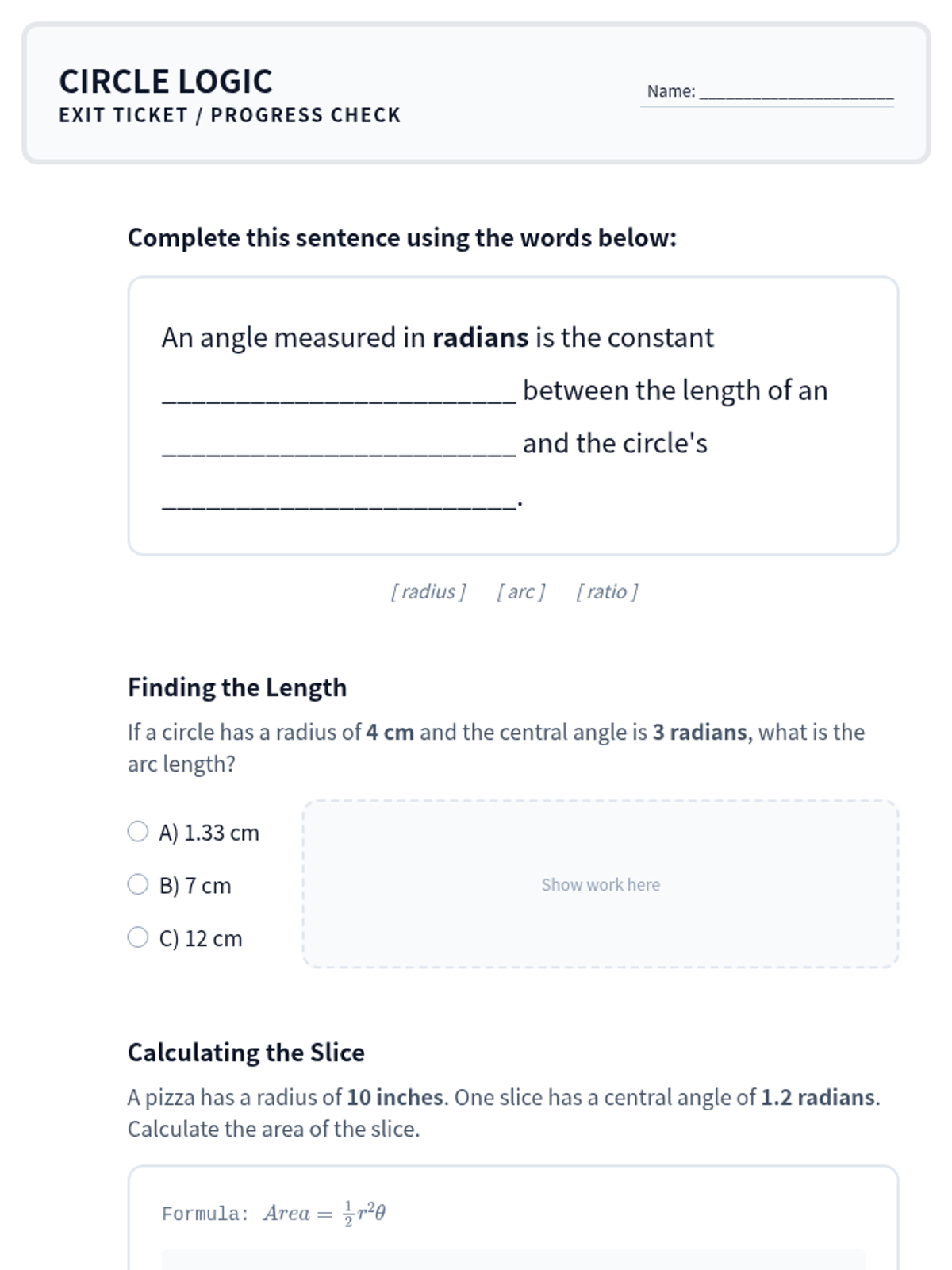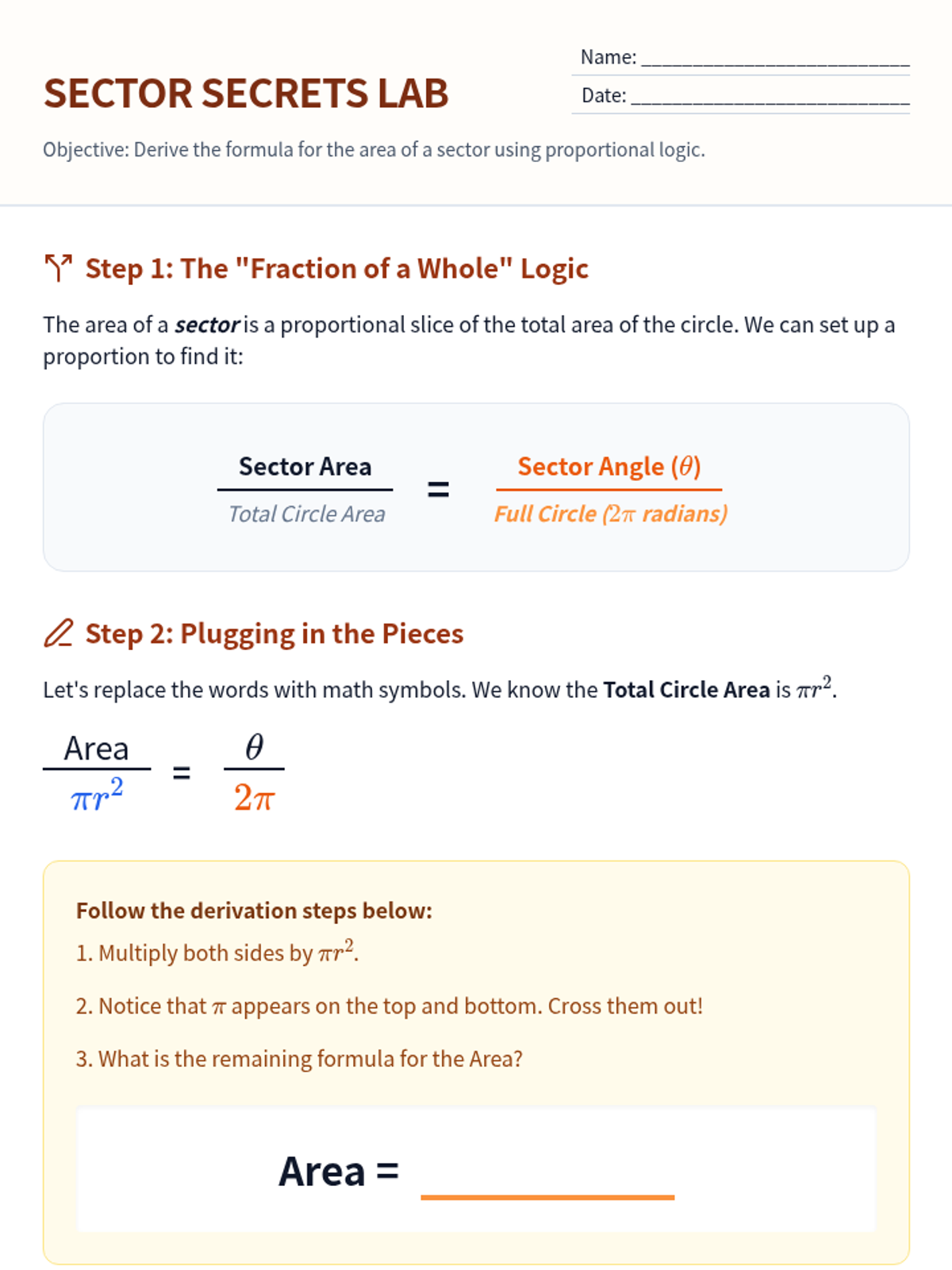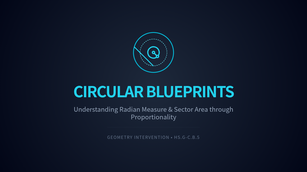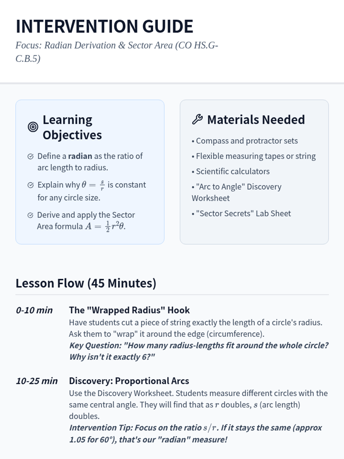 A targeted Tier 2 intervention lesson focusing on the derivation of radian measure and sector area through proportional reasoning and hands-on measurement concepts. Students explore why the ratio of arc length to radius is constant for a given angle and apply this to find areas of circular sectors.